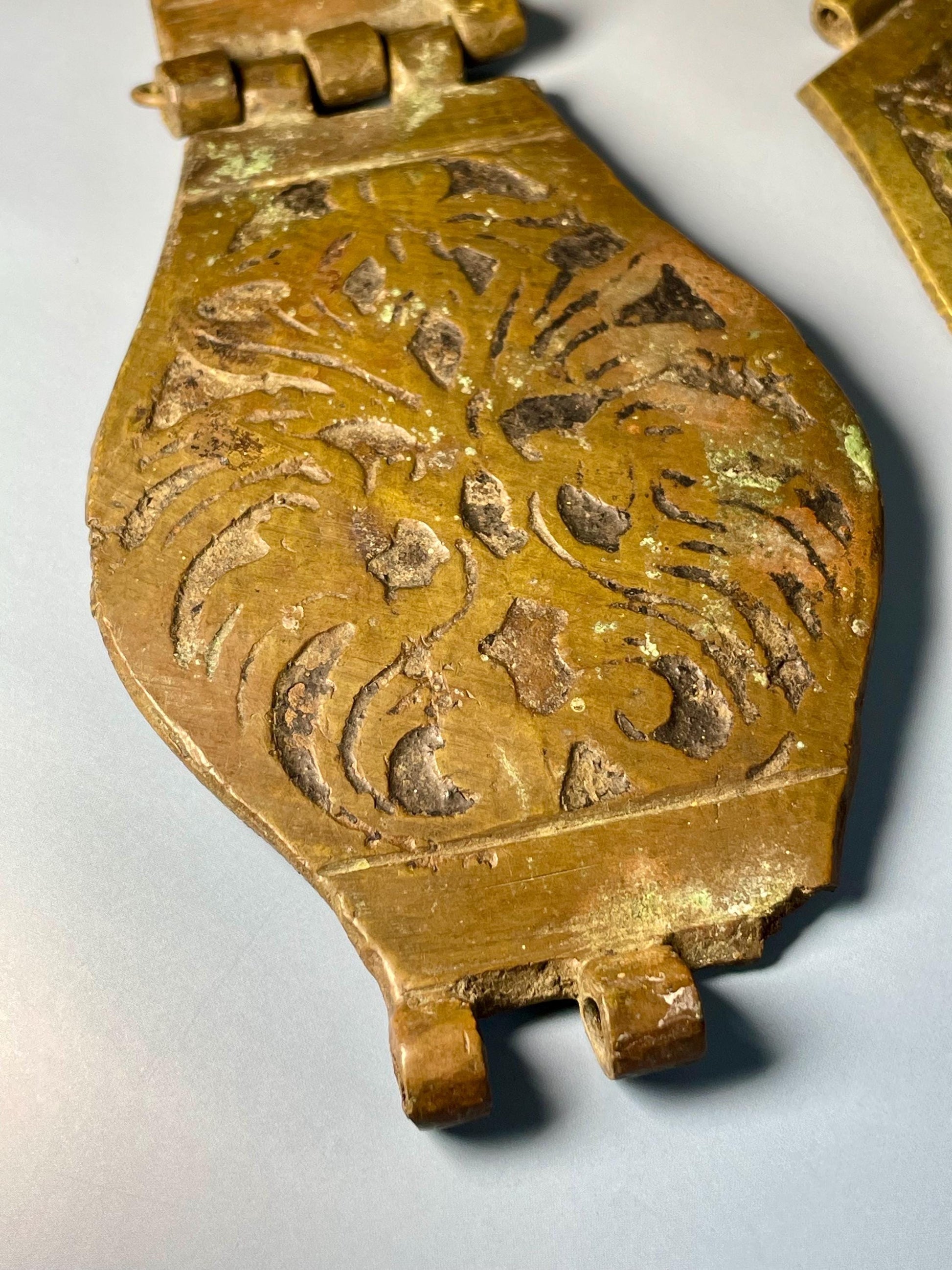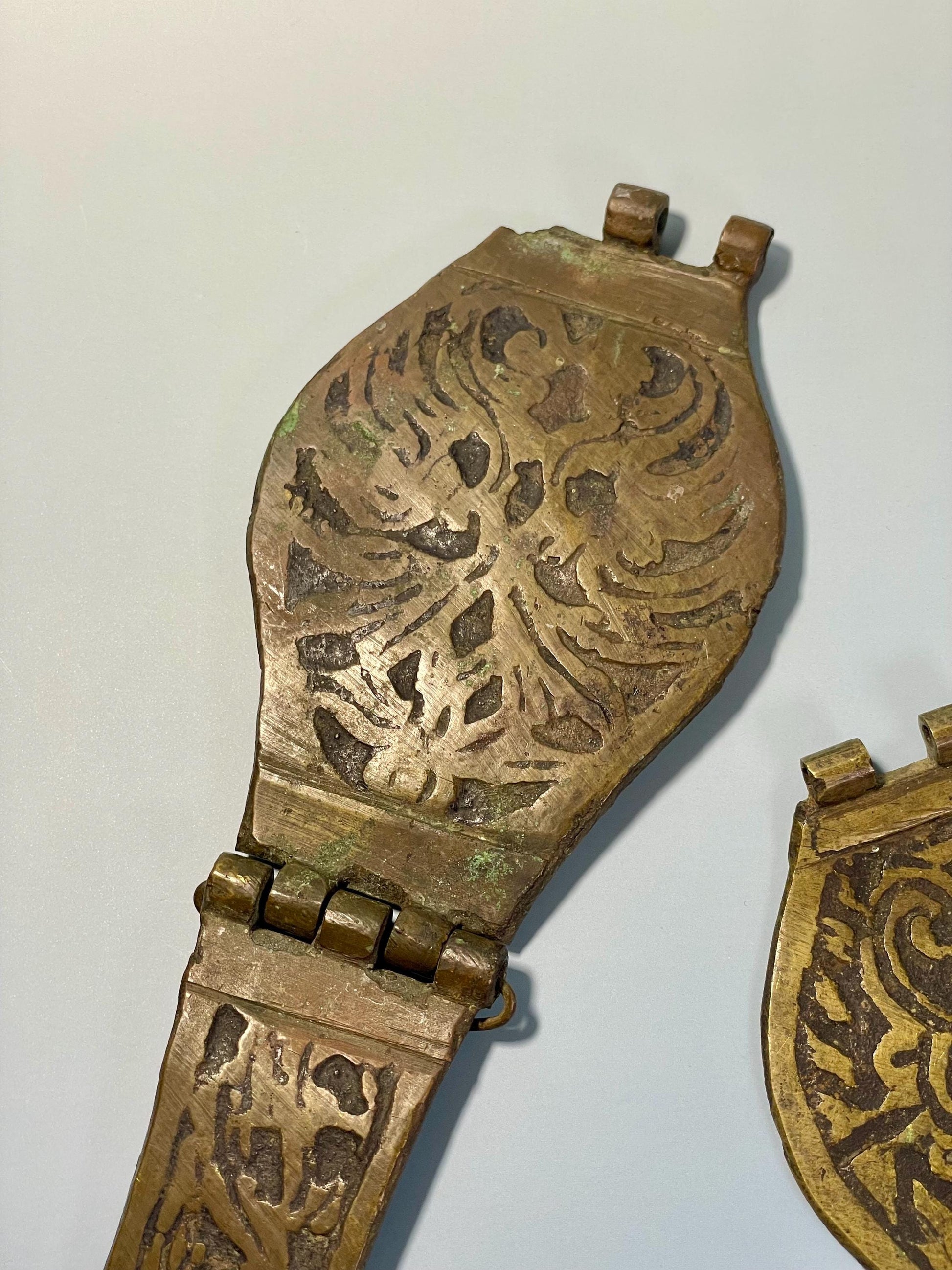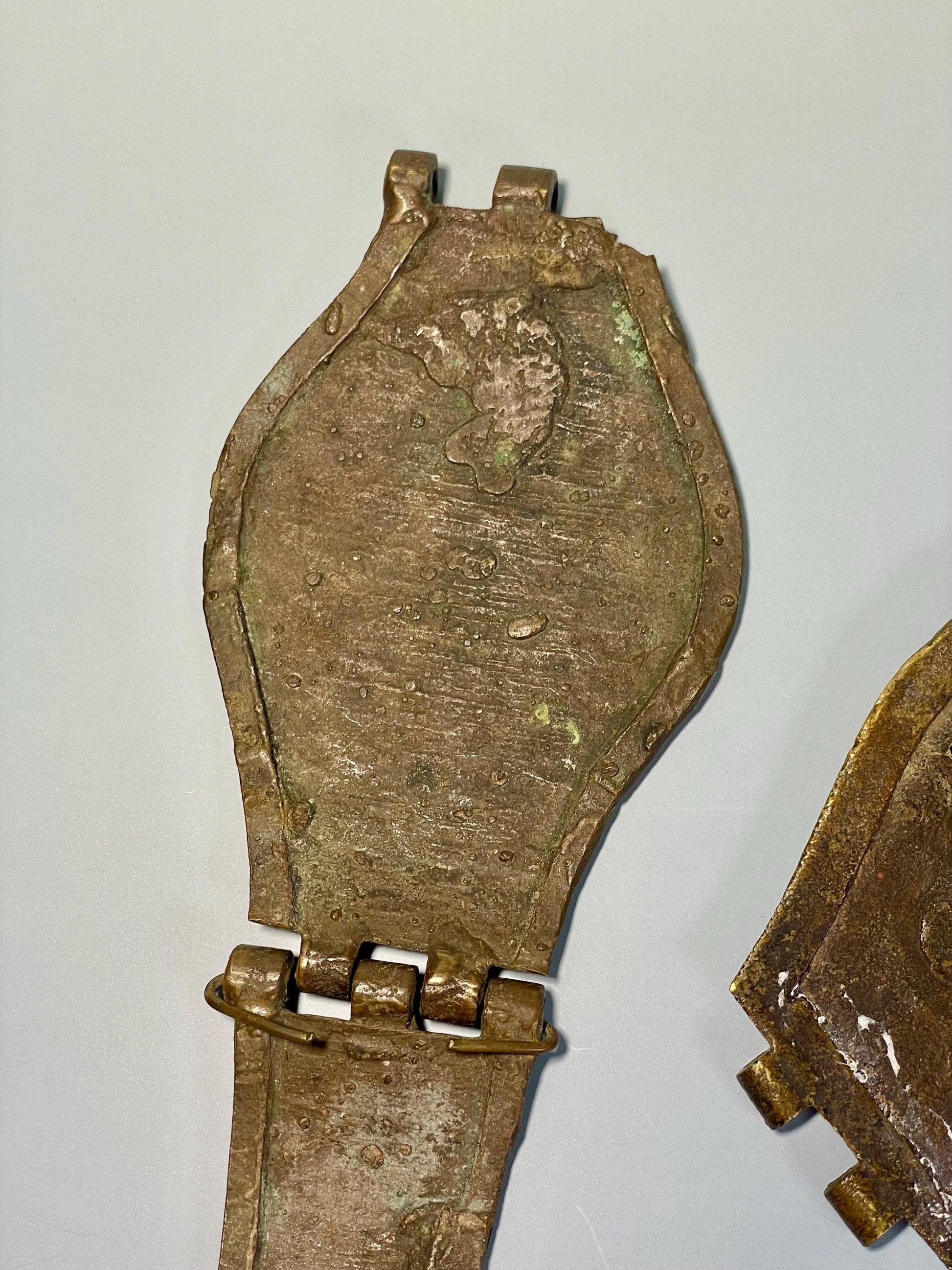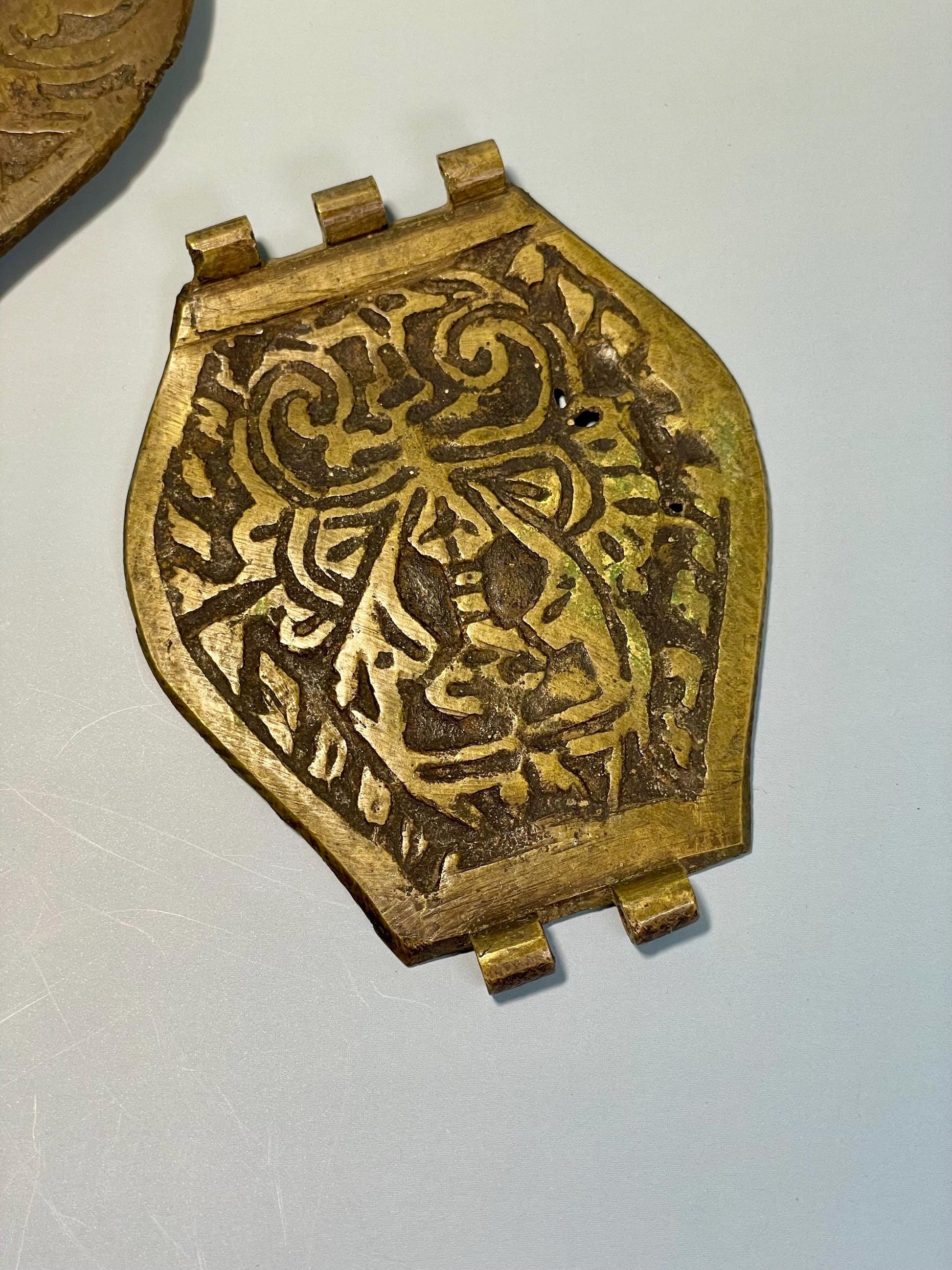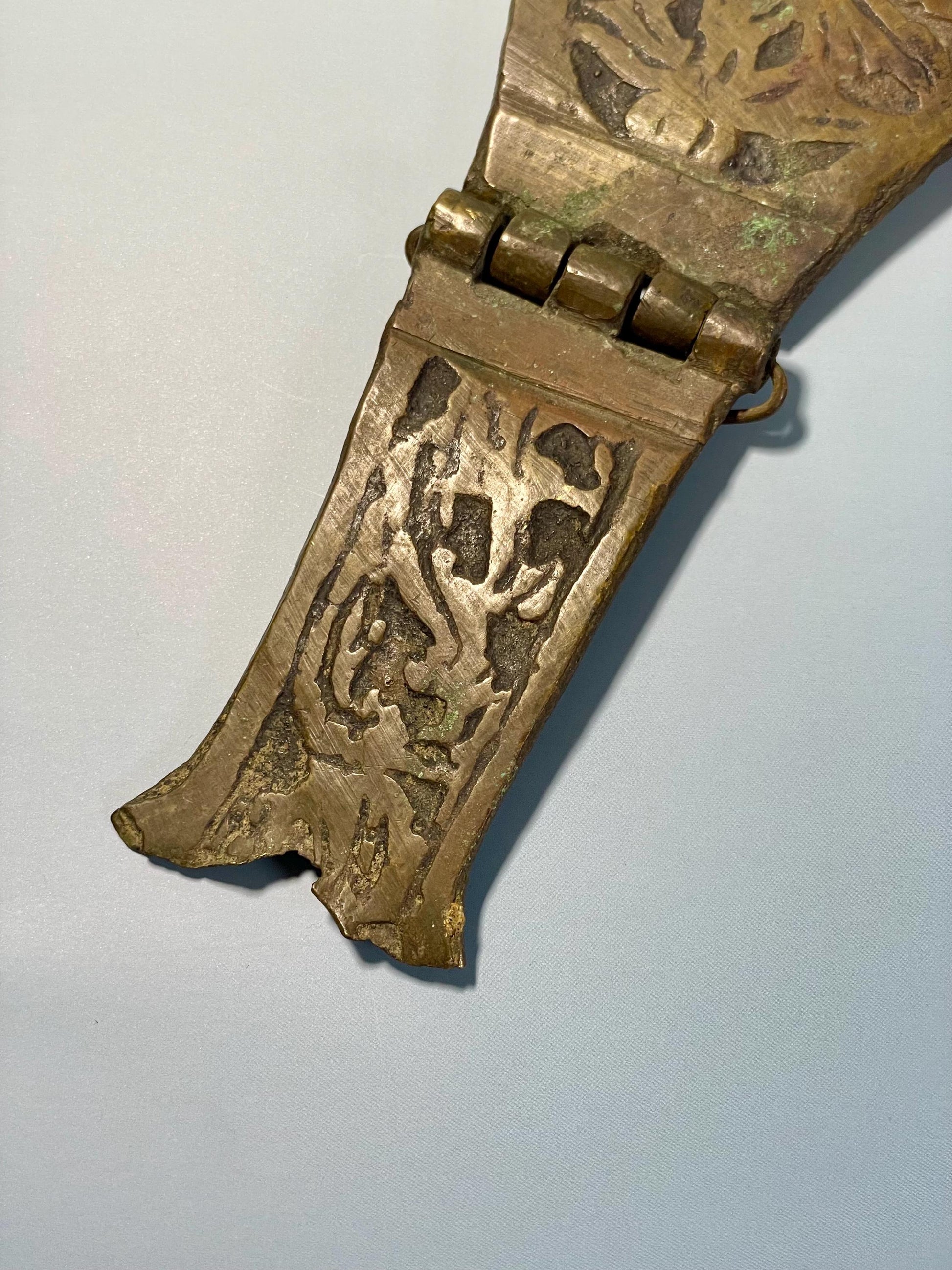 Lot of 2 Ancient Bronze Artifacts (4.24-8 inches) with Etched Design One Hinged