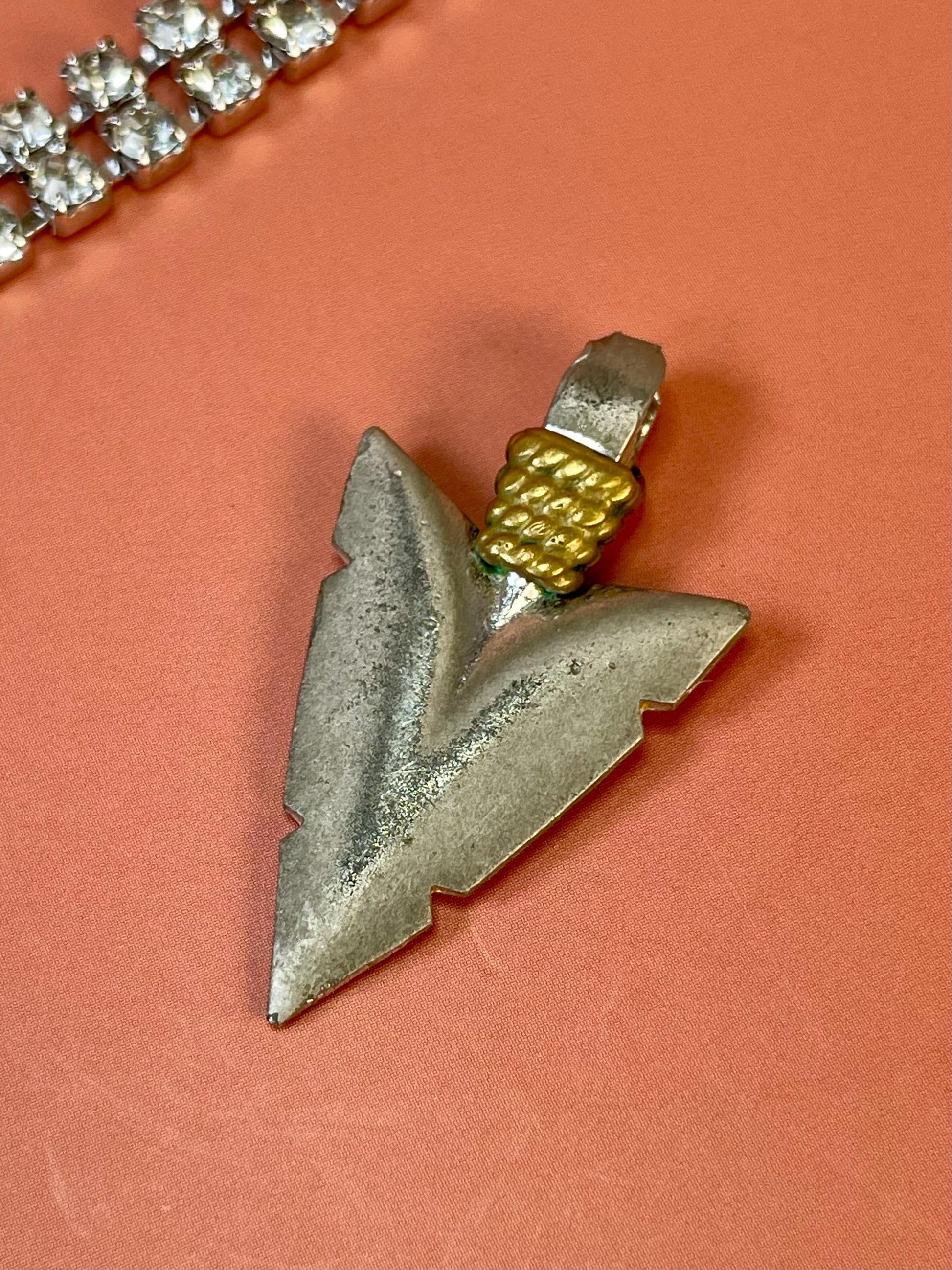 This lot includes a colourful parrot brooch, delicate dangle earrings, a bracelet and a metal arrowhead pendant. Bracelet has a couple gems missing and measures approximately 6.75 inches long unclasped.