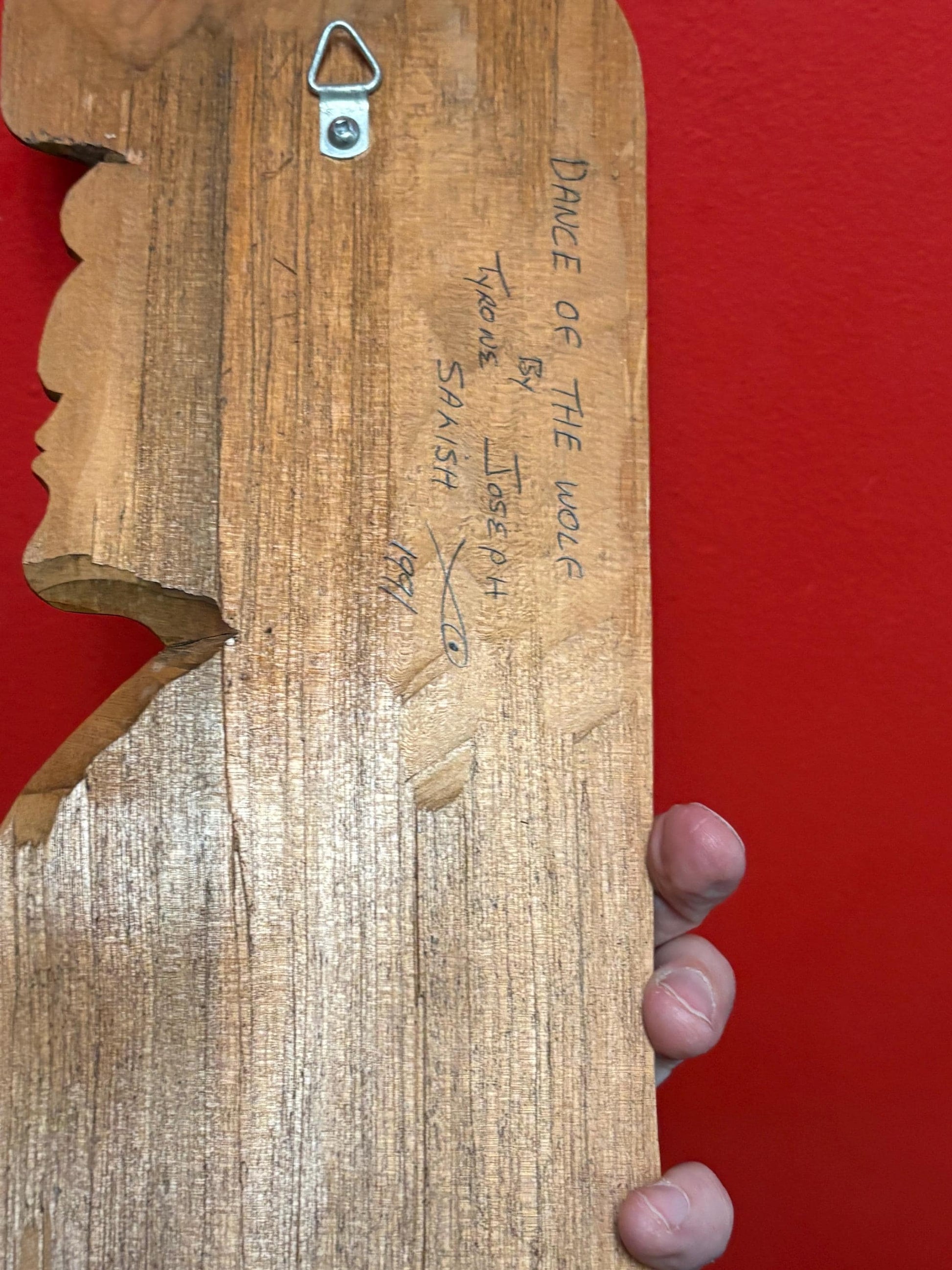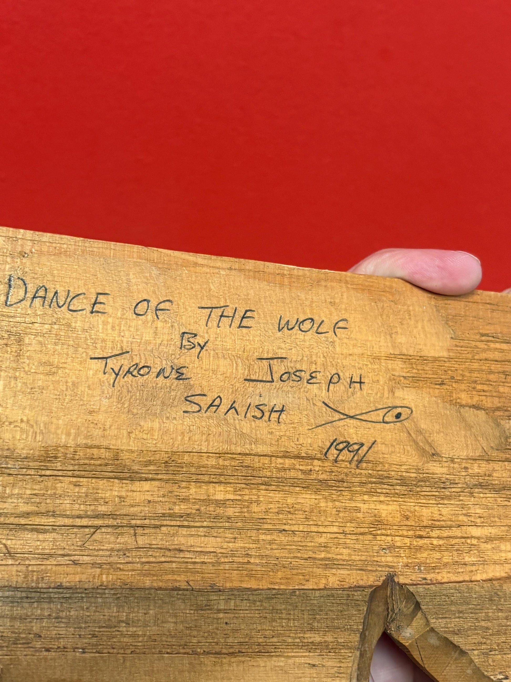 Lovely 11 x 5 inch wide indigenous first nations Pacific Northwest Coast Tyrone Joseph Dance of the Wolf plaque - wonderful detail