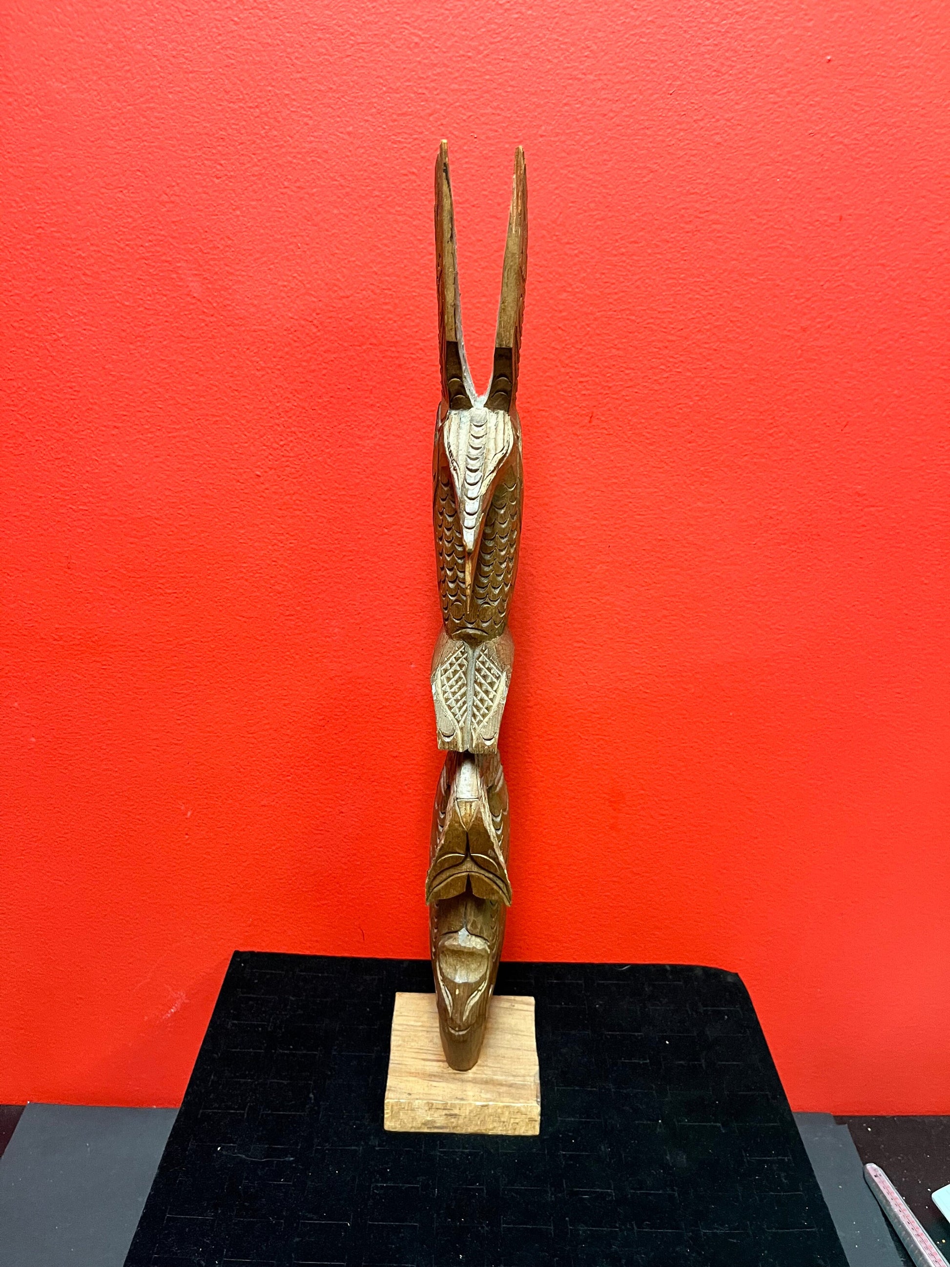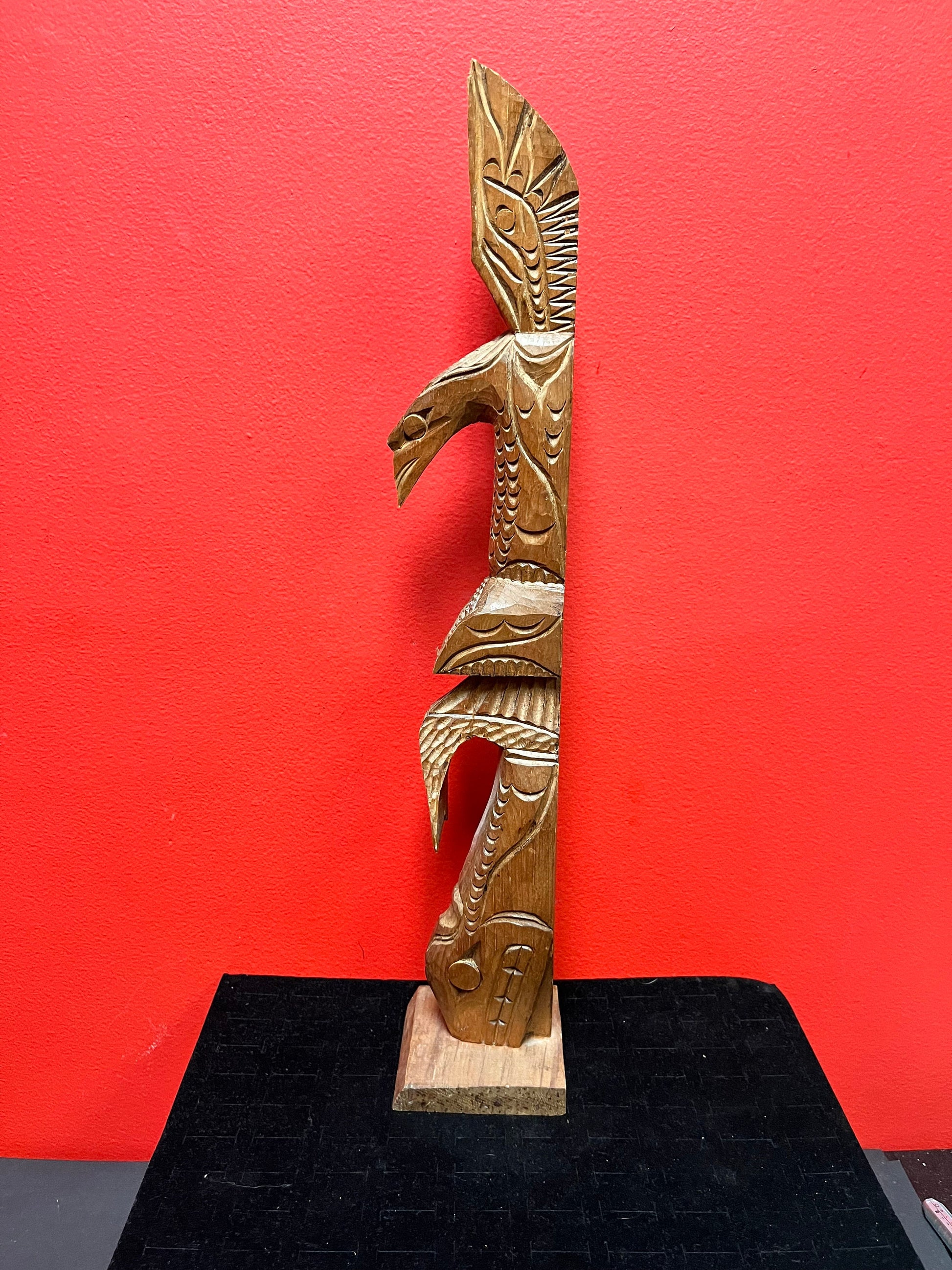 Lovely 19 inch tall indigenous first nations northwest coast signed Chris John transformation totem pole slight as is