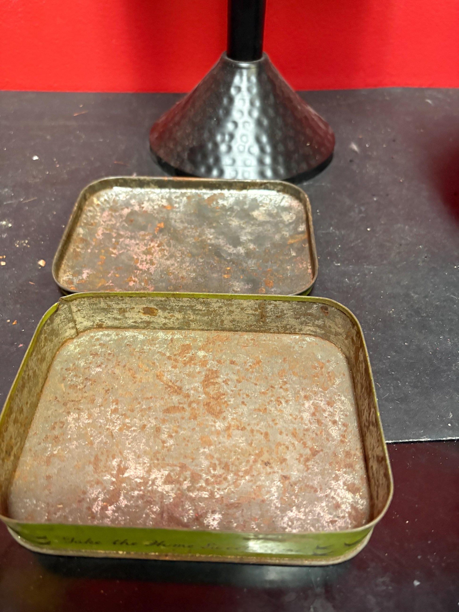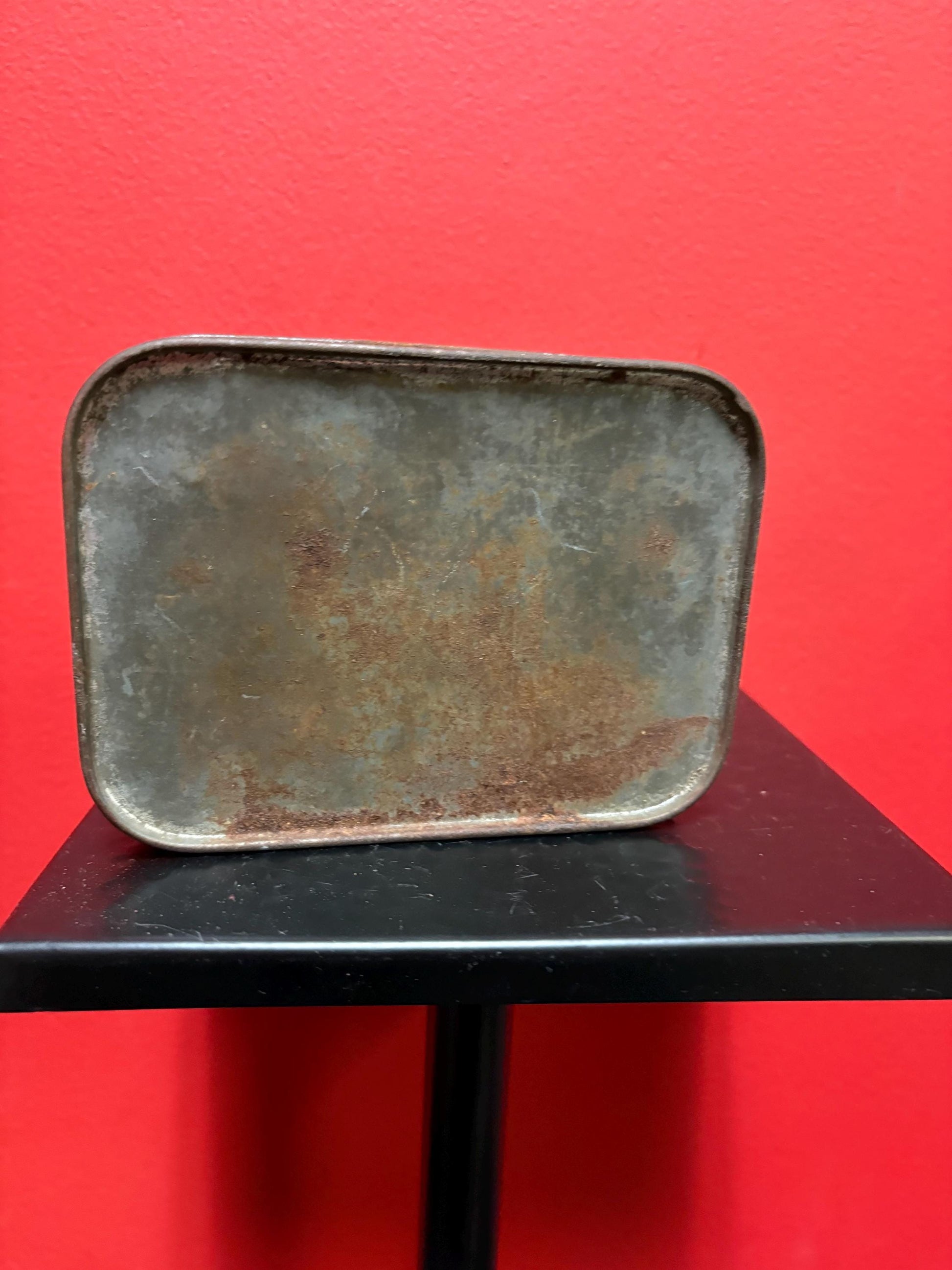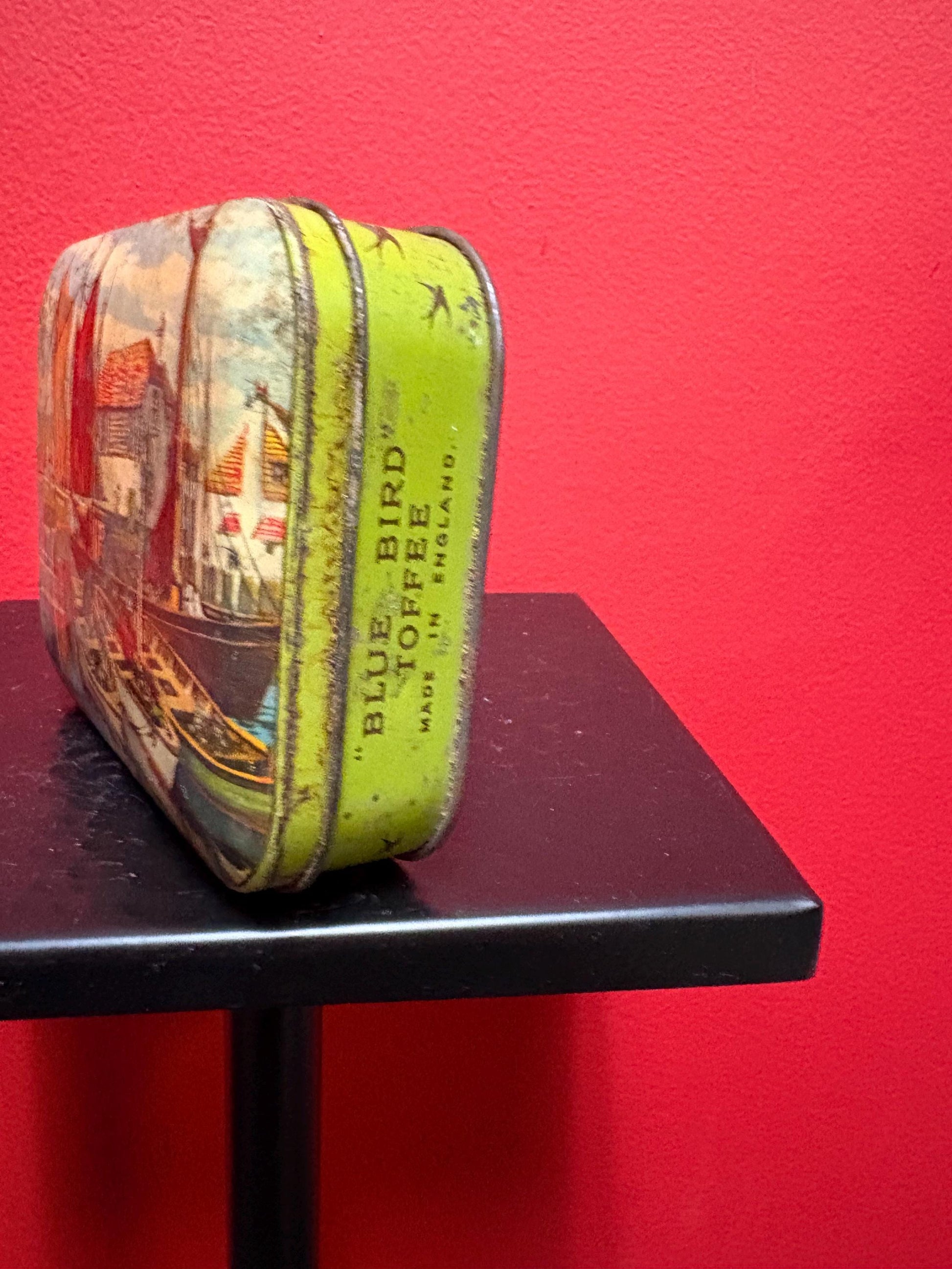 Lovely 5 1/2 x 4 x 1.25” high antique toffee tin with boats scene — old used condition