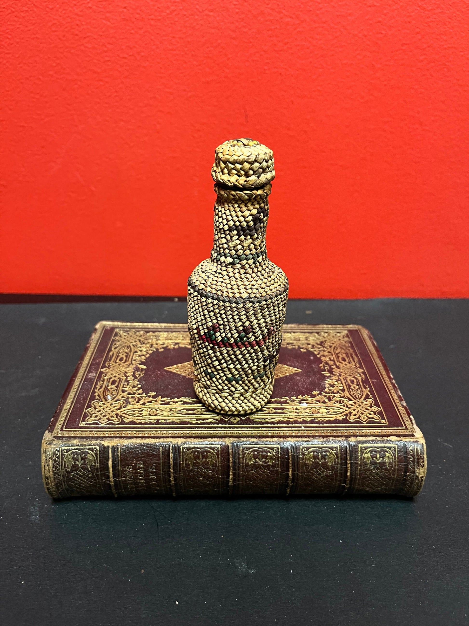 Lovely 5 inch high indigenous, first nations pacific northwest coast woven covered bottle with hunting scene mint condition