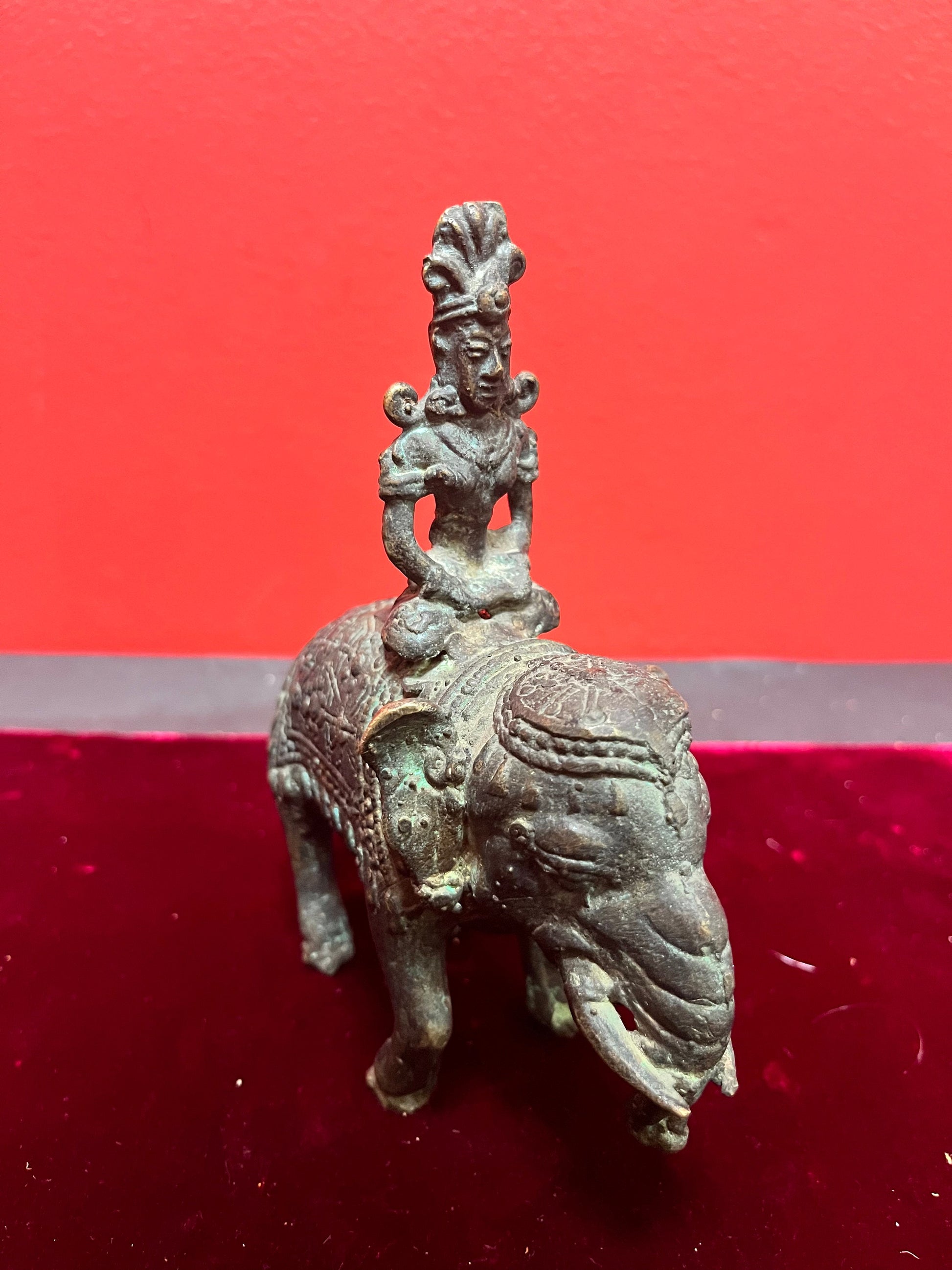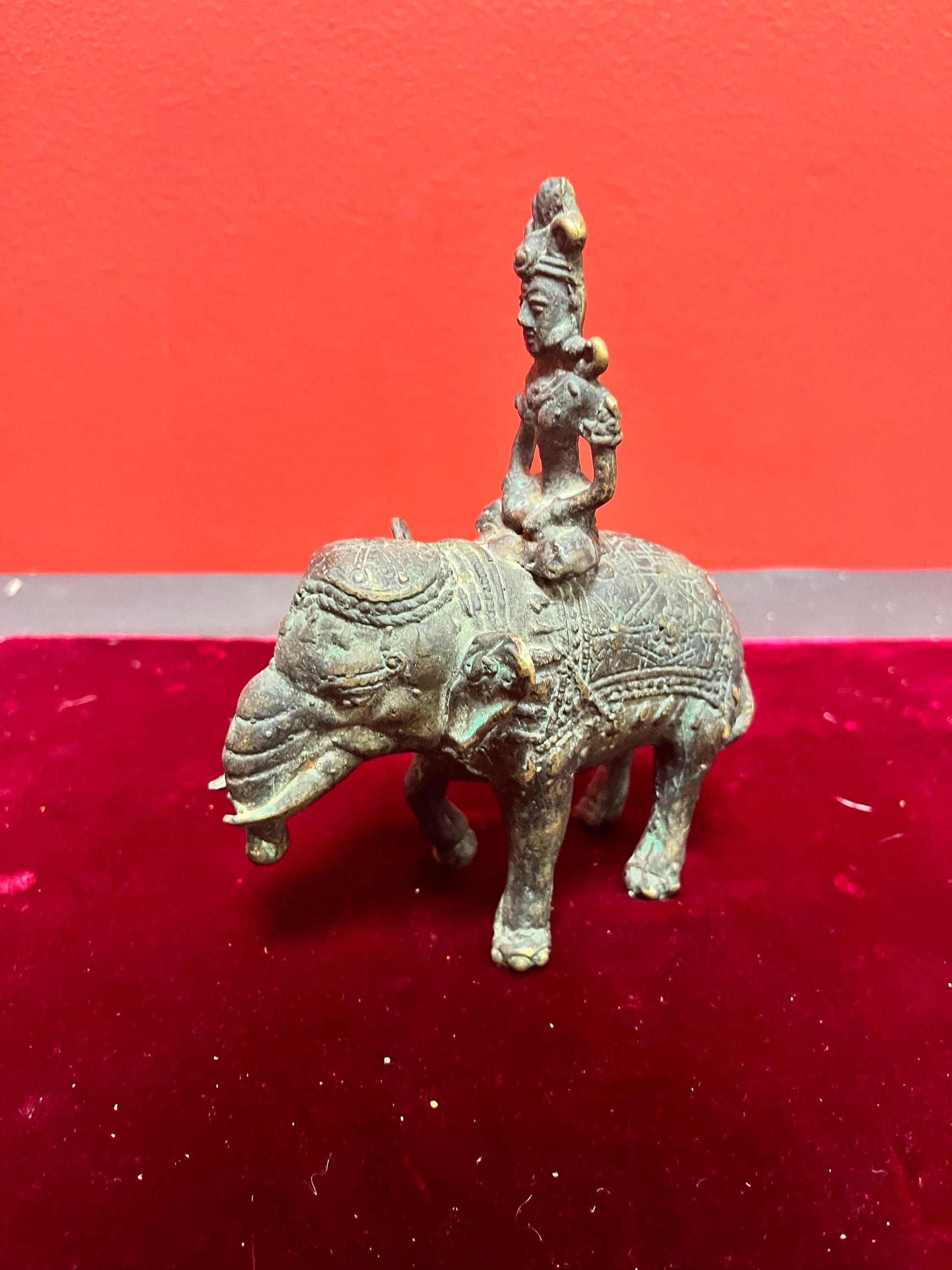 Lovely 5 x 6 high antique Indian bronze goddess on elephant Great Patina.