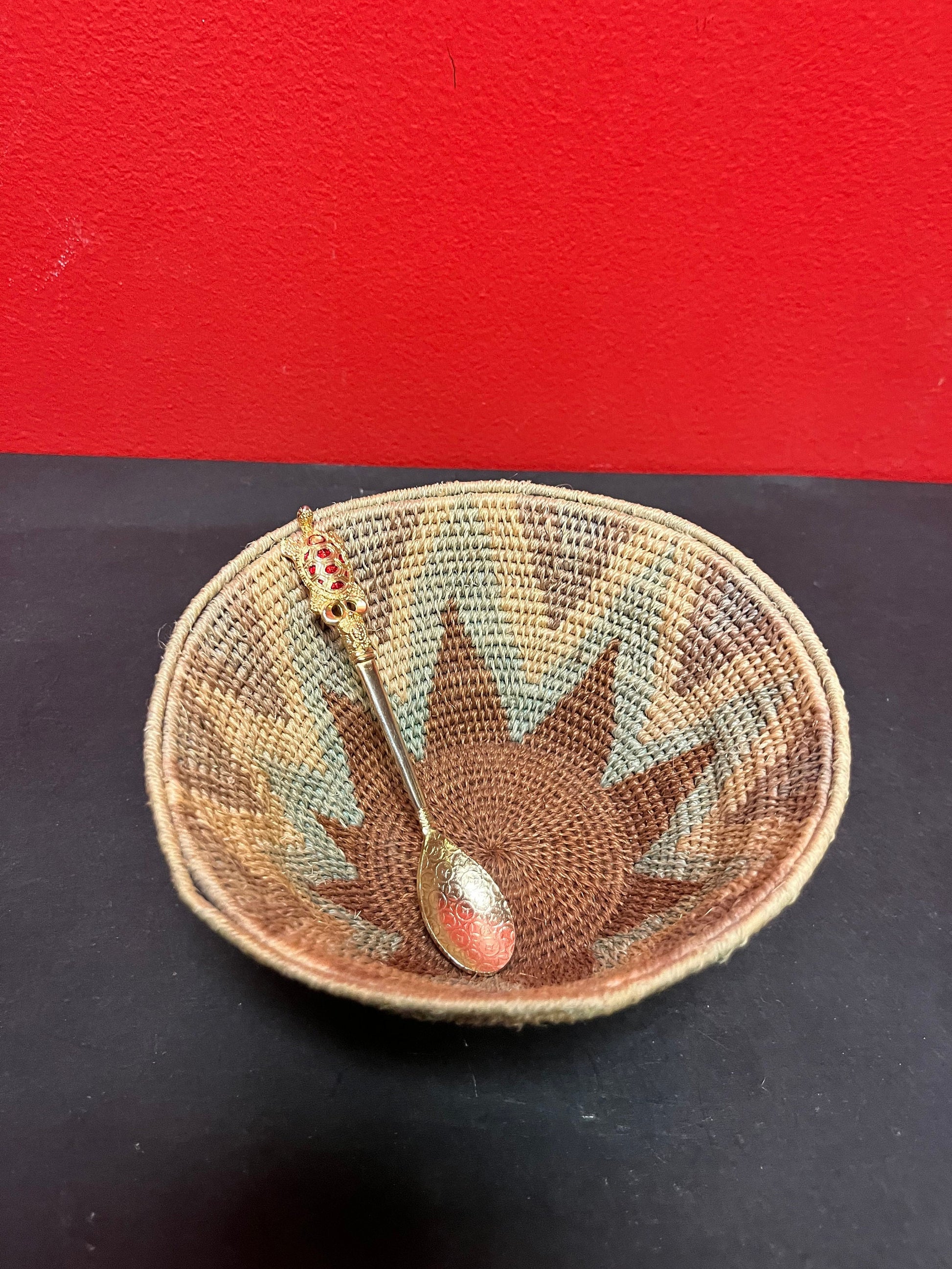 Lovely 6 x 3 vintage African woven basket with a Gilded and enamel turtle spoon lovely combo for gifts etc