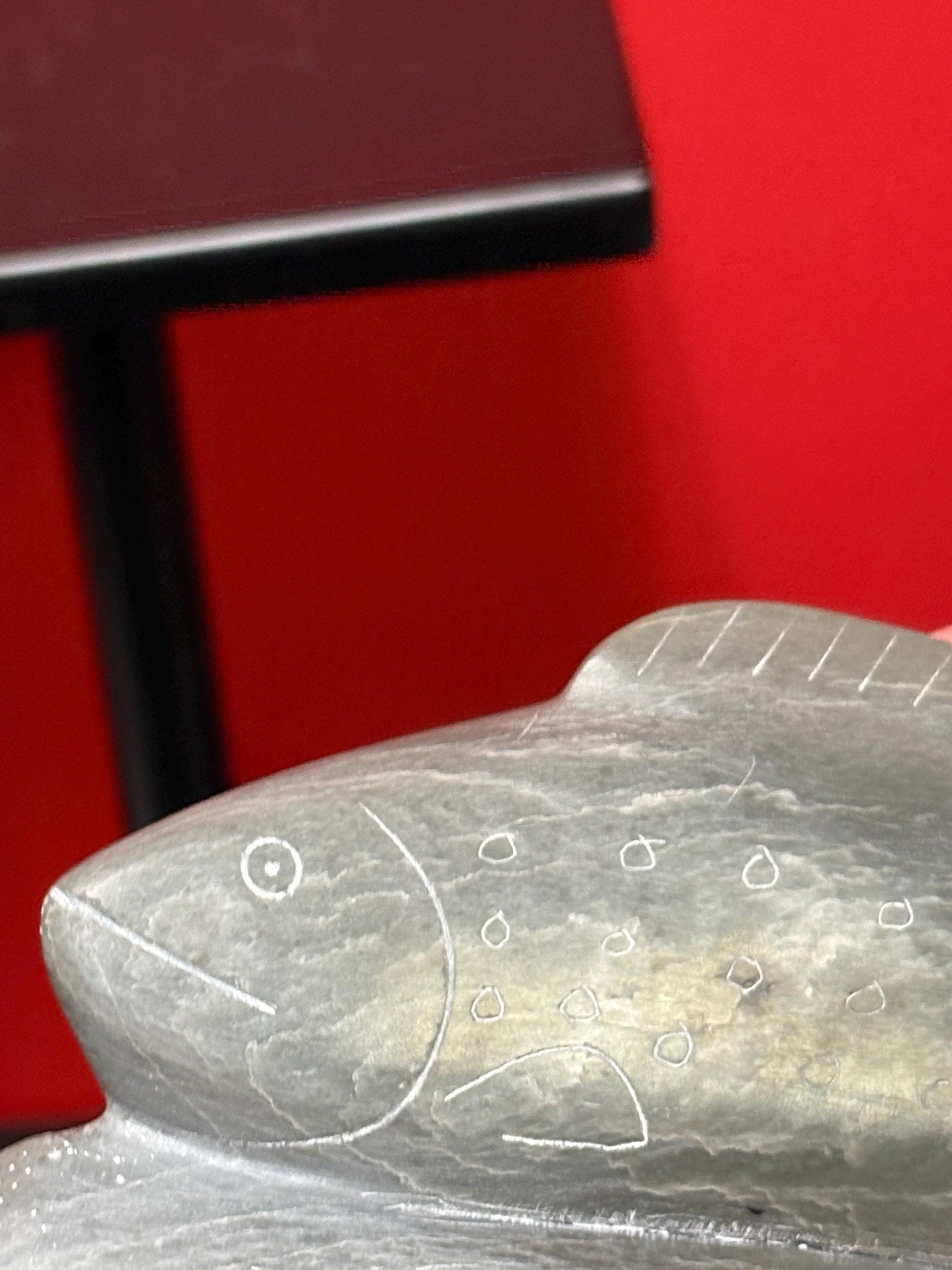 Lovely 7 x 3 high indigenous Inuit soapstone signed salmon chip on tail good value