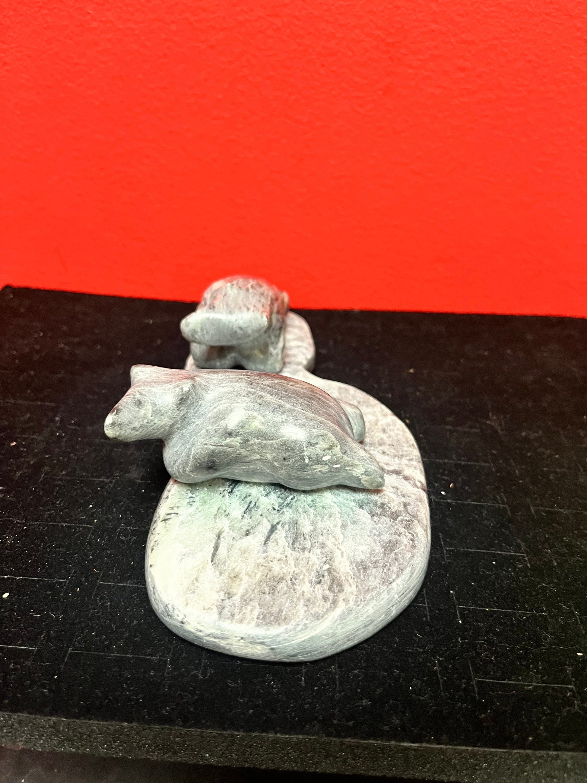 Lovely 7 x 3 x 2 high indigenous inuit soapstone bears playing in a pond lovely condition