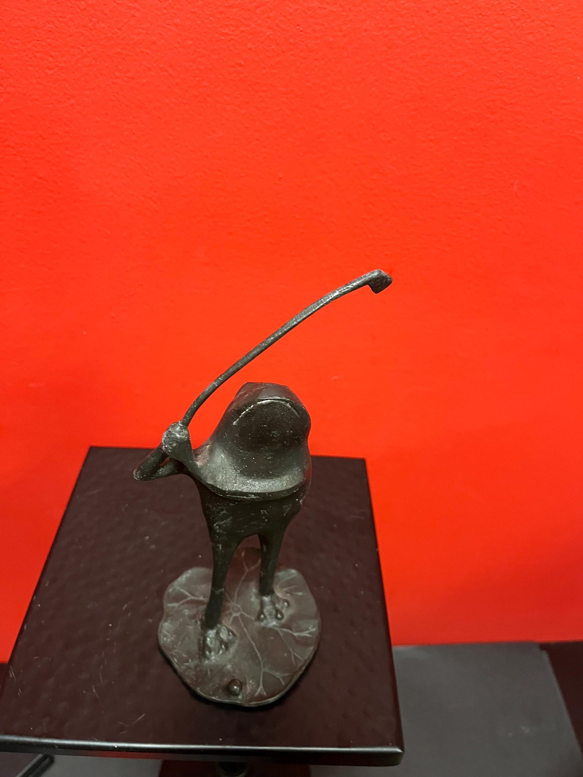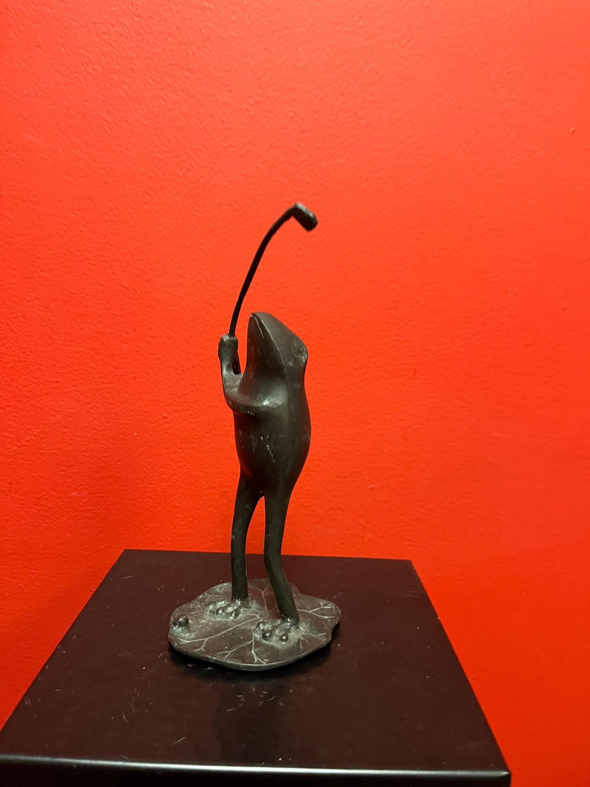 Lovely 8 inch tall bronze frog golfing statue great patina wonderful gift