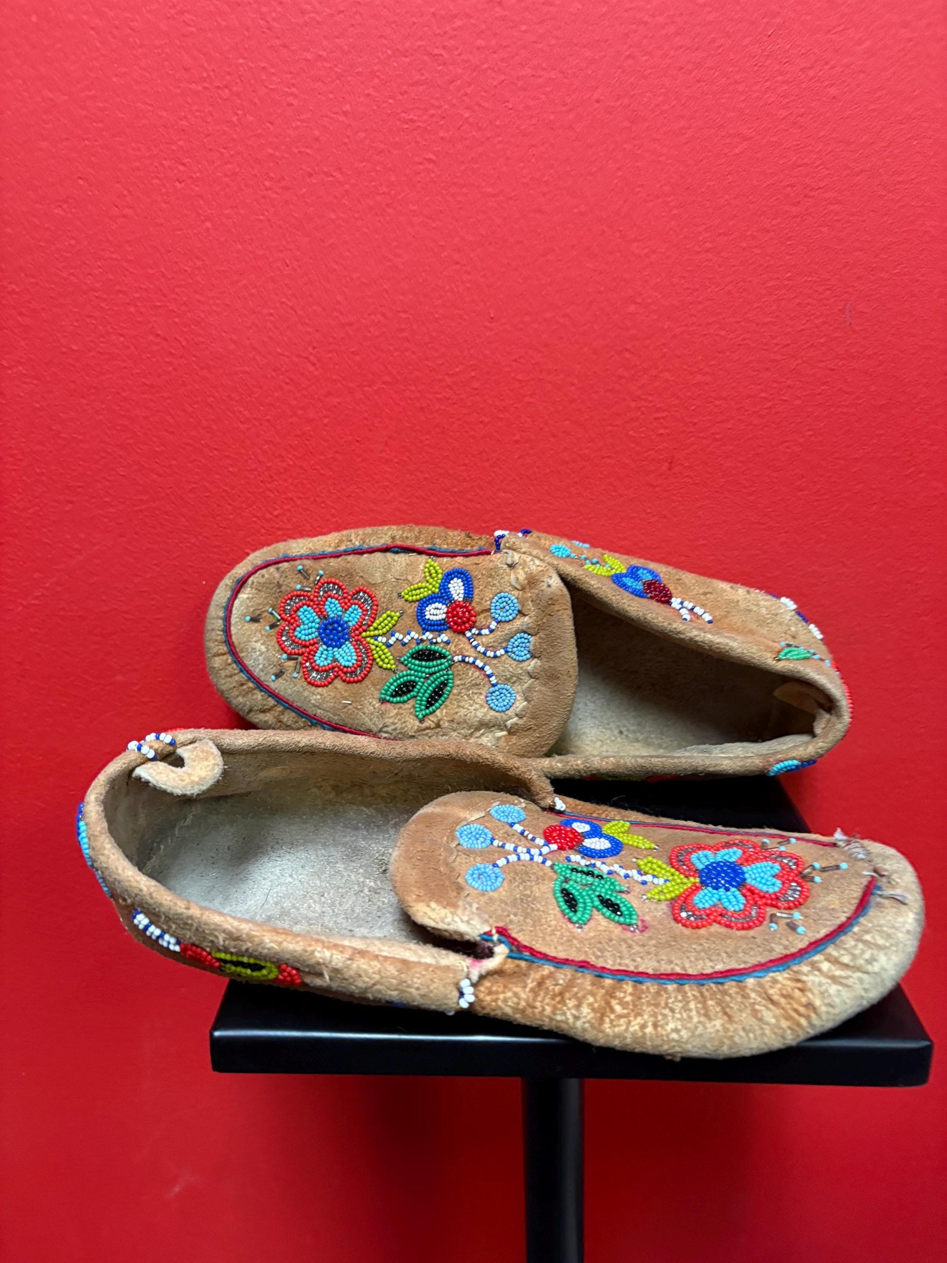Lovely 9 1/2 x 3 1/2 x 2 1/2 high indigenous first nation Cree coast leather and beaded moccasins antique beauties