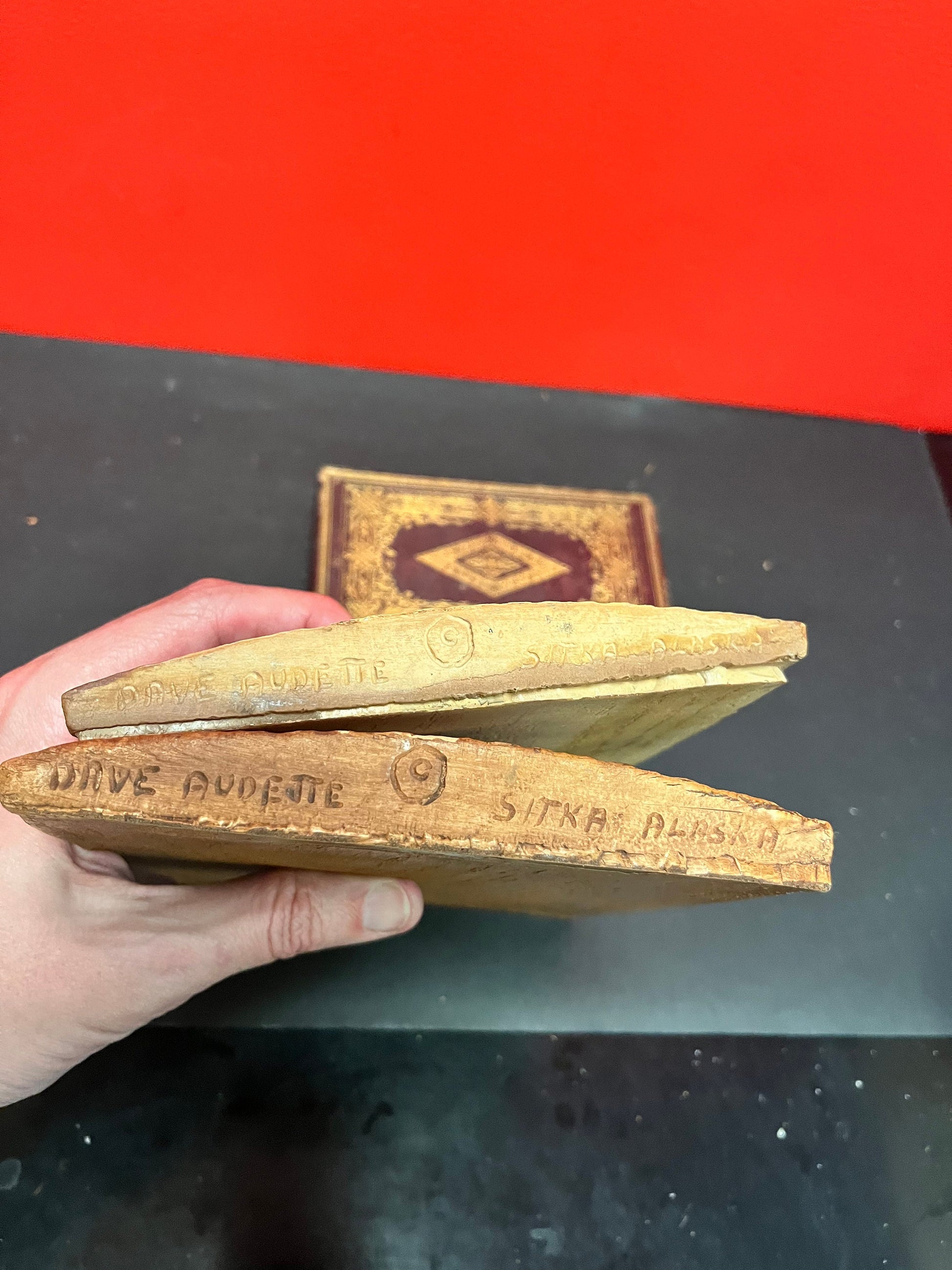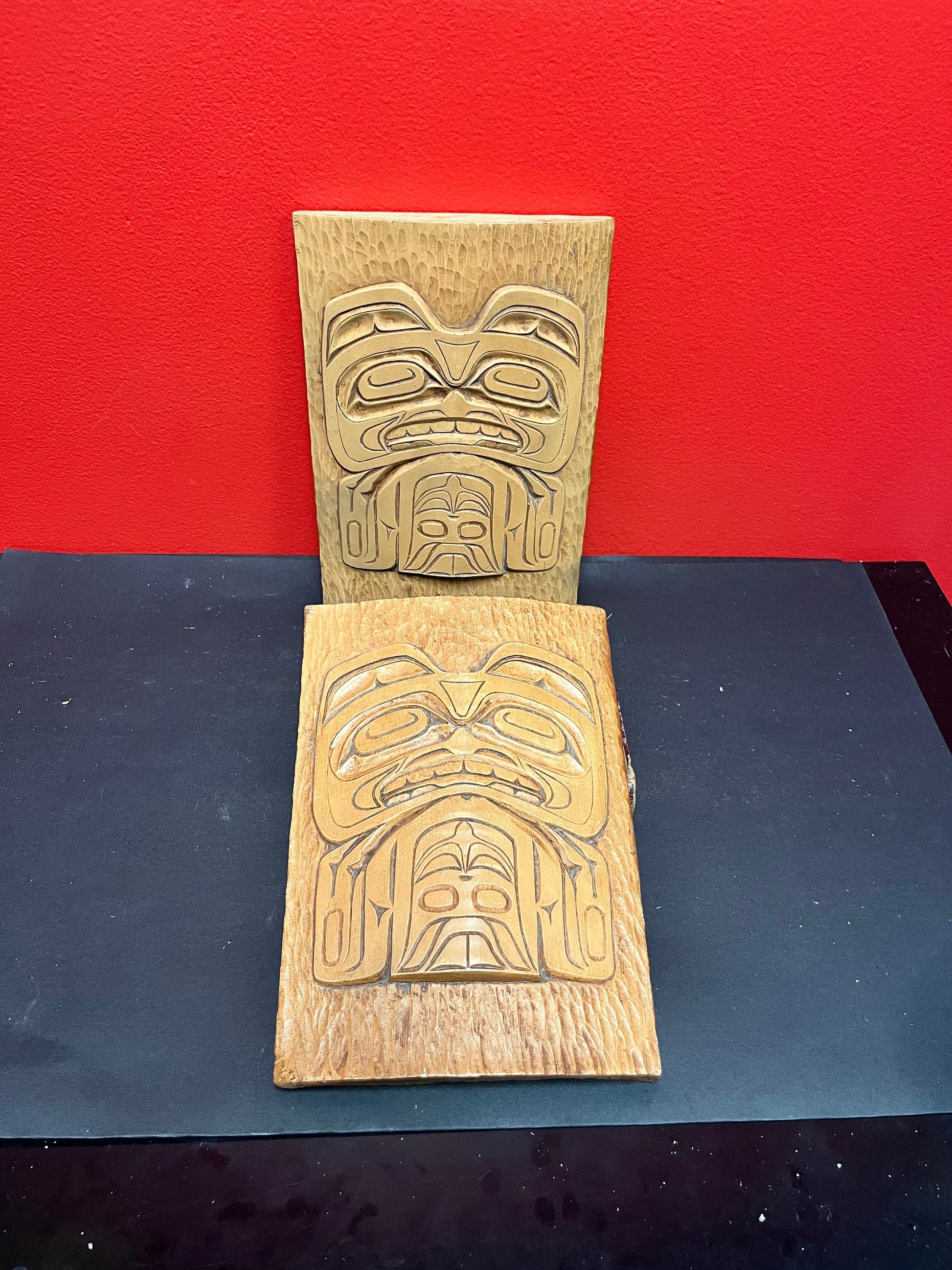 Lovely 9 by 7.5 by .5 inch cedar Indigenous first nations, Alaskan signed transformation plaque - two available - need hanger