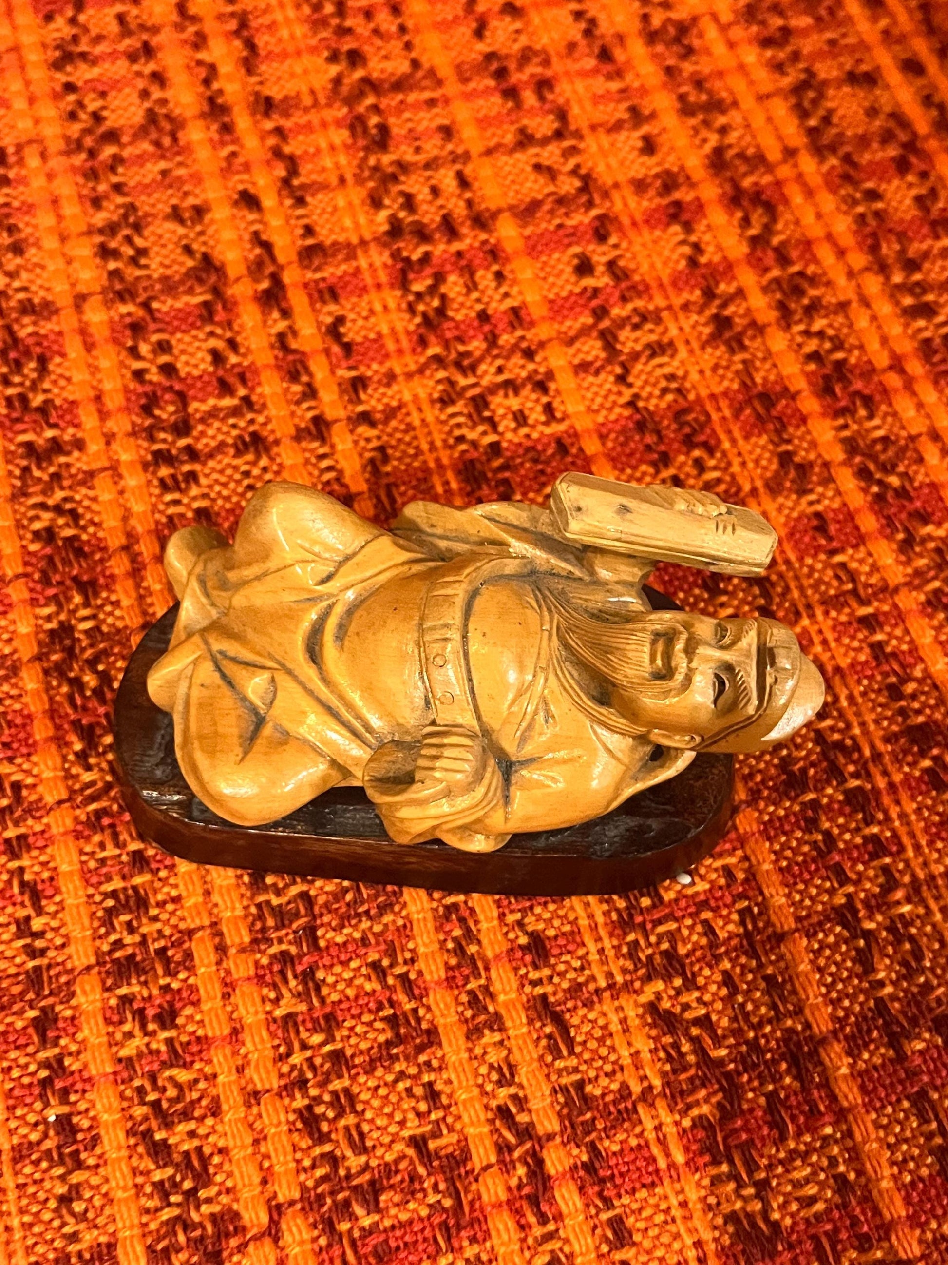 Lovely antique Chinese 4 inch long boxwood Carved Confucius on stand