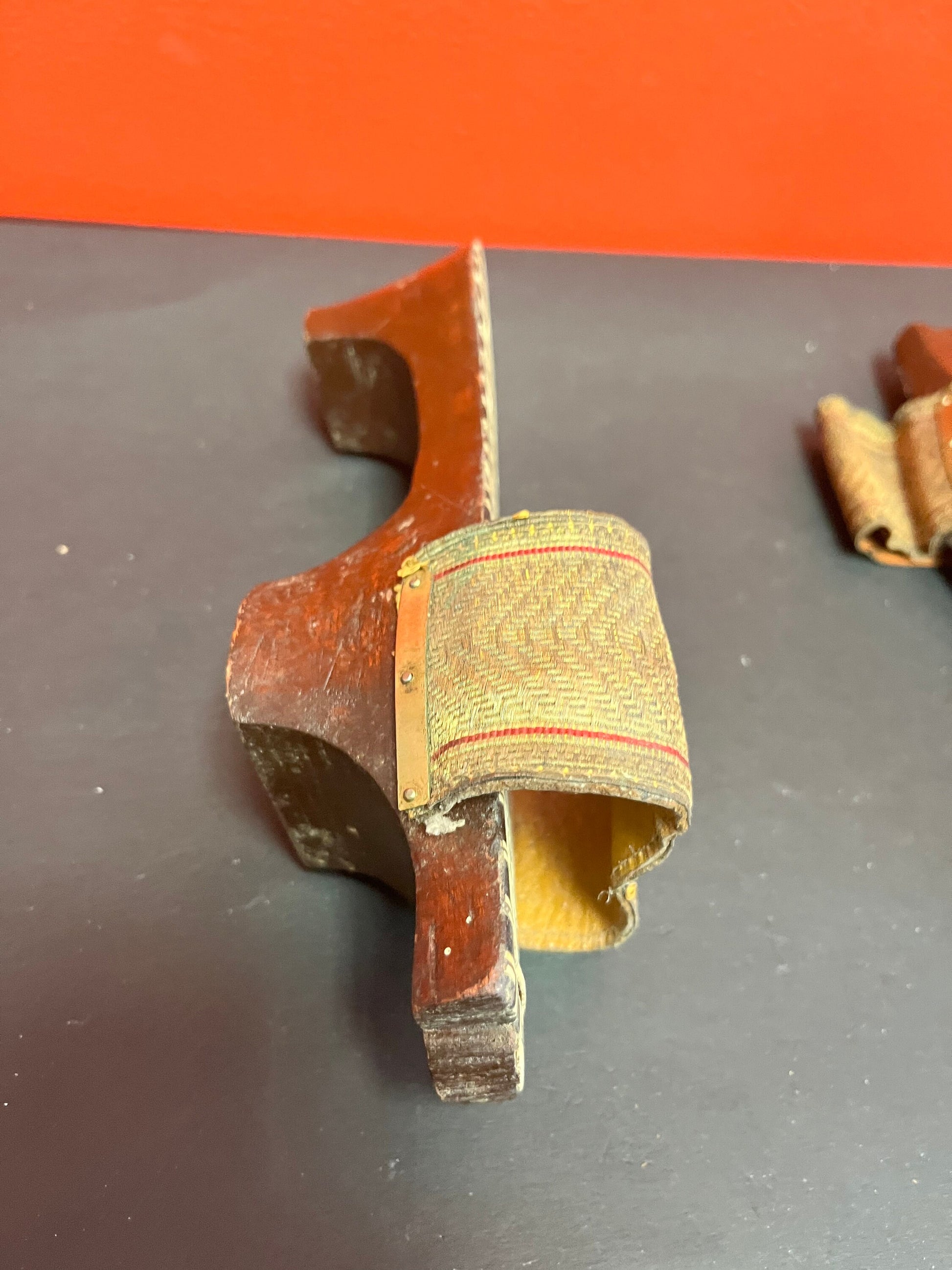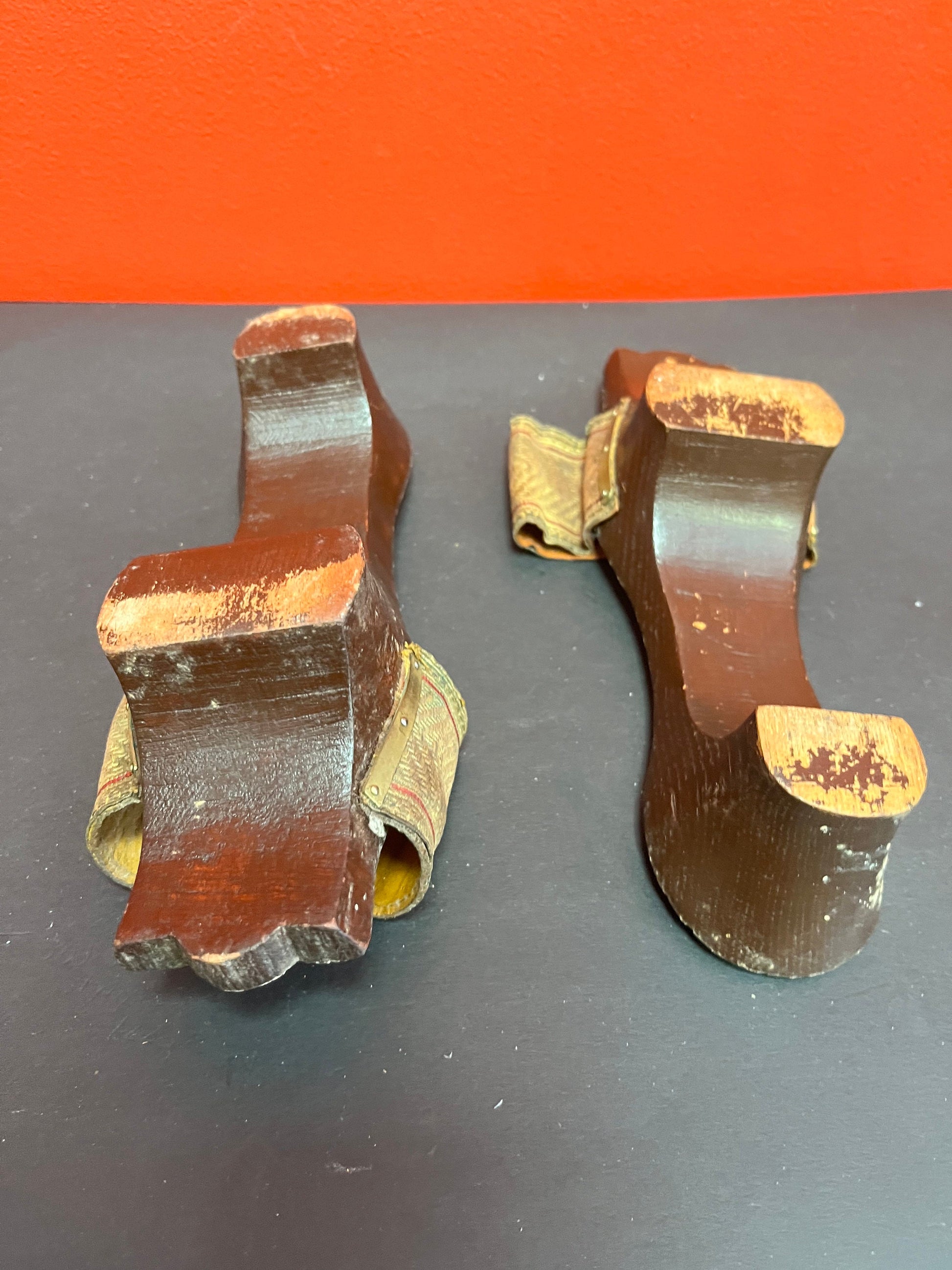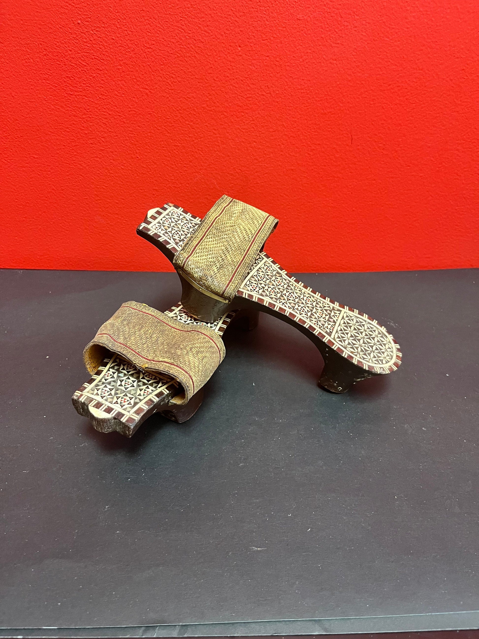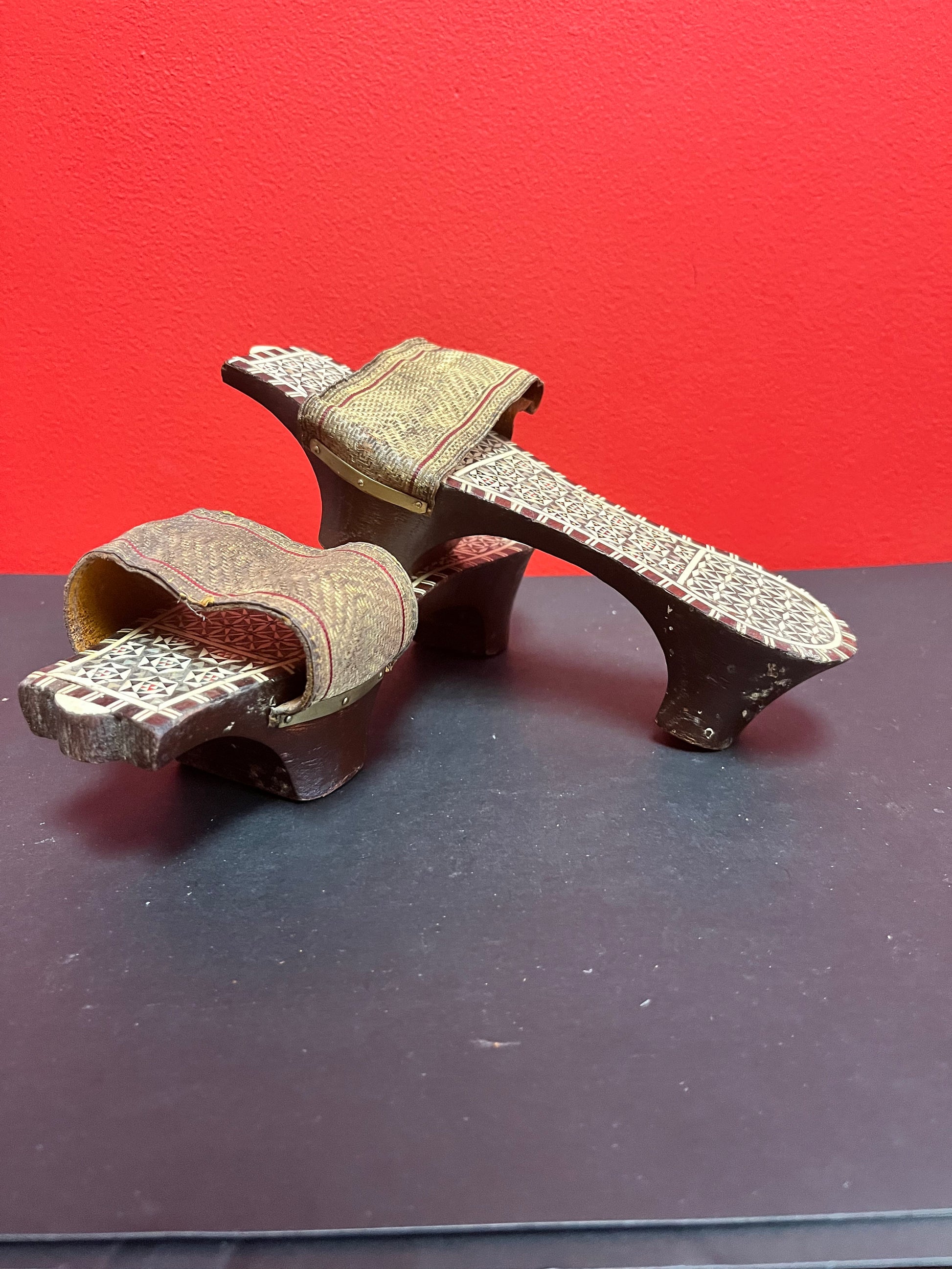 Lovely antique Indian 9 inch wood mother-of-pearl bone and leather shoes