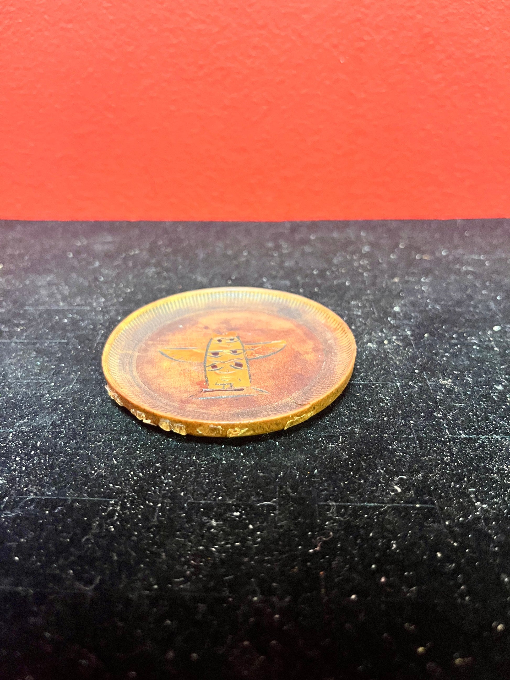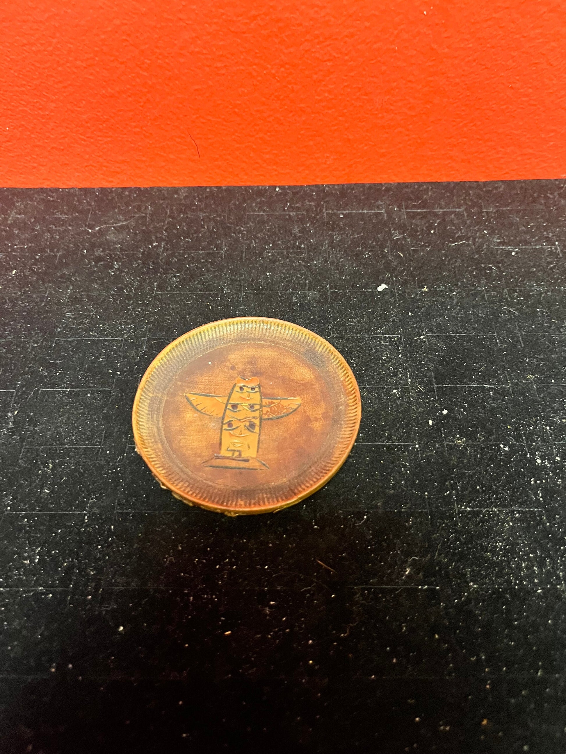 Lovely antique indigenous, first nations Pacific northwest coast wooden pin dish with totem crusty edges great price 3 inches
