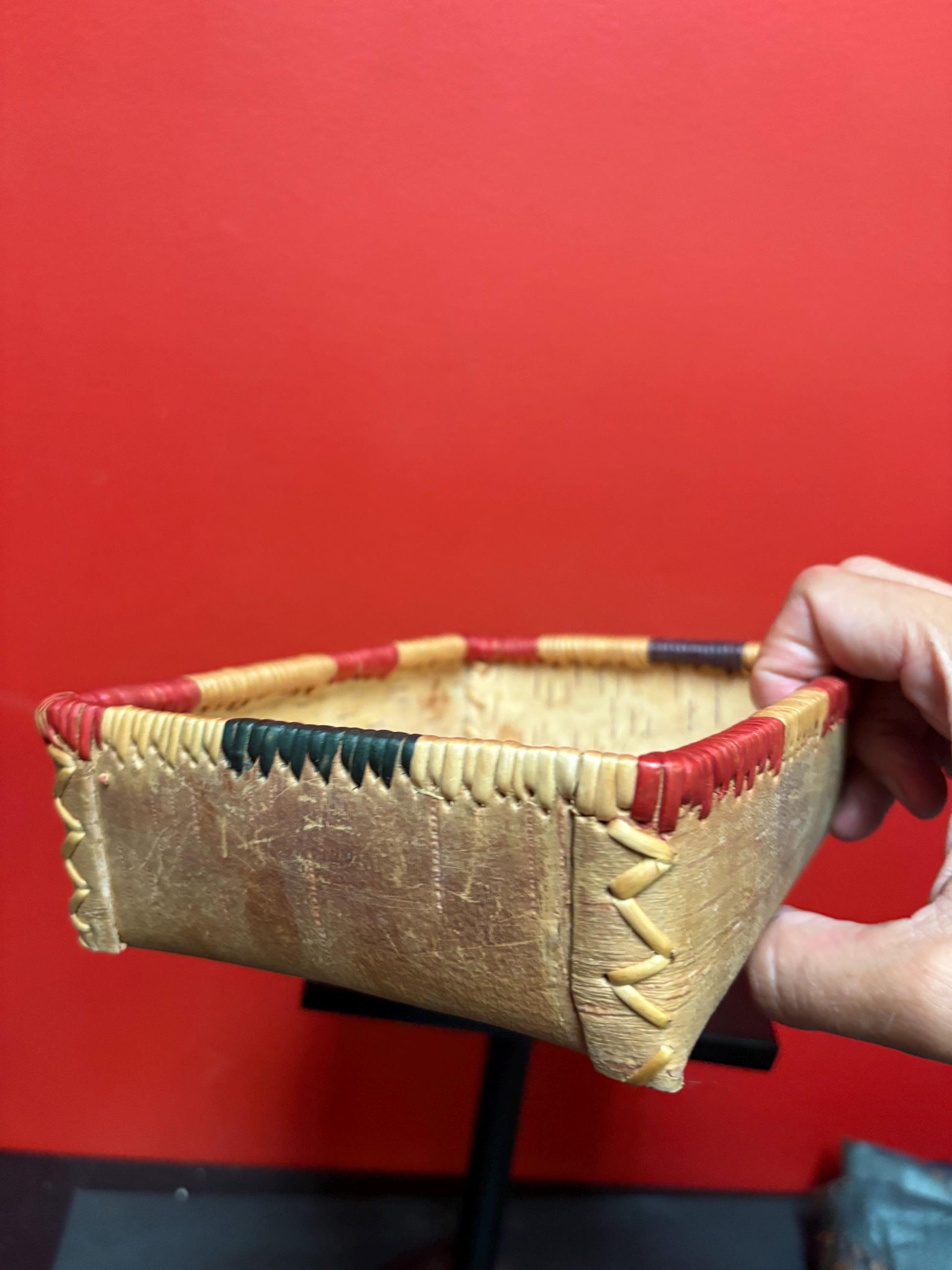 Lovely indigenous first nations cedar bark basket— 8 x 6 x 3” high — great condition and nice colours — wow