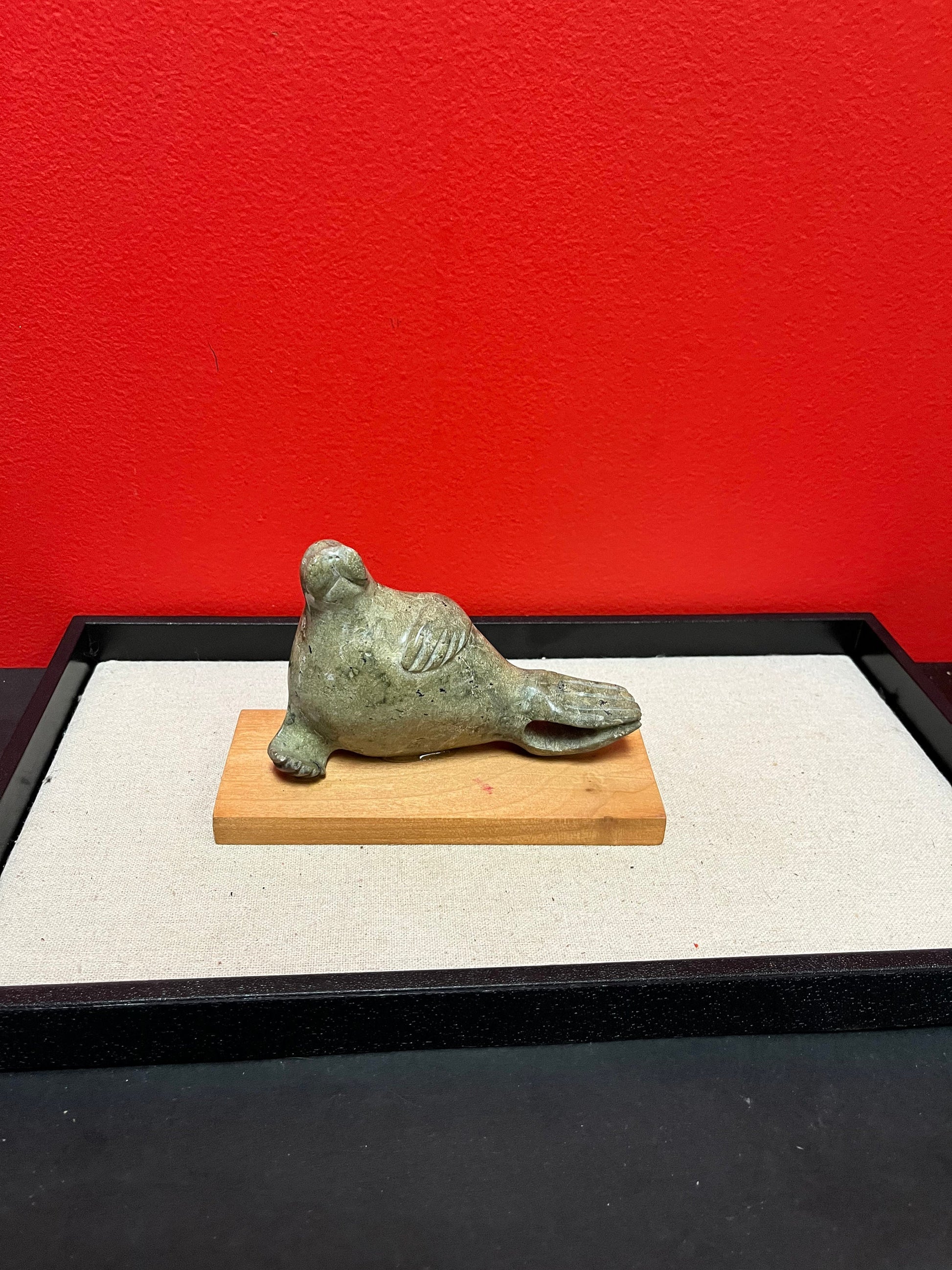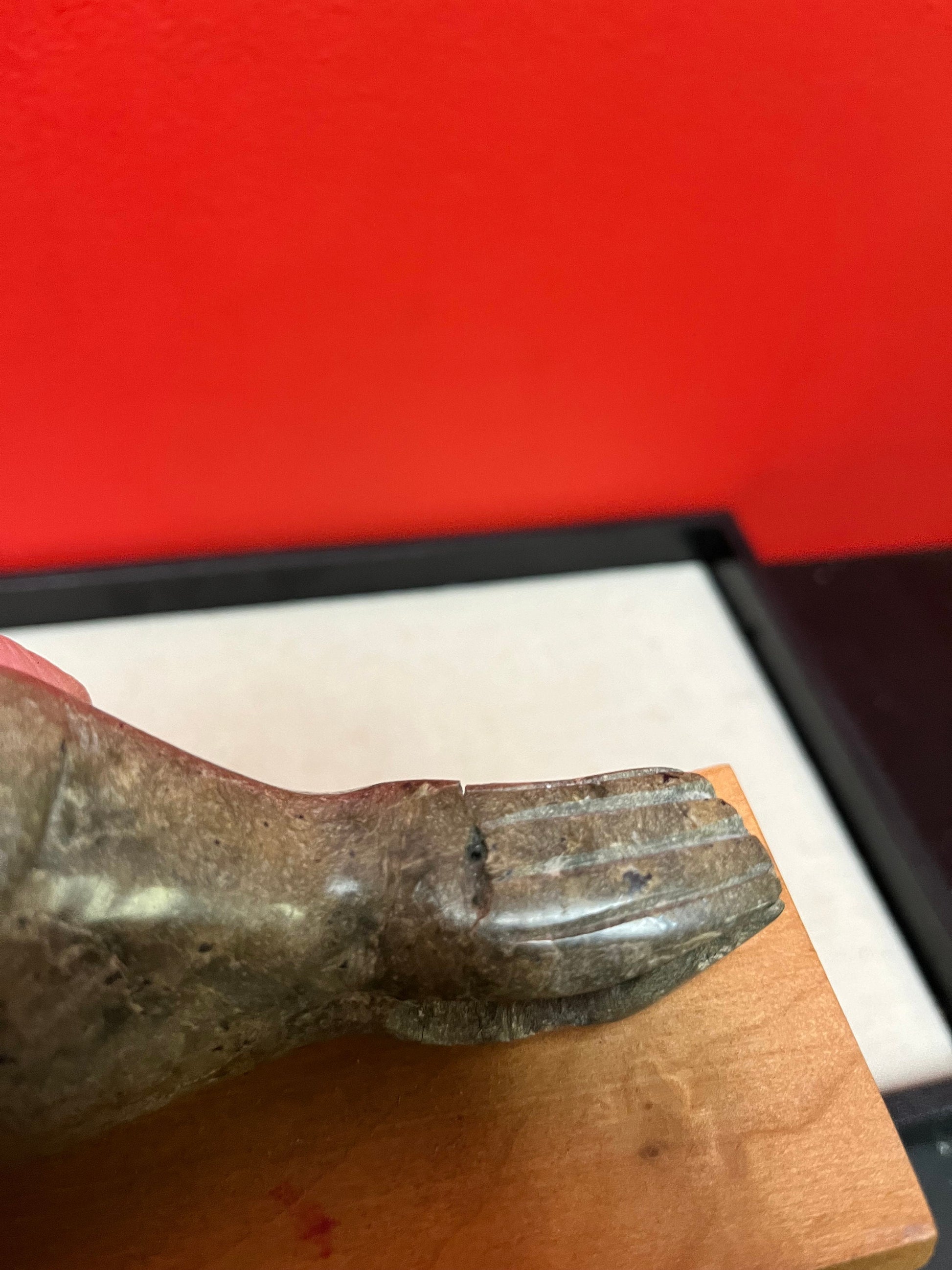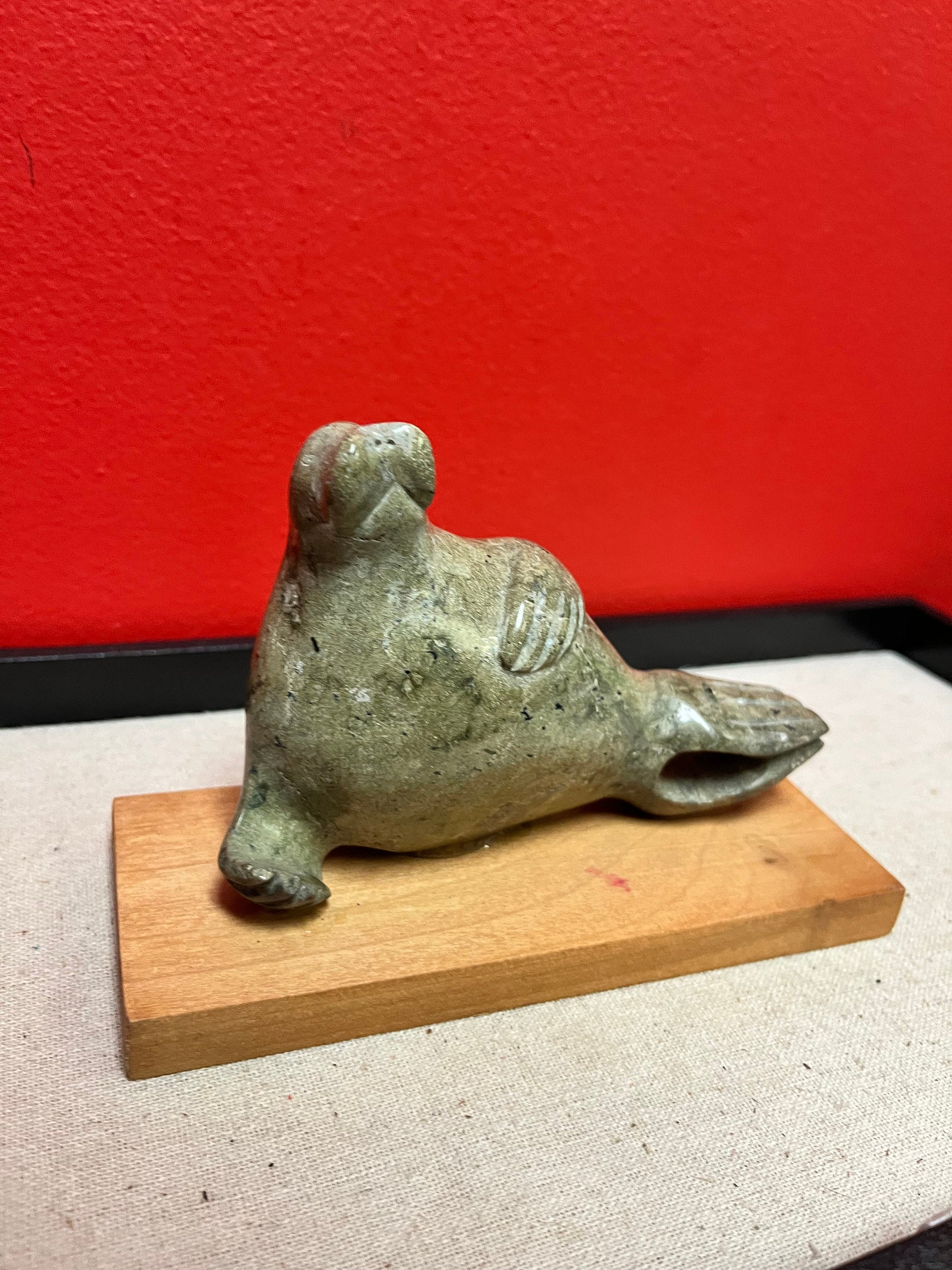 Lovely indigenous Inuit soapstone 7 x 4 high walrus on stand cracked tail, so see photos and priced low accordingly