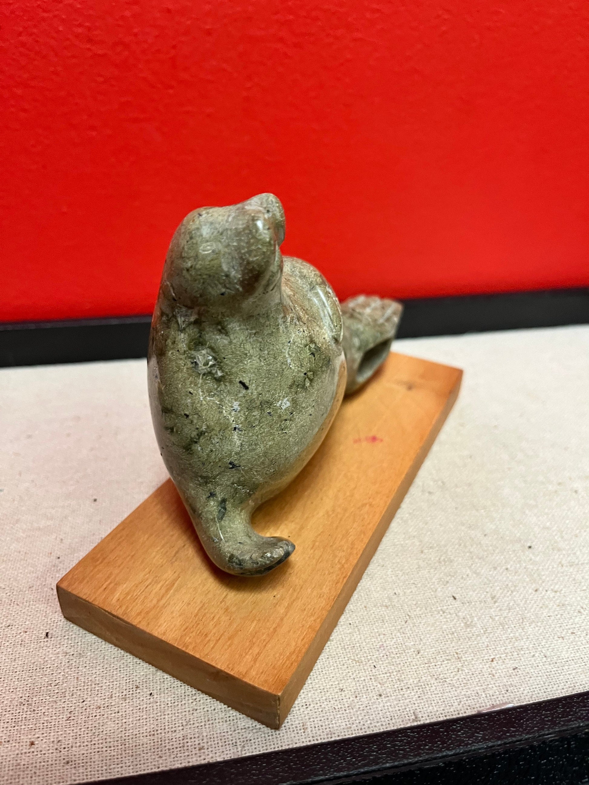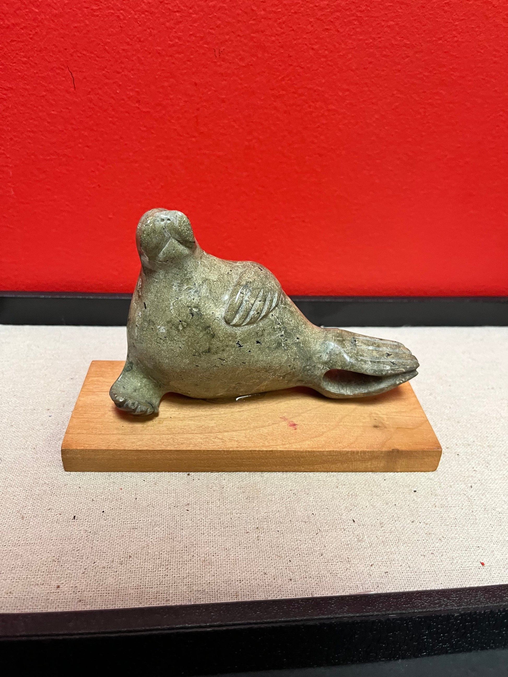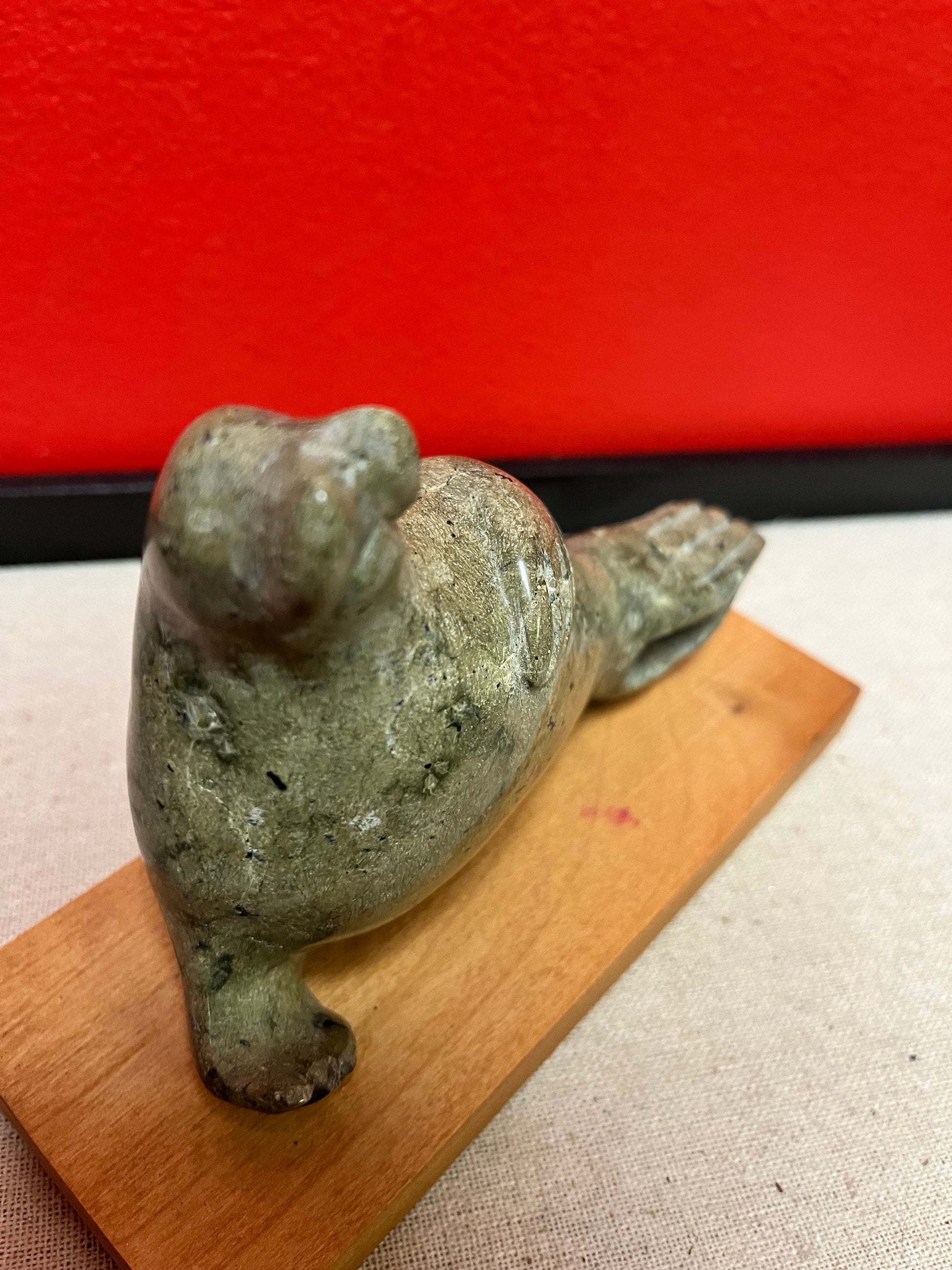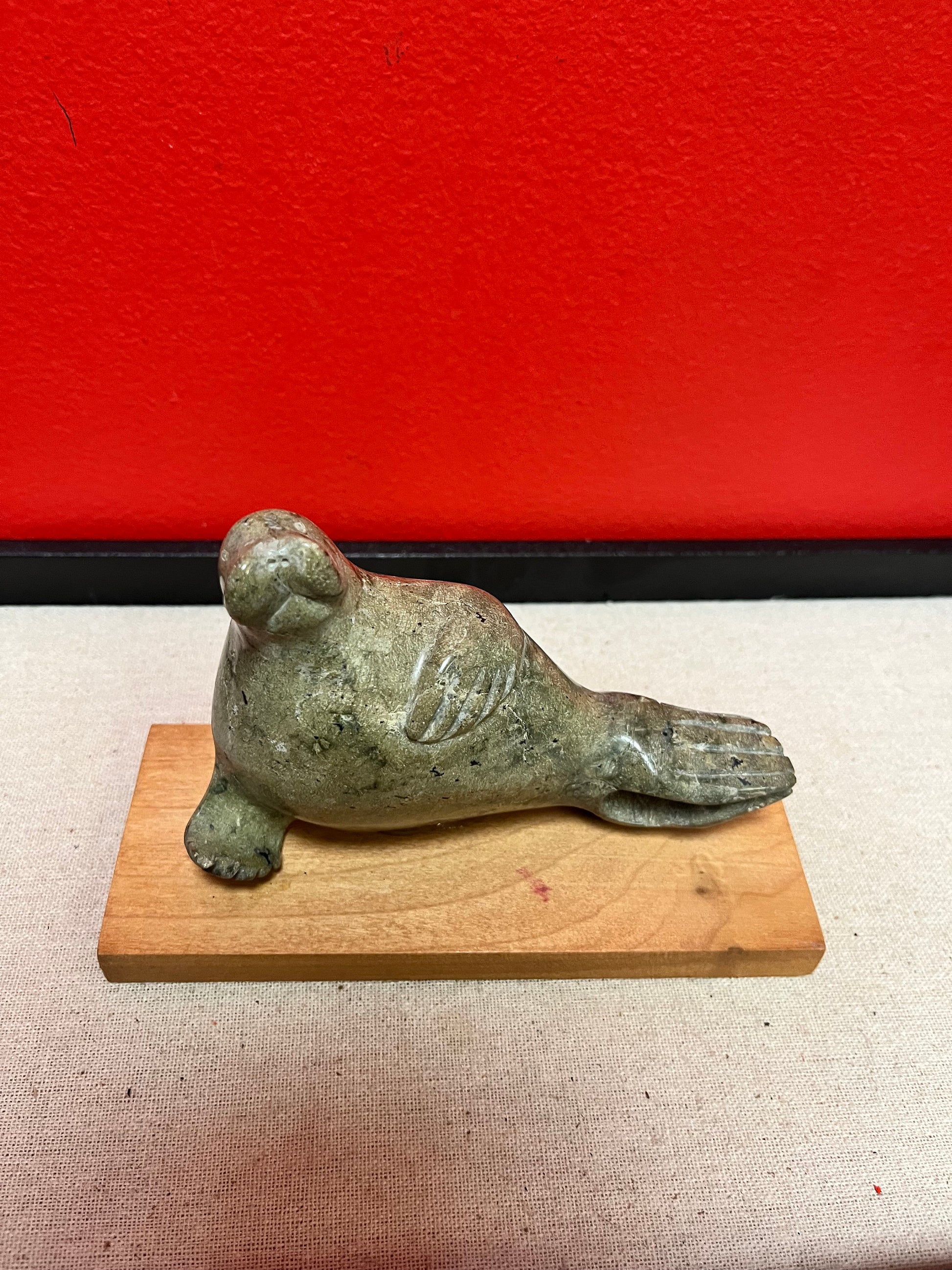 Lovely indigenous Inuit soapstone 7 x 4 high walrus on stand cracked tail, so see photos and priced low accordingly