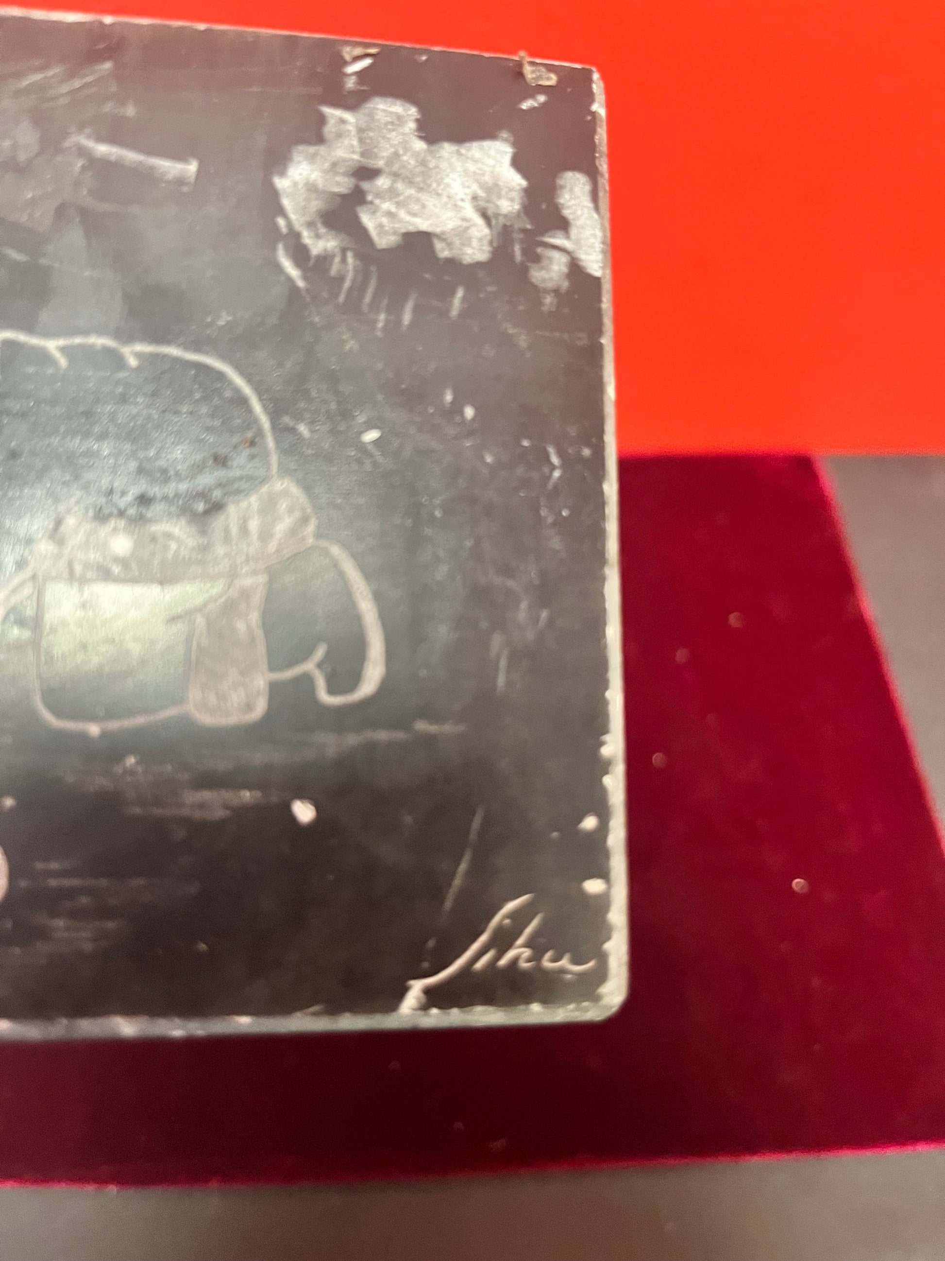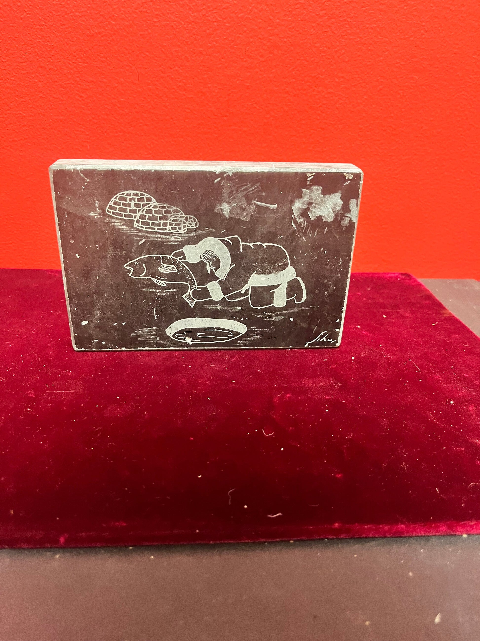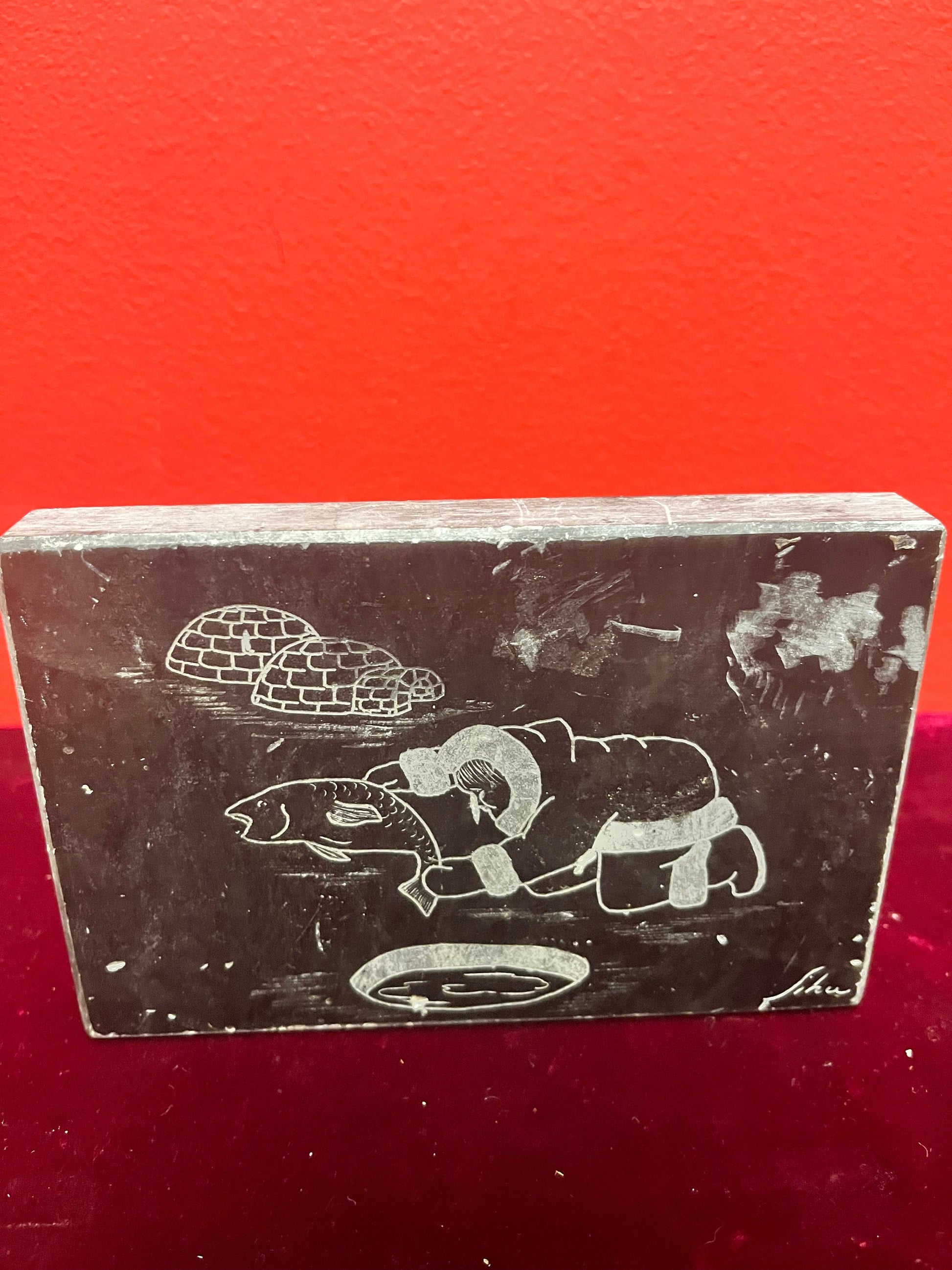 Lovely indigenous inuit soapstone plaque 6 x 4 x 1 high - signed as is damage on corner