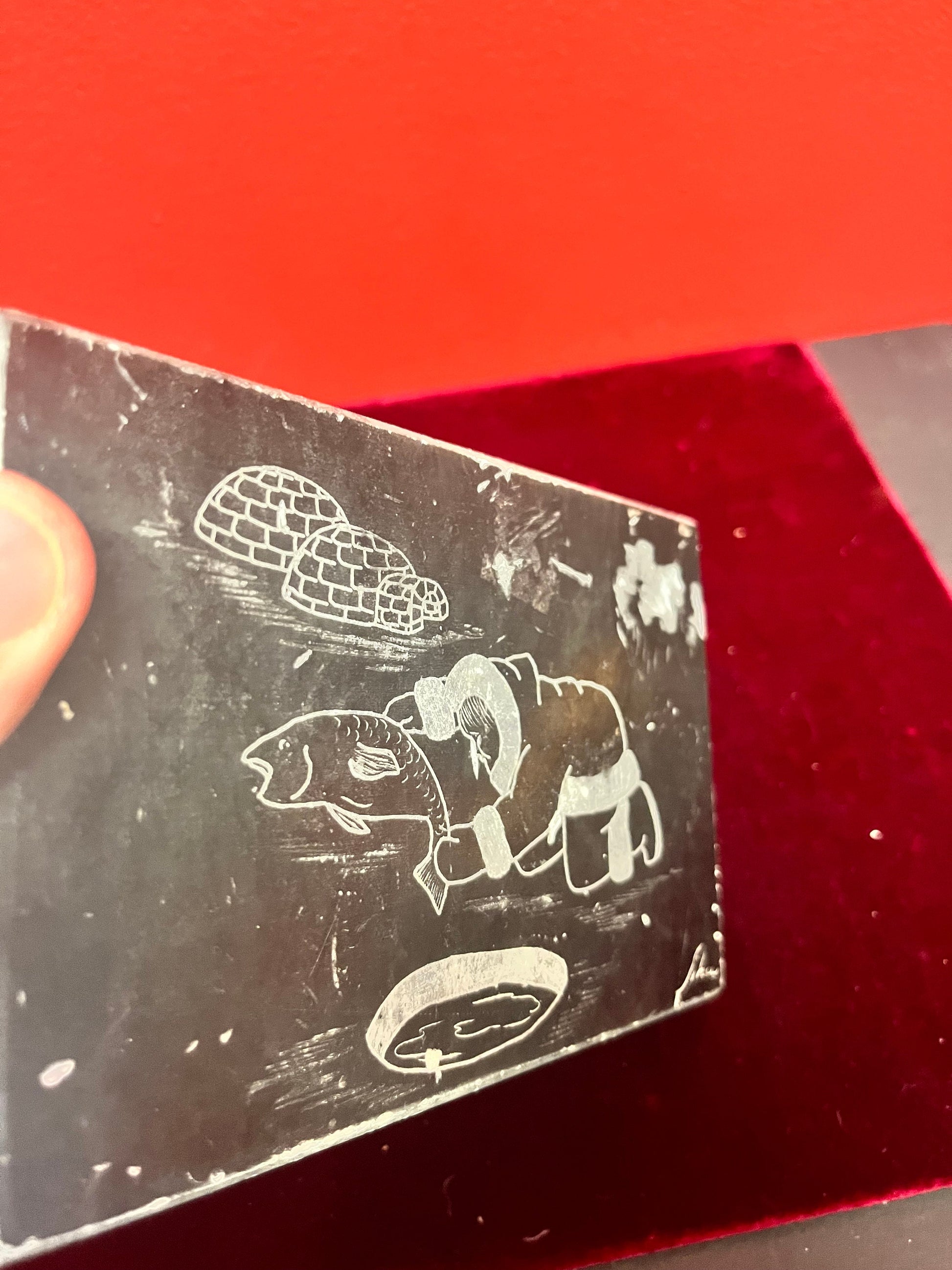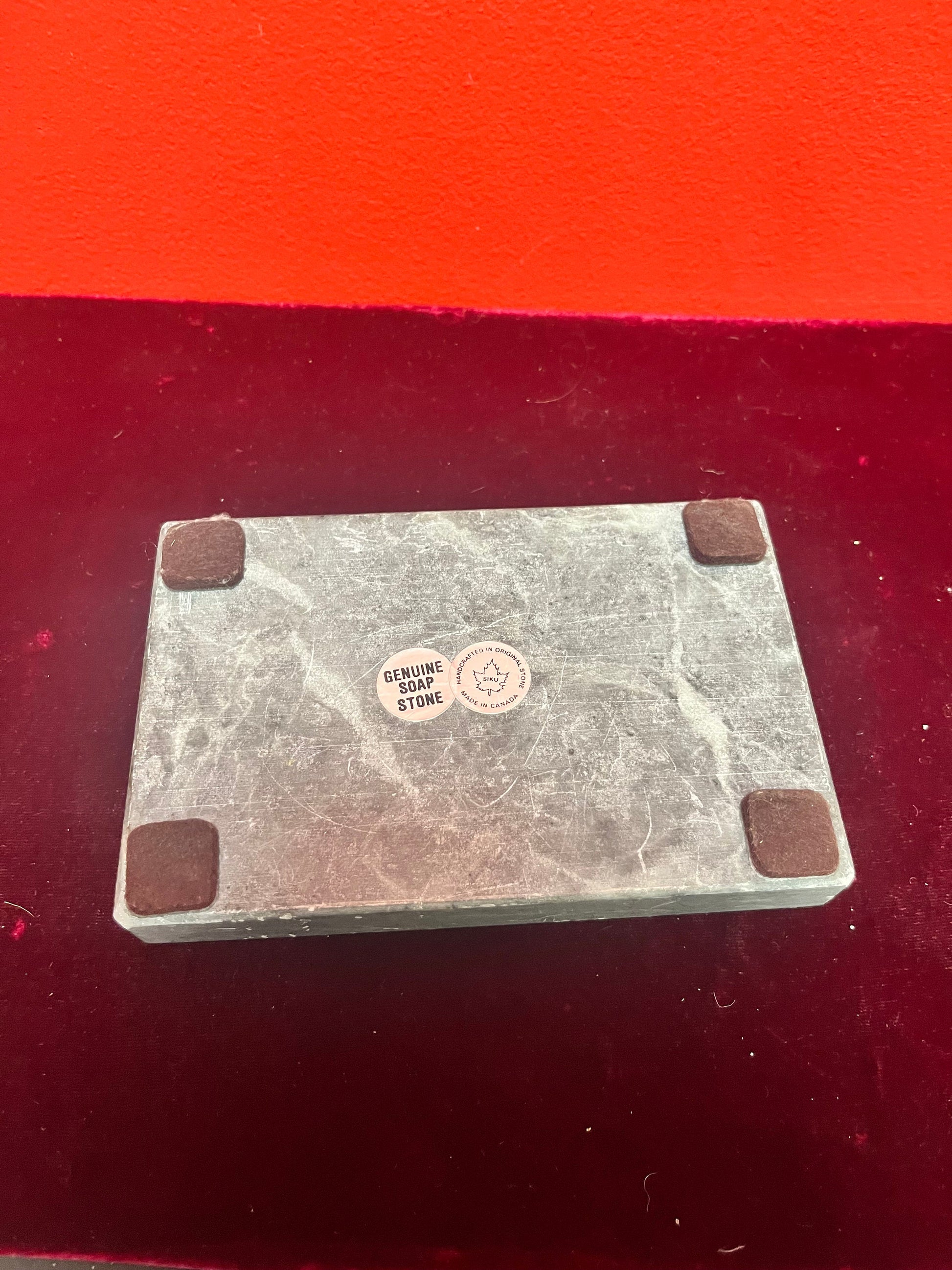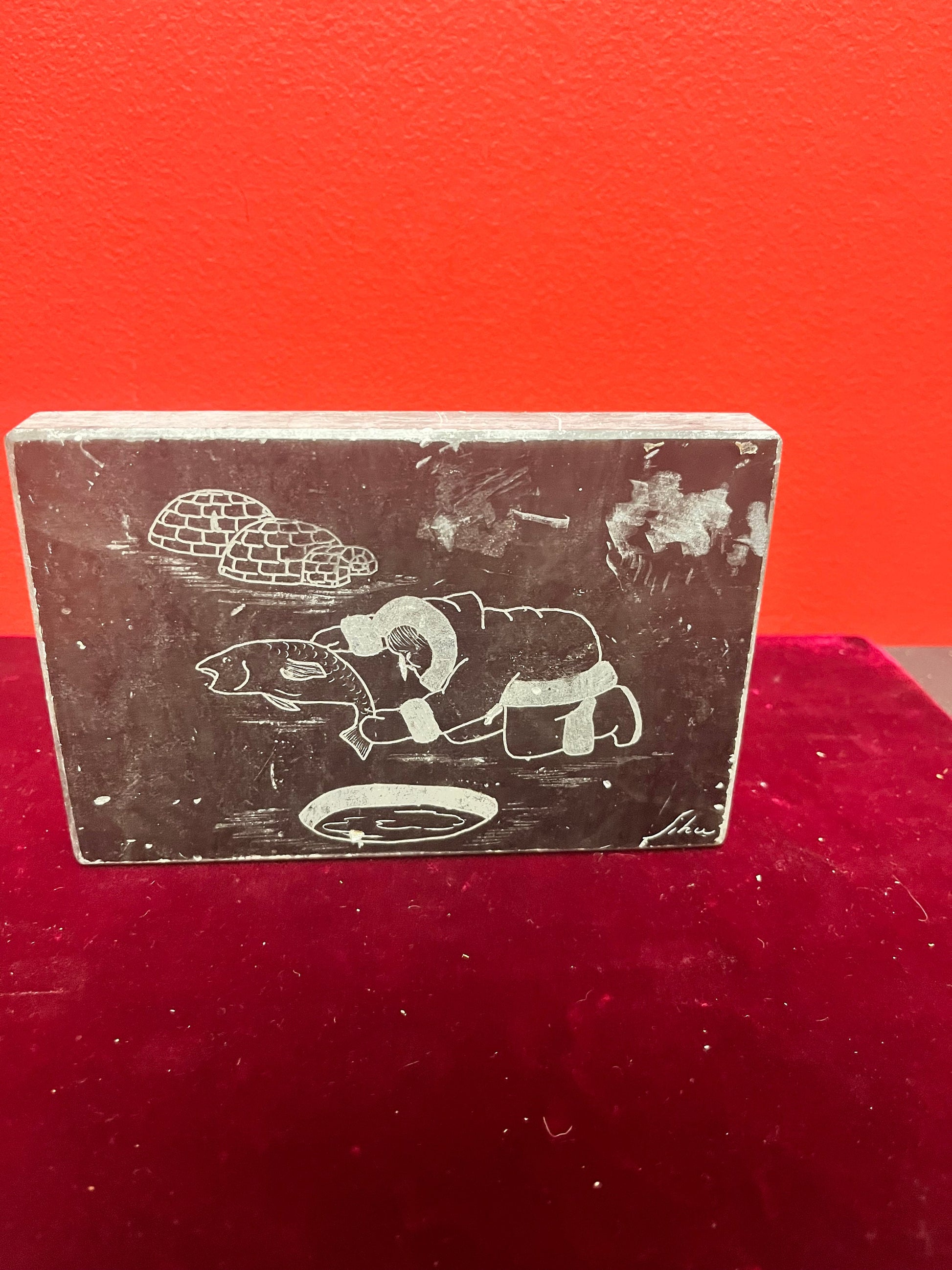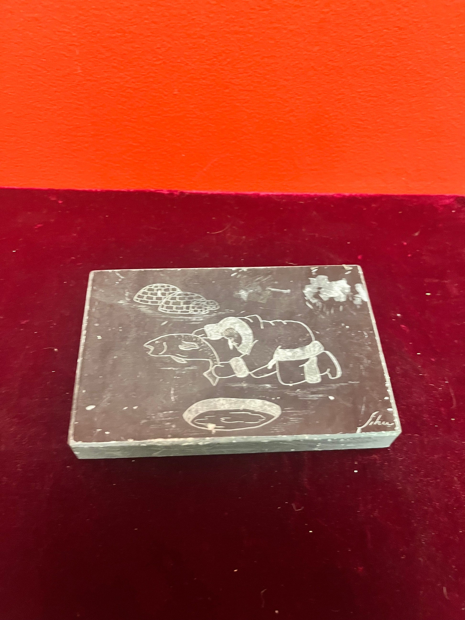 Lovely indigenous inuit soapstone plaque 6 x 4 x 1 high - signed as is damage on corner