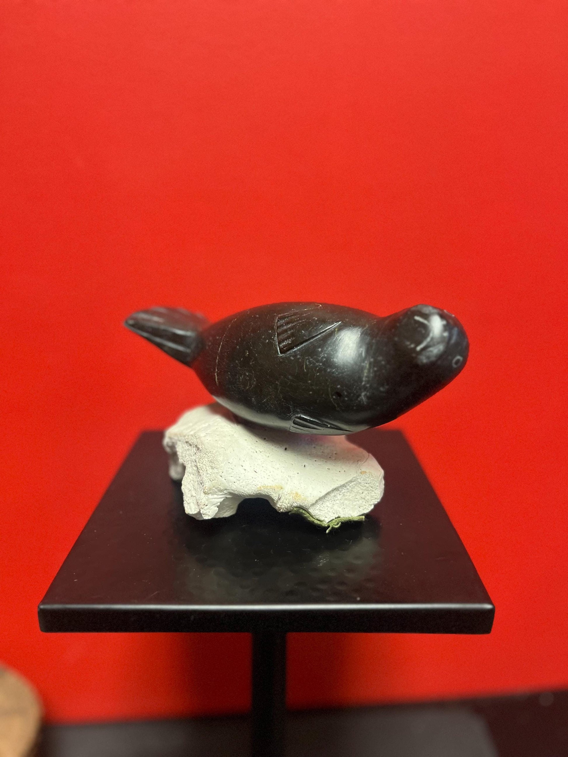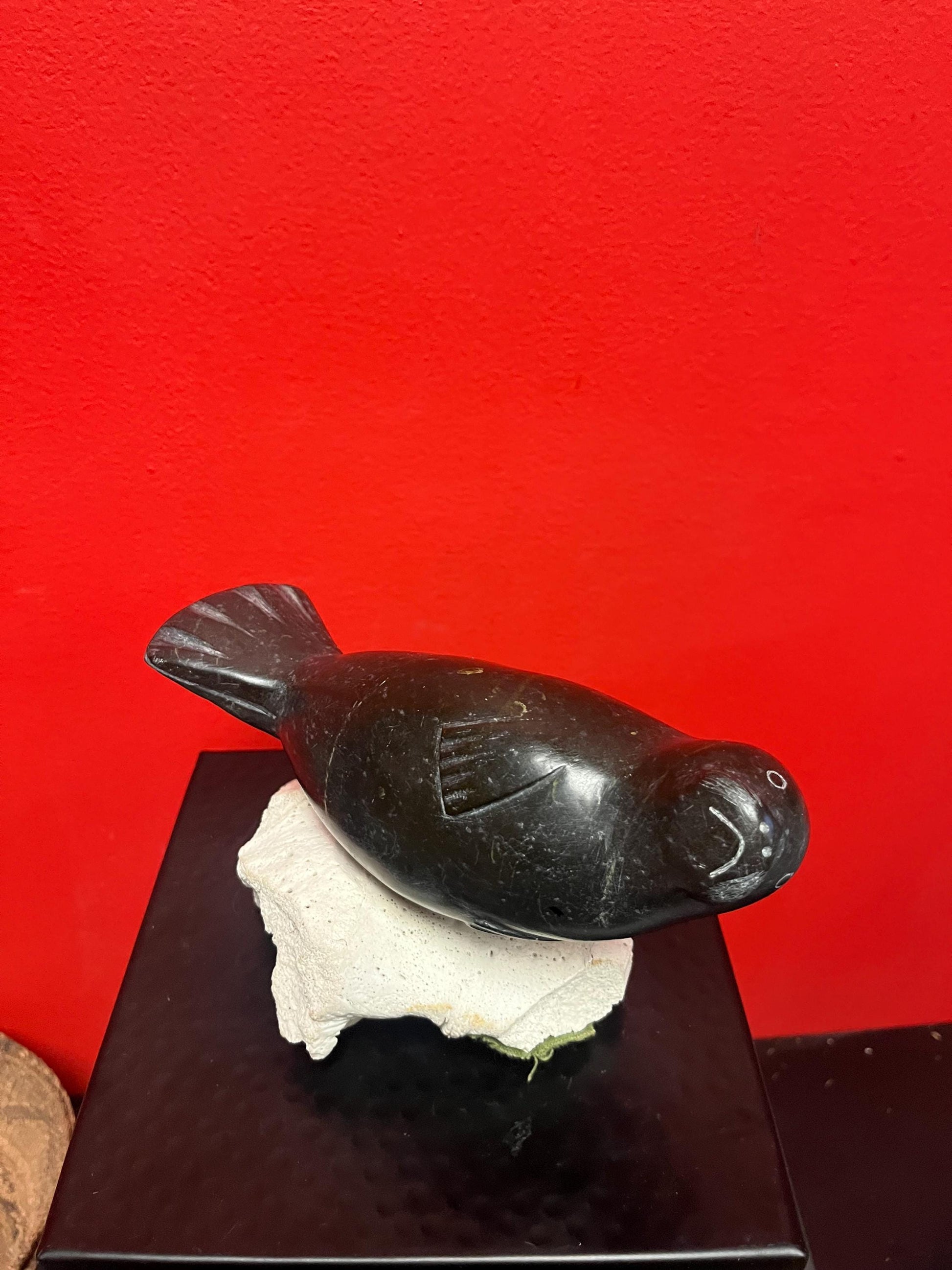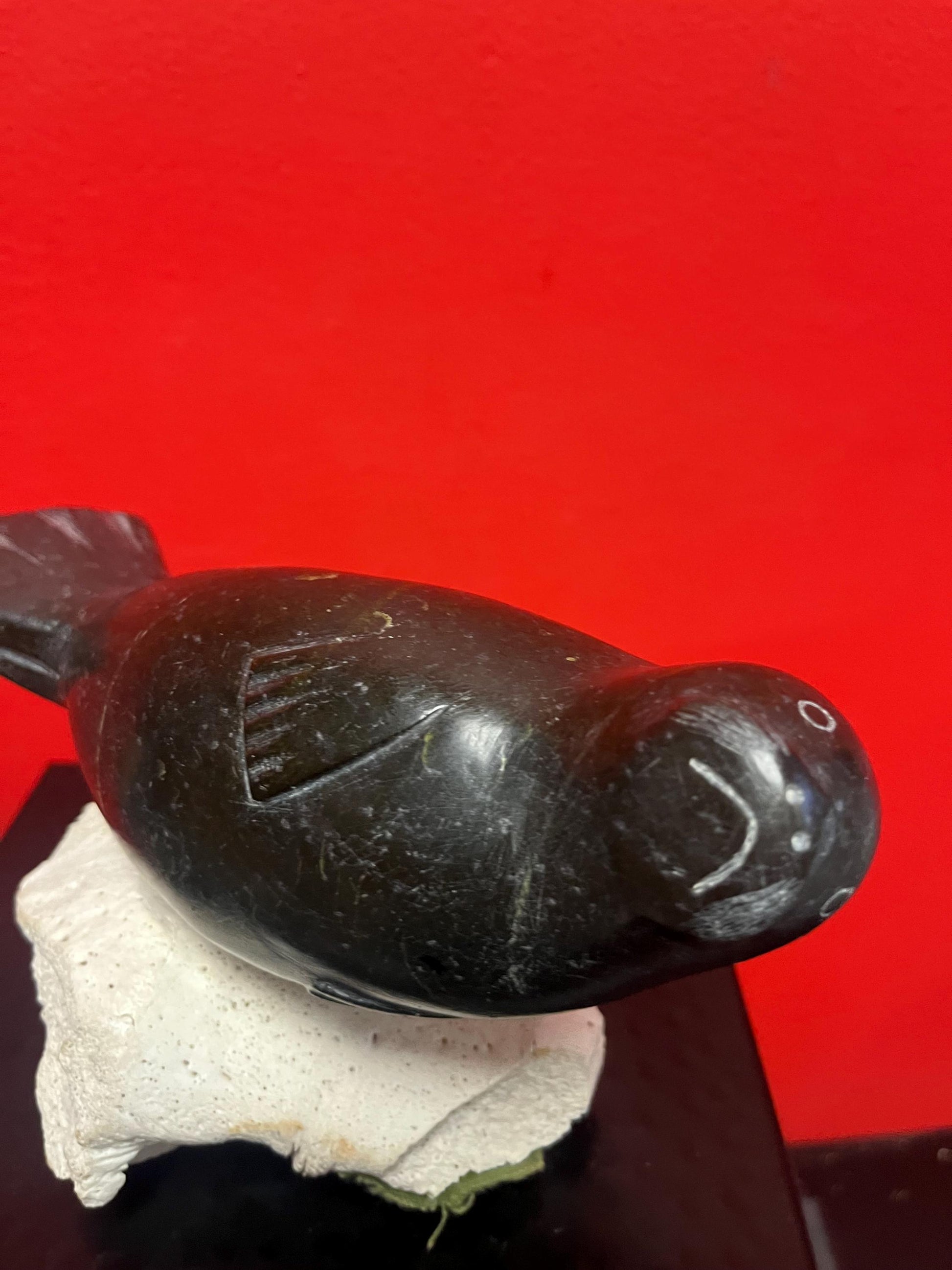 Lovely indigenous Inuit soapstone seal on rock base wonderful condition and imagery 8 x 5 inches high