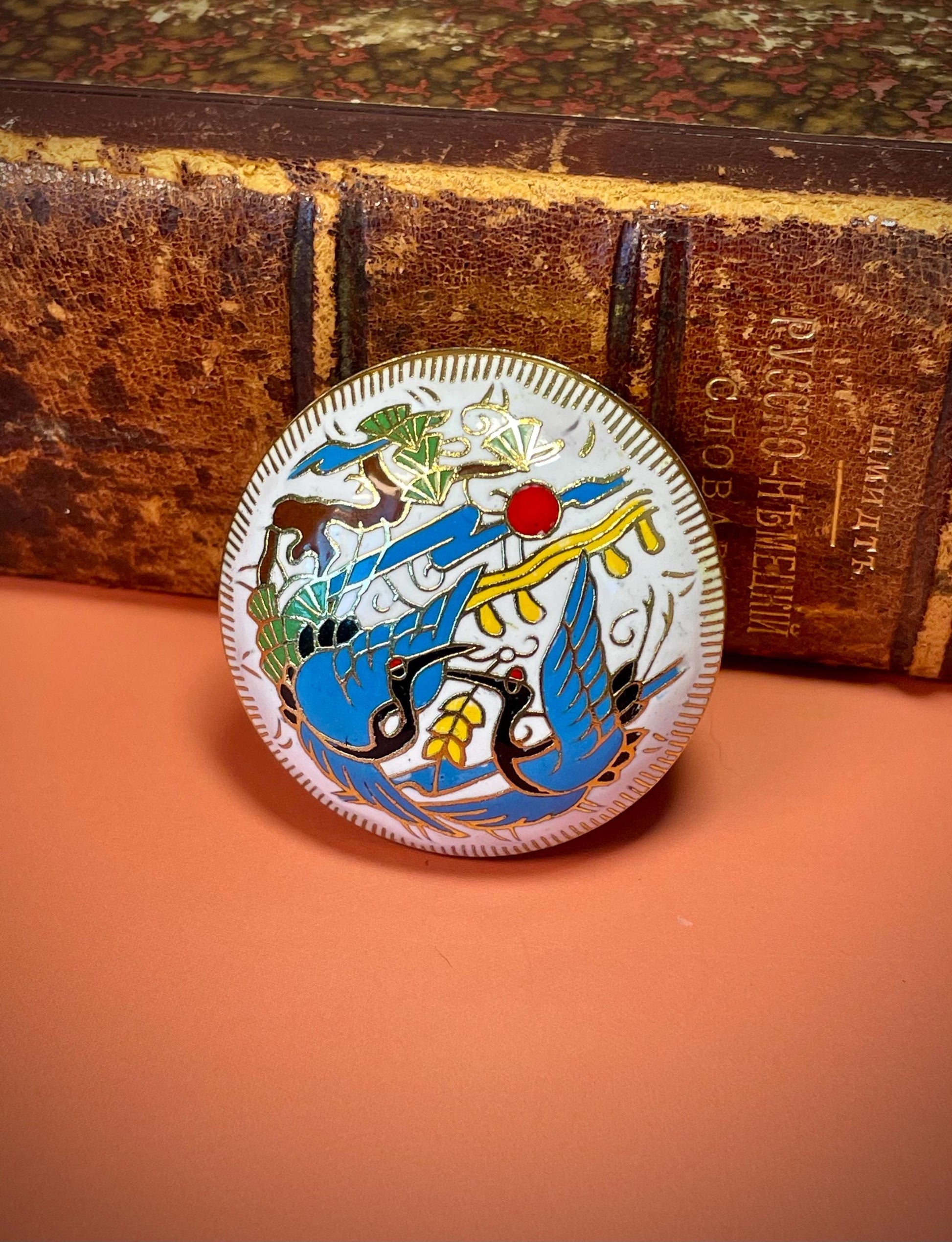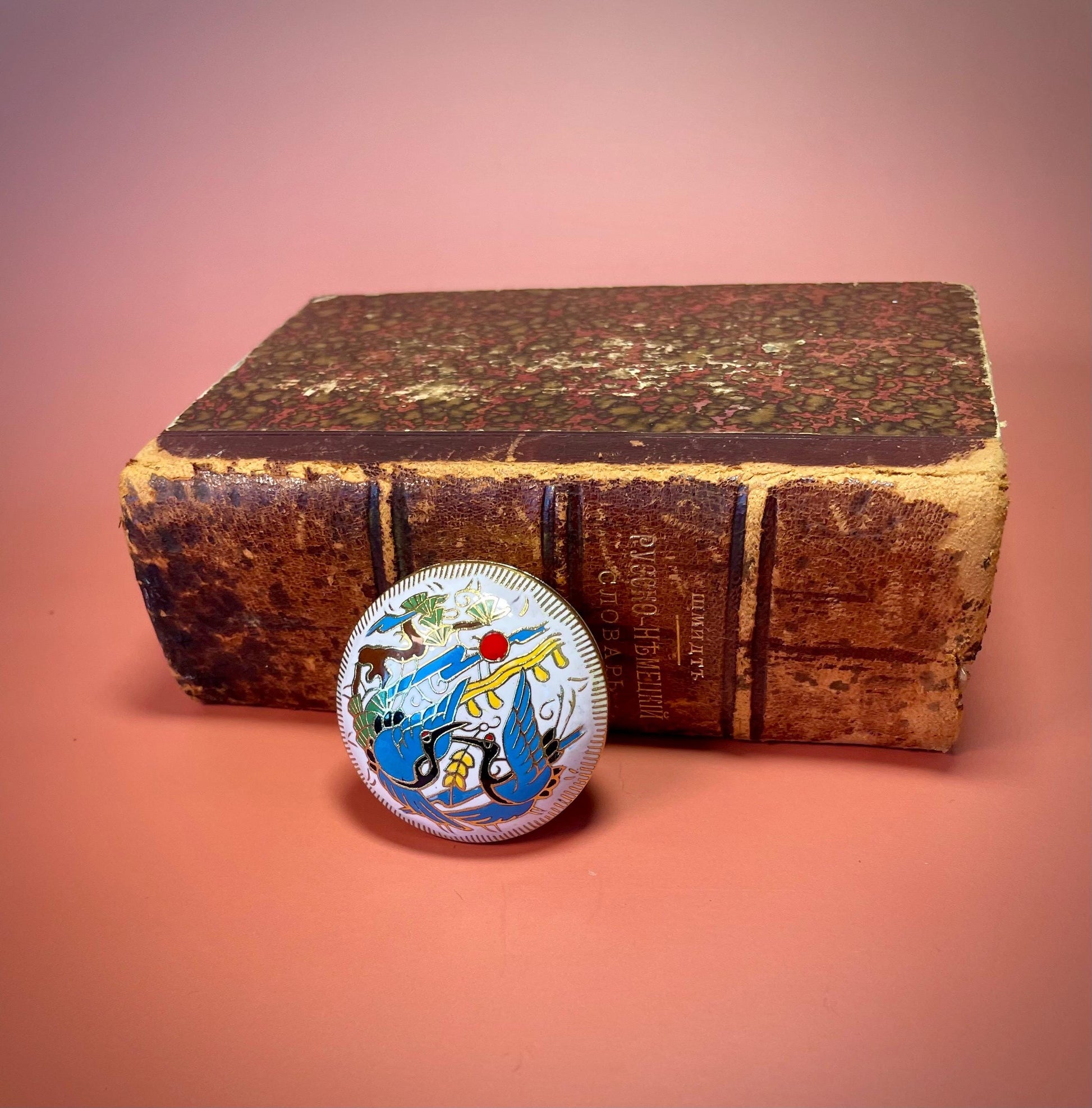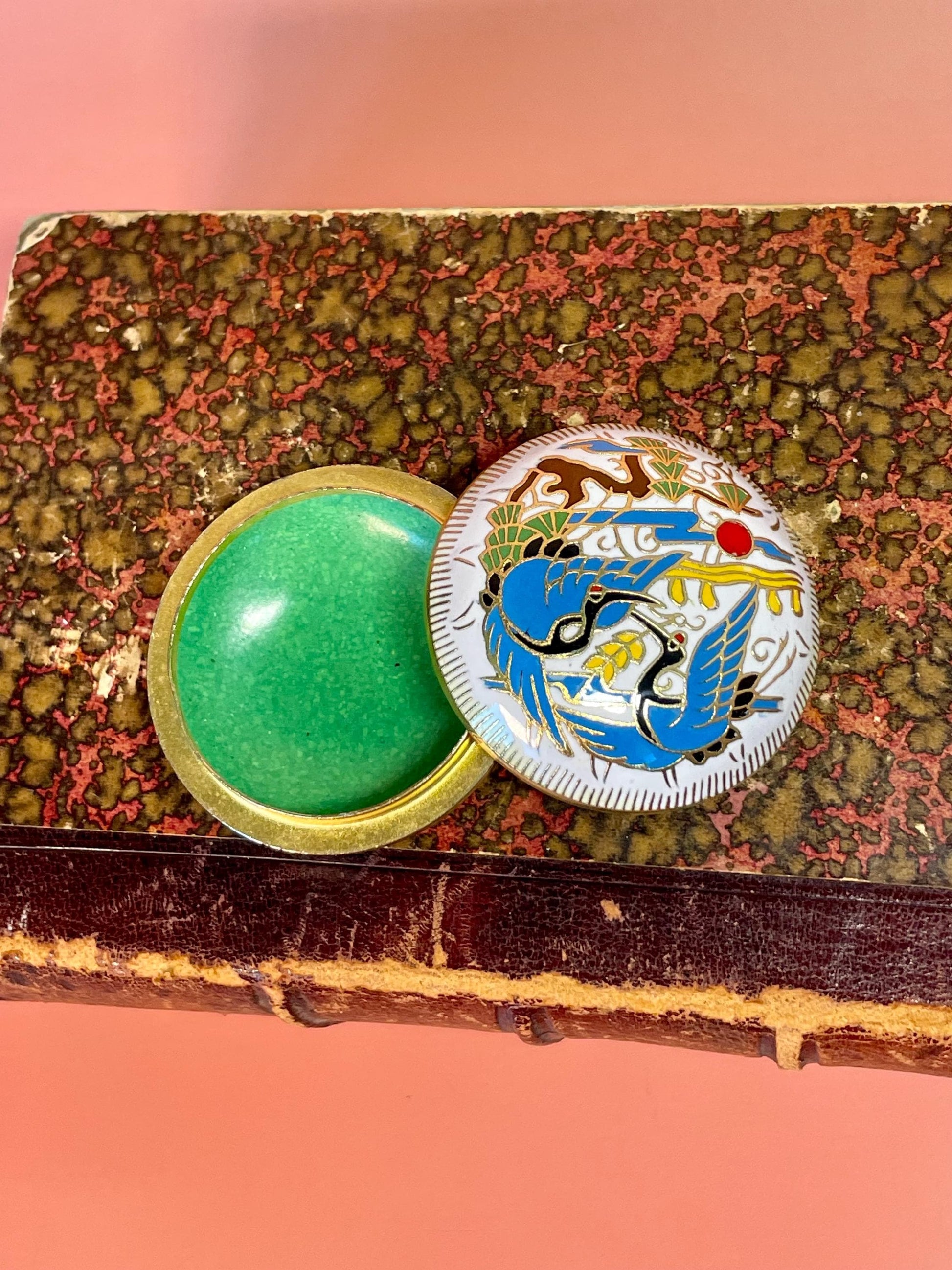 This lovely tiny lidded dish features vibrant Cloisonné detailing, showcasing elegant cranes, delicate foliage, and striking colors.