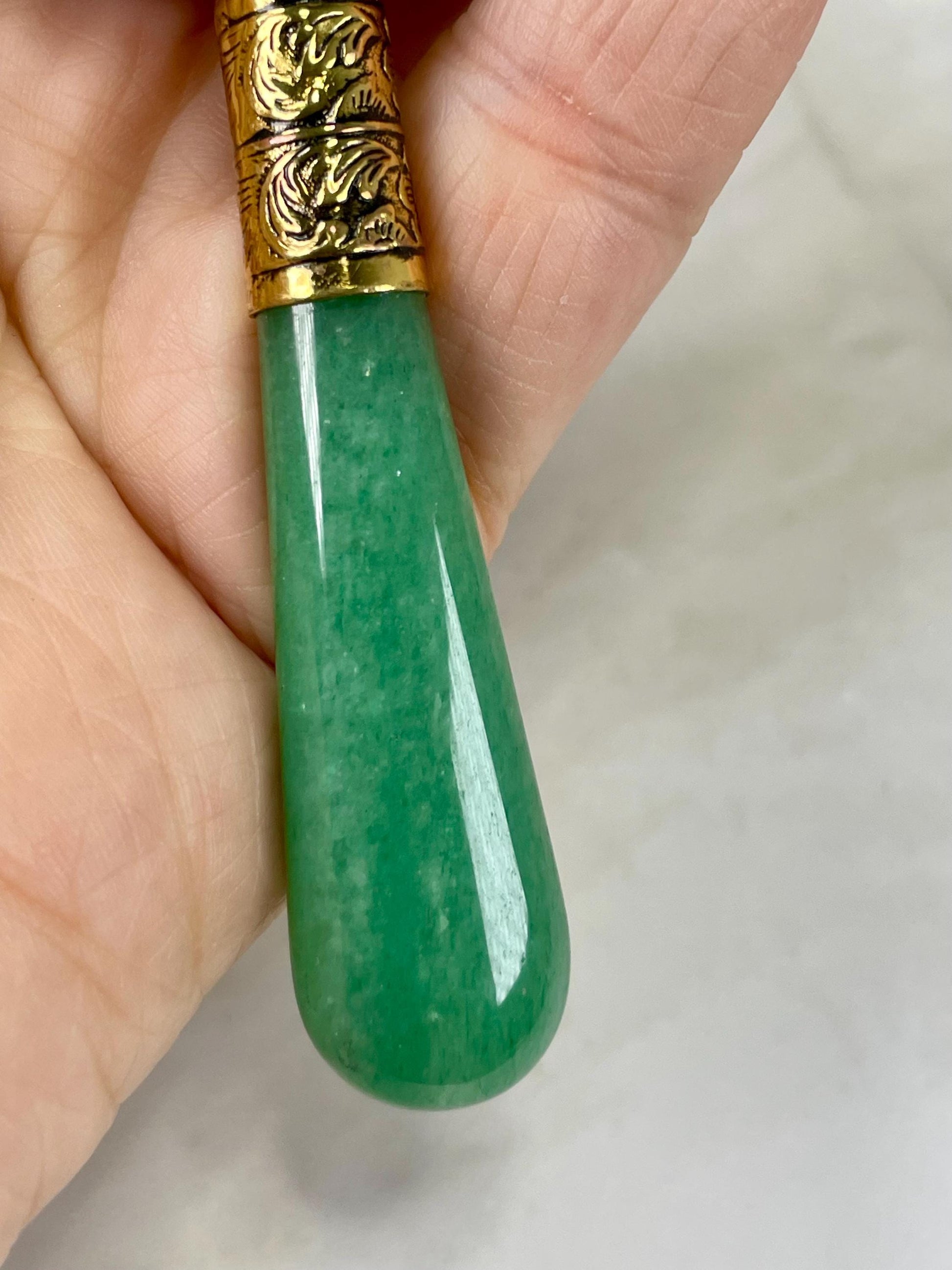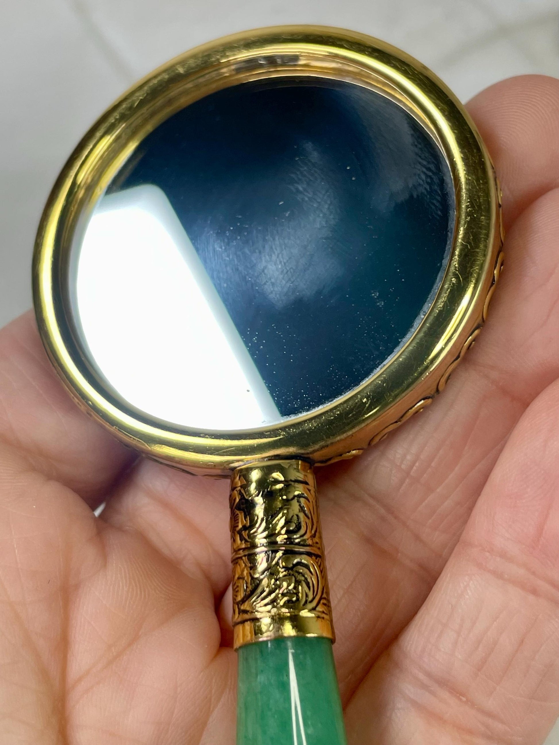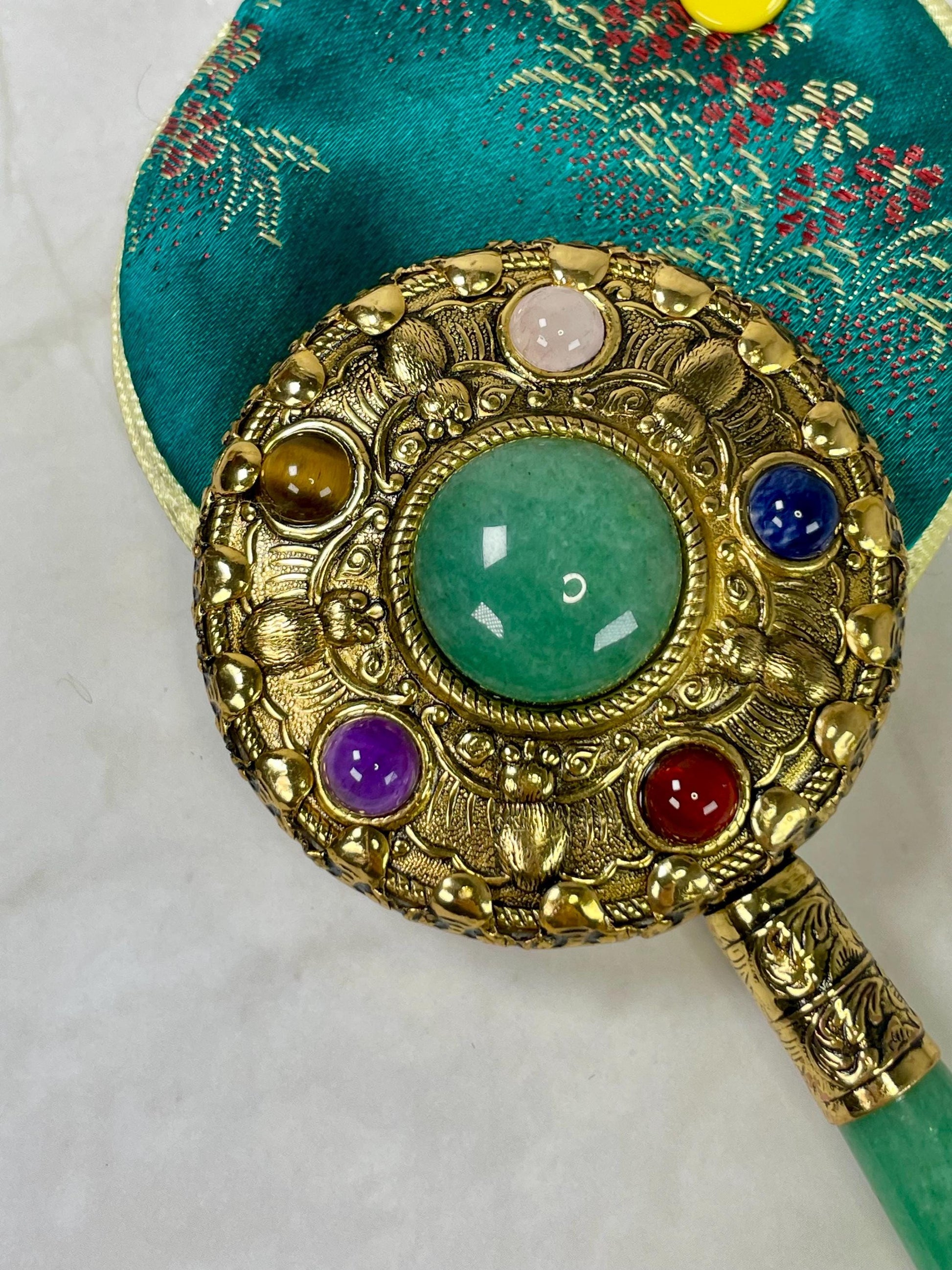 Ornately decorated little mirror with Jade handle, and gemstones. Comes with button closed silk case.