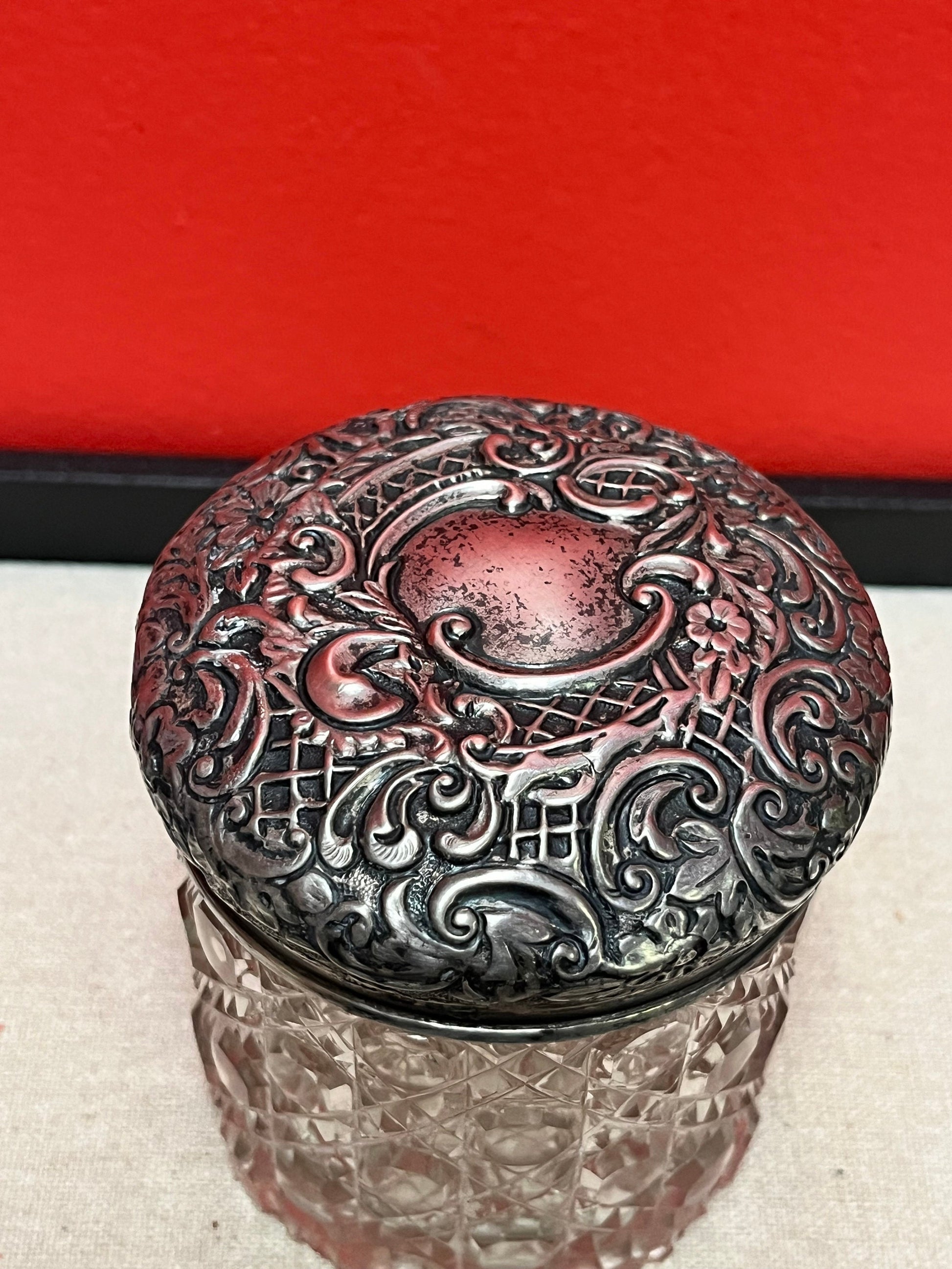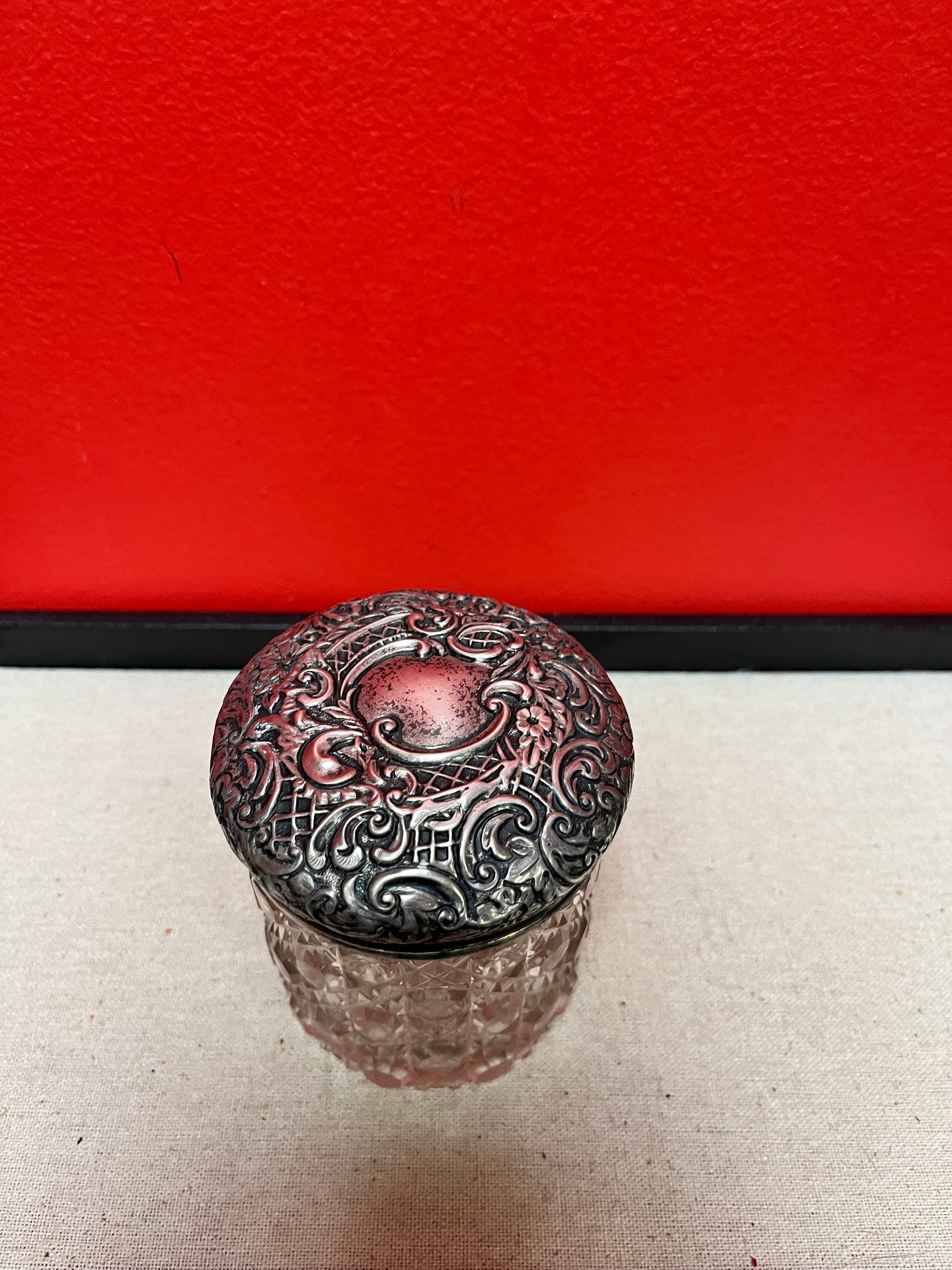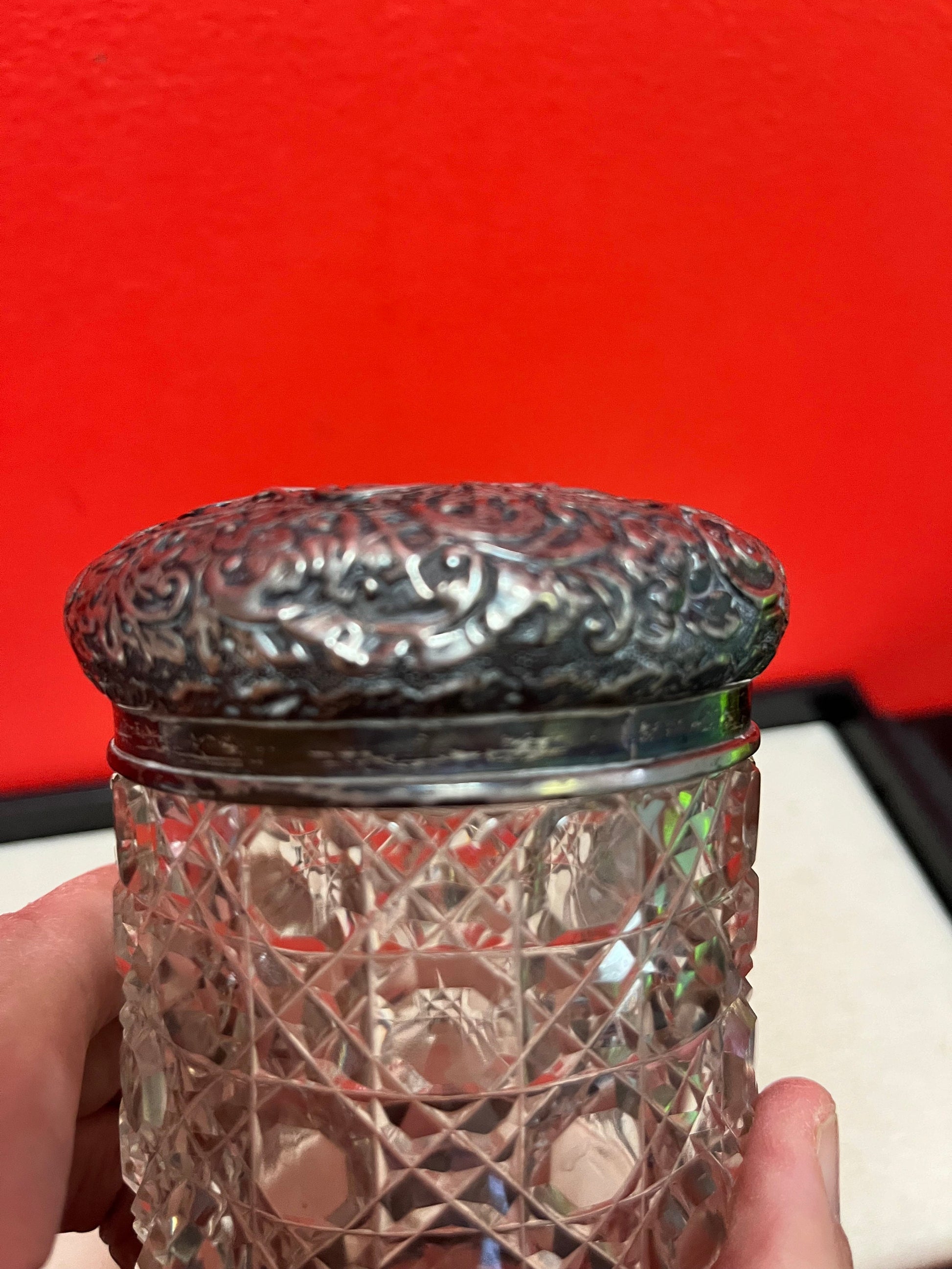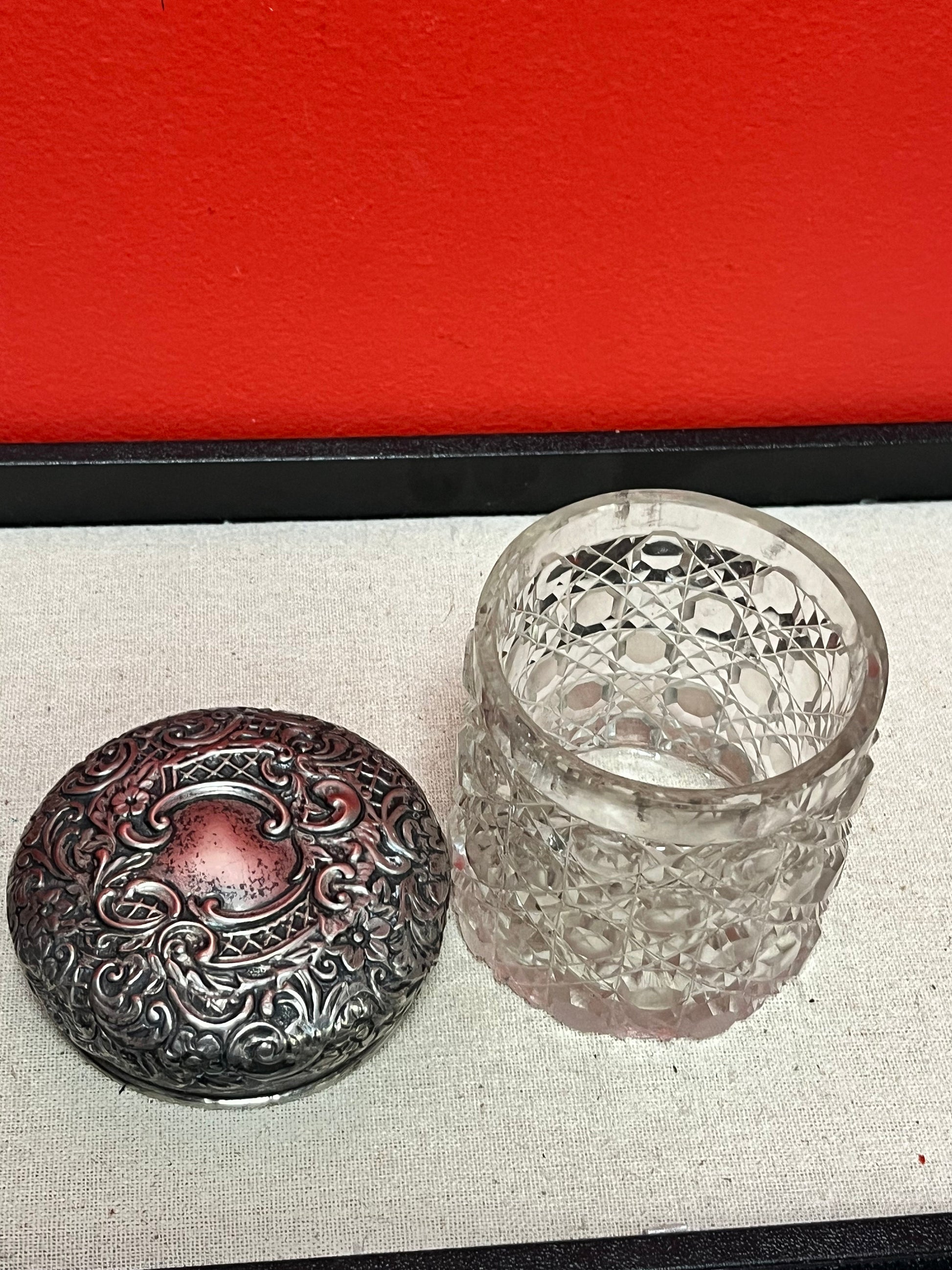Lovely lodge 3 inch sterling English silver and crystal powder jar good condition see photos