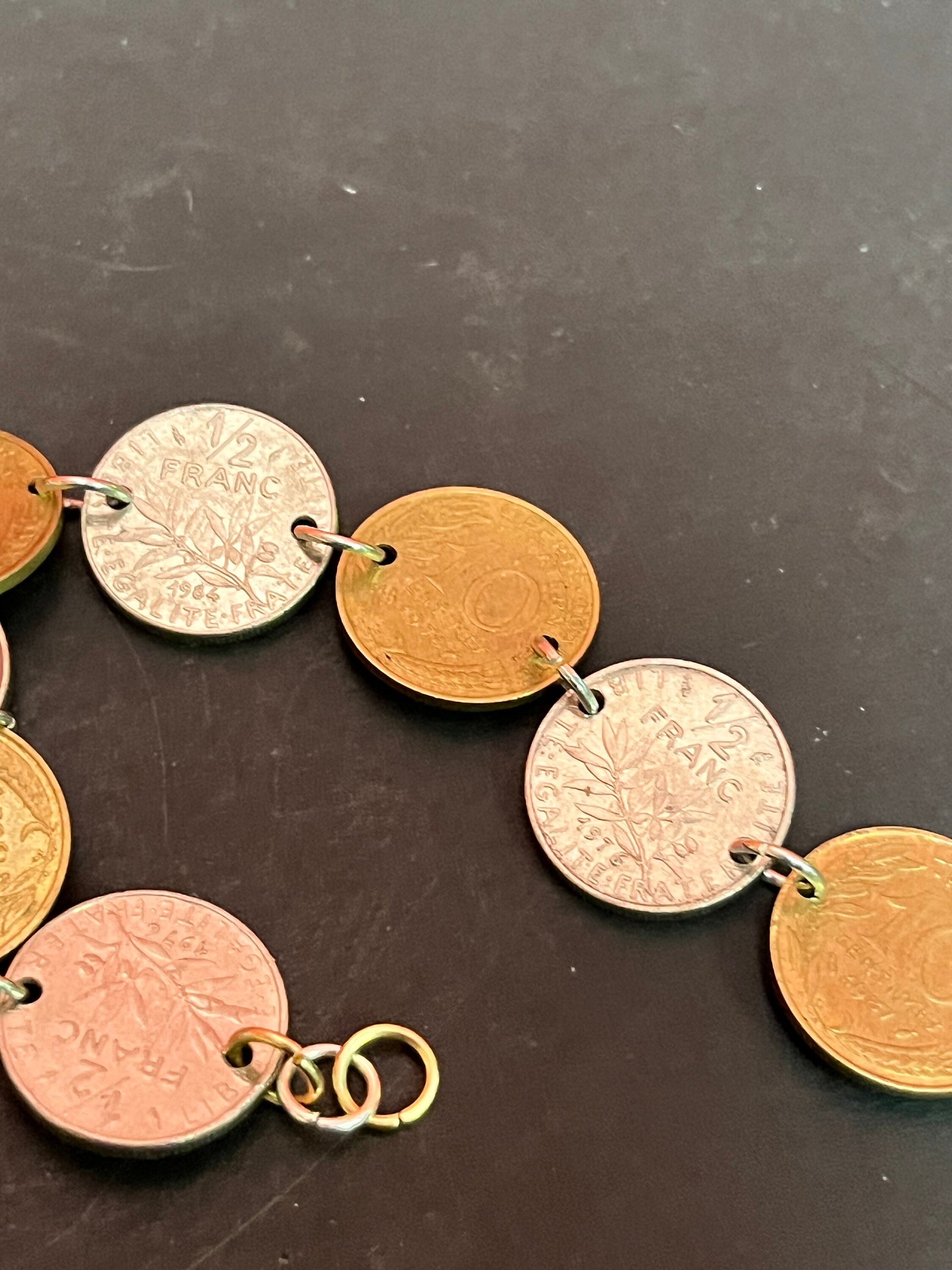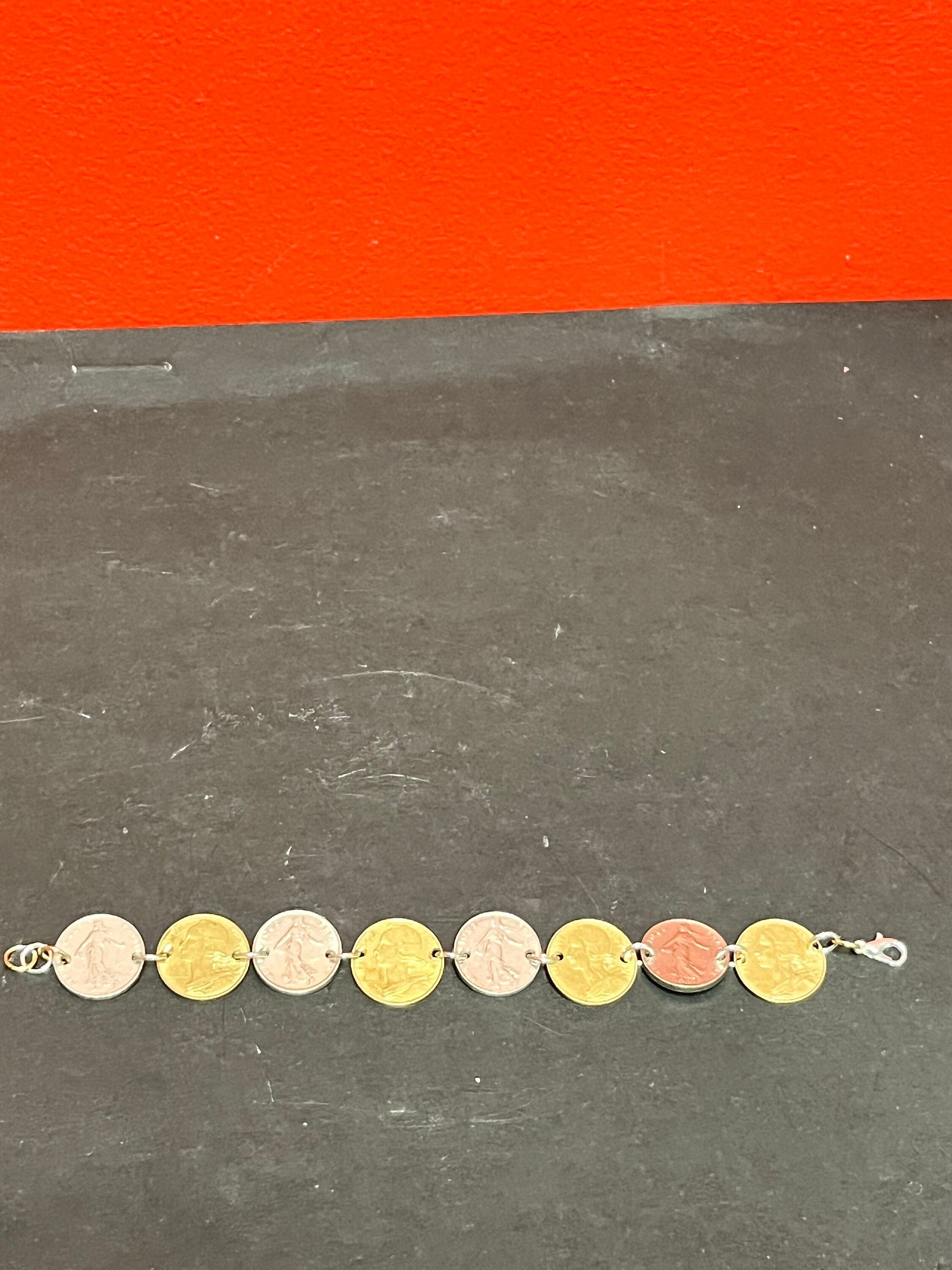 Lovely old handmade 7 inch long French coin bracelet unique and wonderful gift
