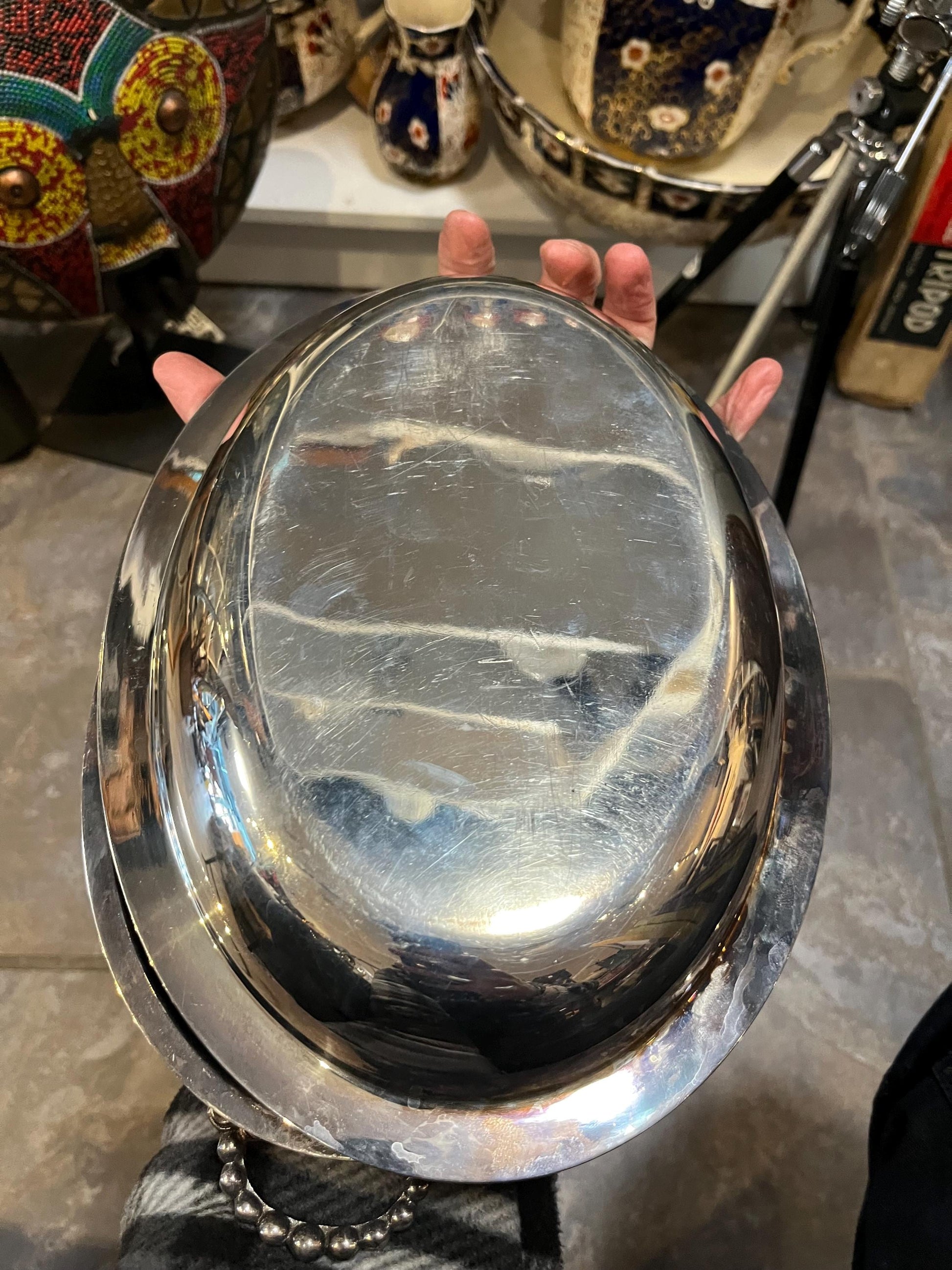 Lovely pair of English silver plated covered entree dishes 12 x 8 - need light polish and some minor scratches but good condition great value