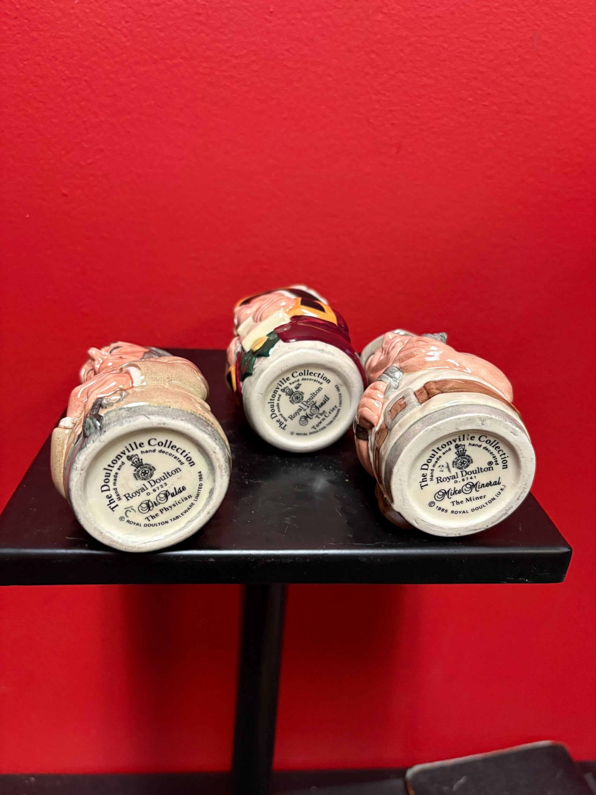 Lovely set of three Royal Doulton Toby jugs from the Doultonville  collection — all in good condition — 4 inches tall— great value— great gifts