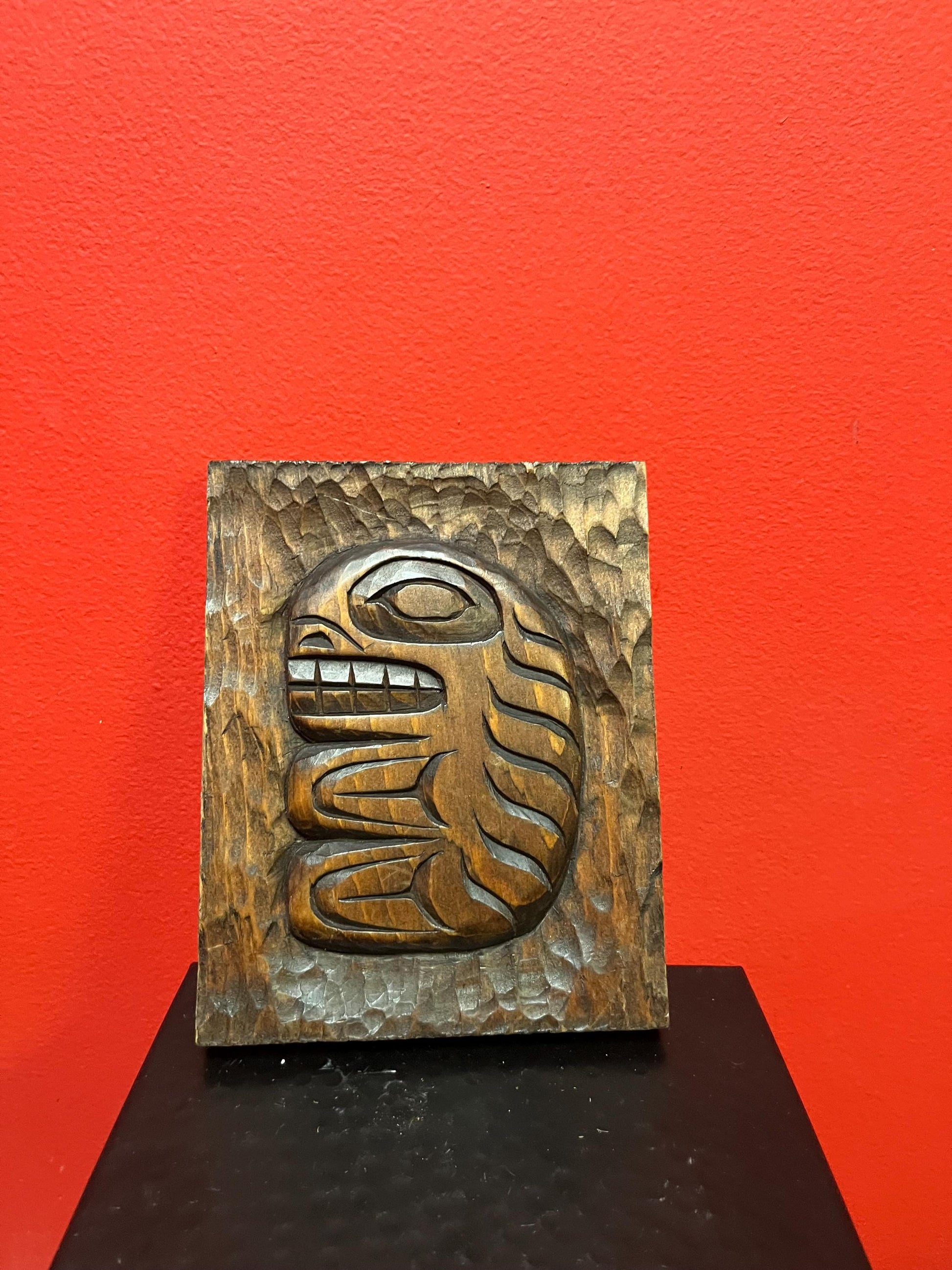 Lovely signed black fish by MAURY CLARK indigenous first nation specific northwest coast cedar needs hanger 7 x 5