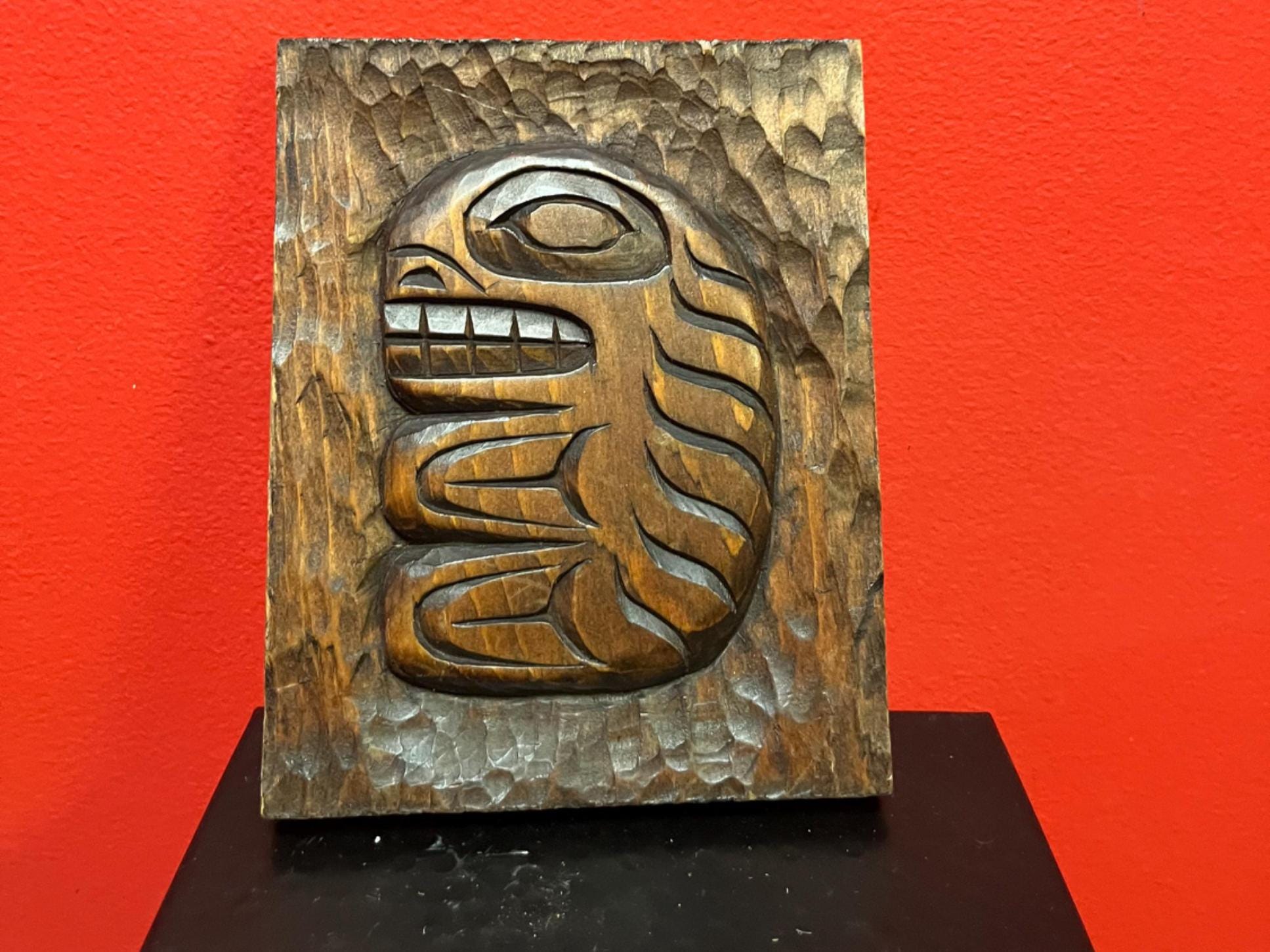 Lovely signed black fish by MAURY CLARK indigenous first nation specific northwest coast cedar needs hanger 7 x 5