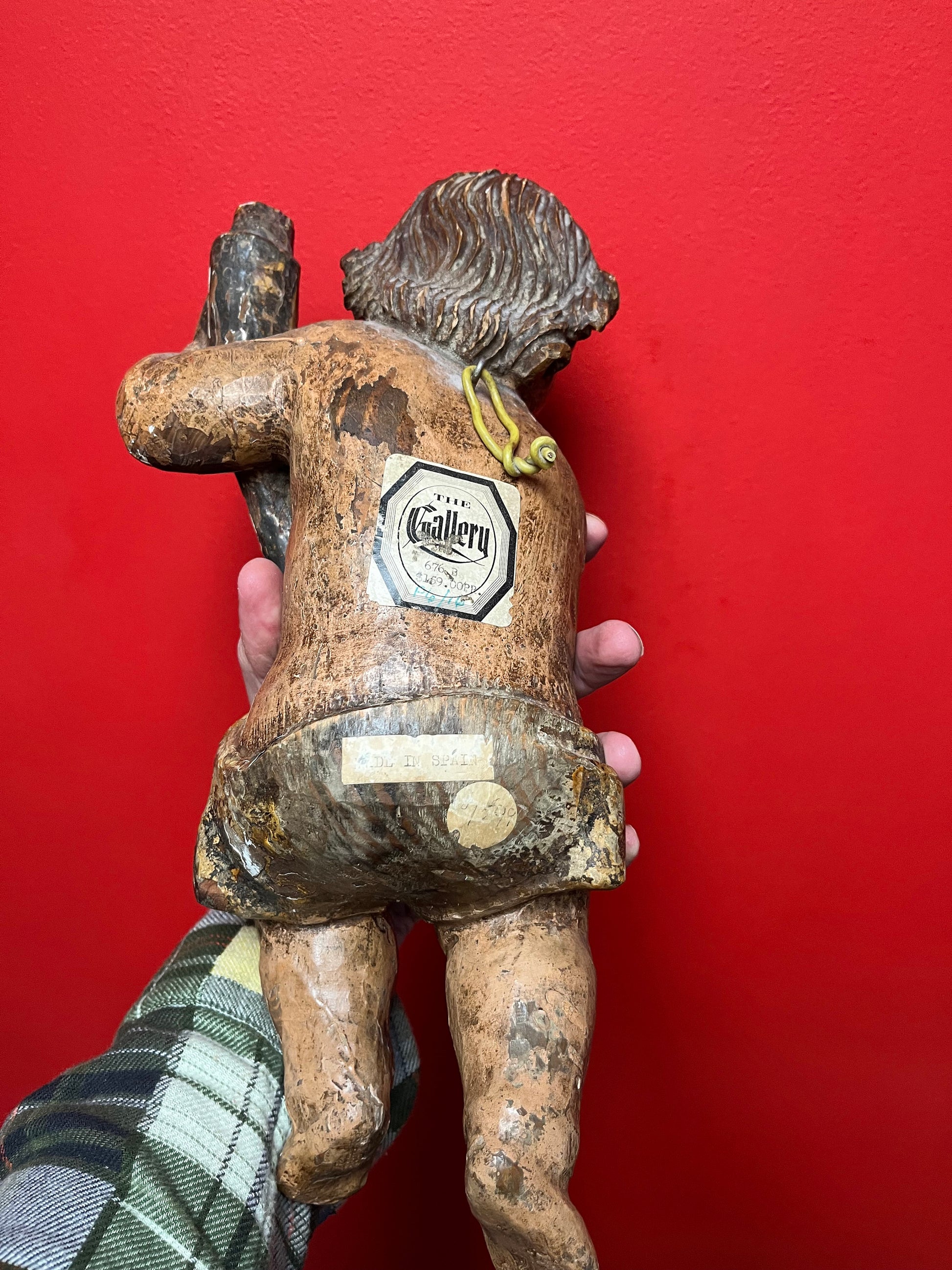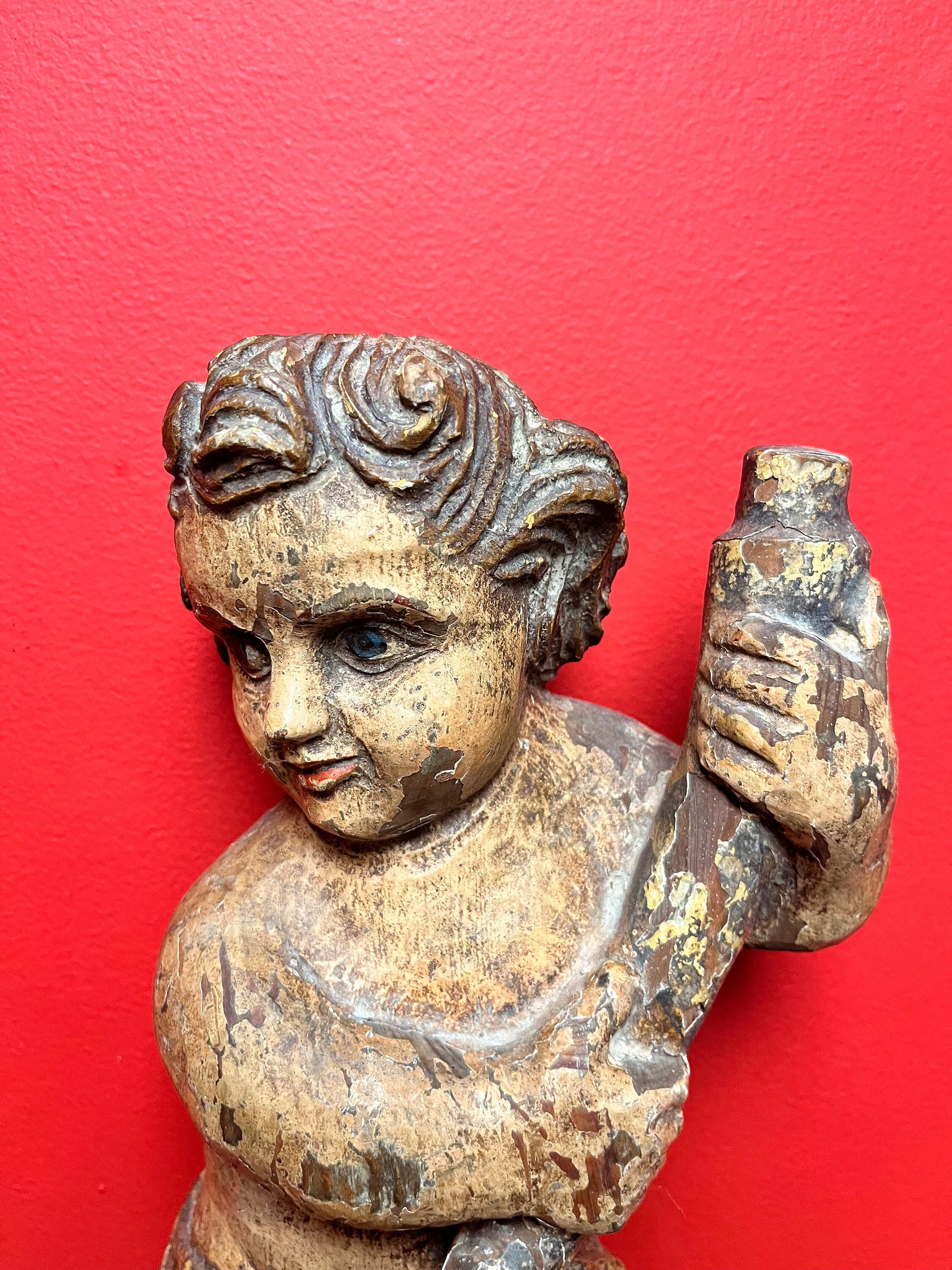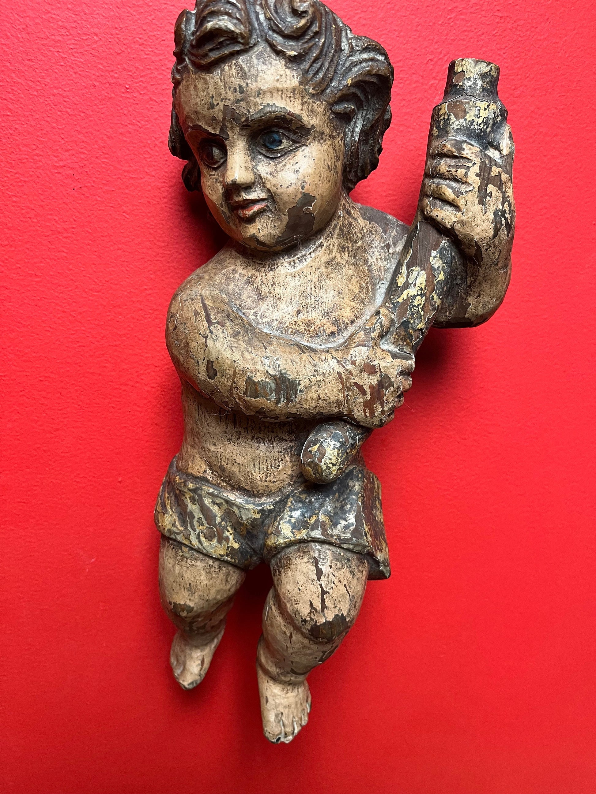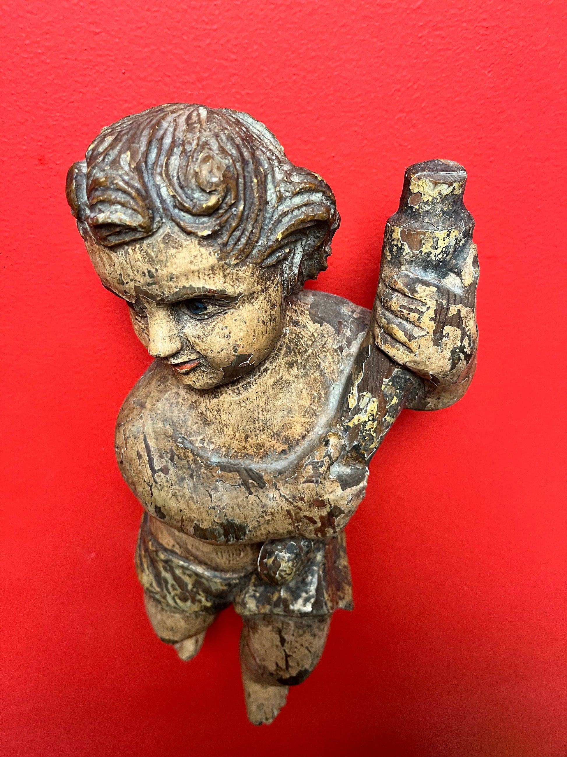 magnificent 14 inch tall late 19 century Spanish polychrome cherub plaque wonderful provenance on back exquisite patina