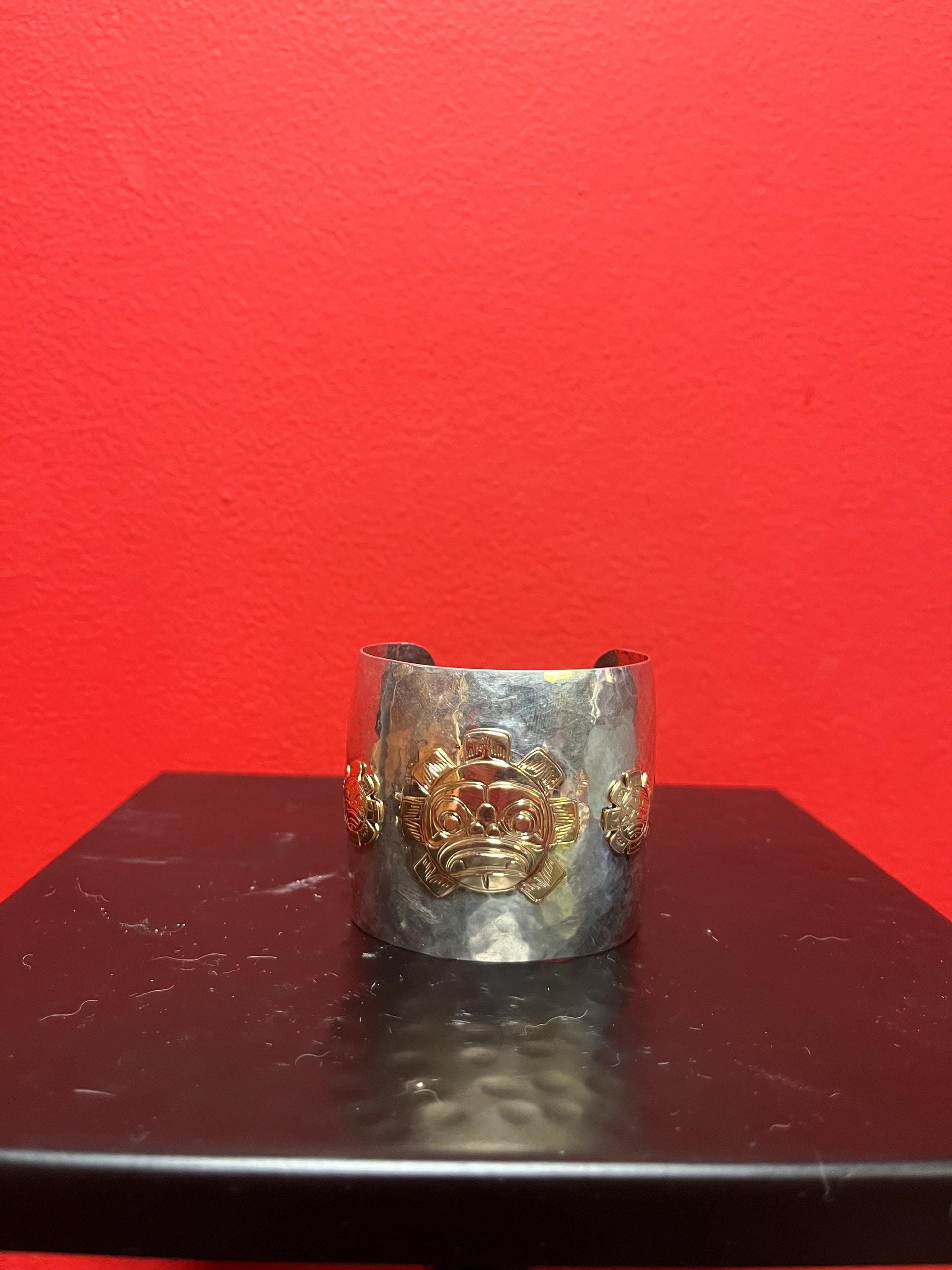 Magnificent signed heavy sterling and gold sun mask cuff indigenous, first nations, Pacific Northwest Coast 2 1/4 wide and 2 high and 7 circumference