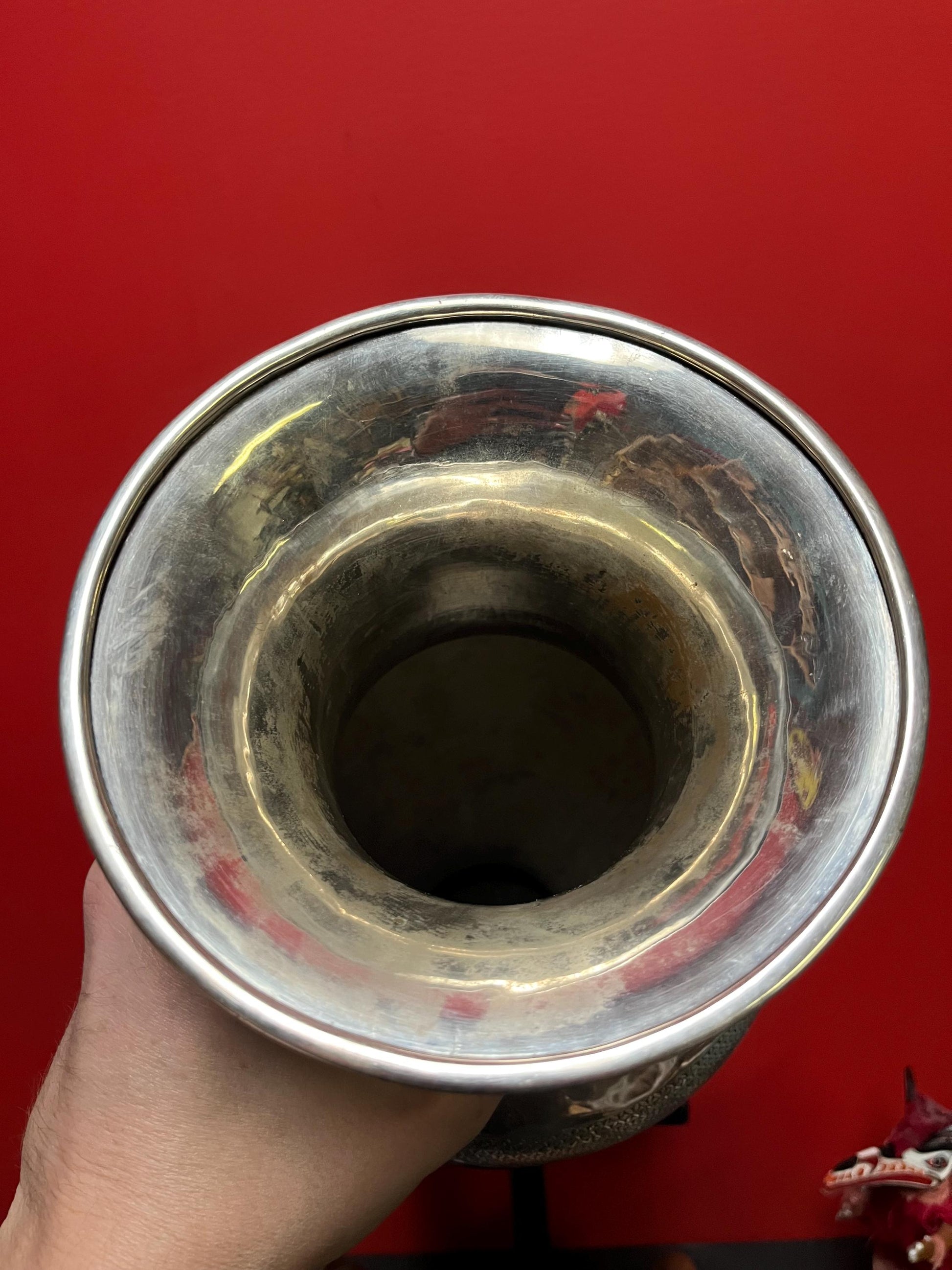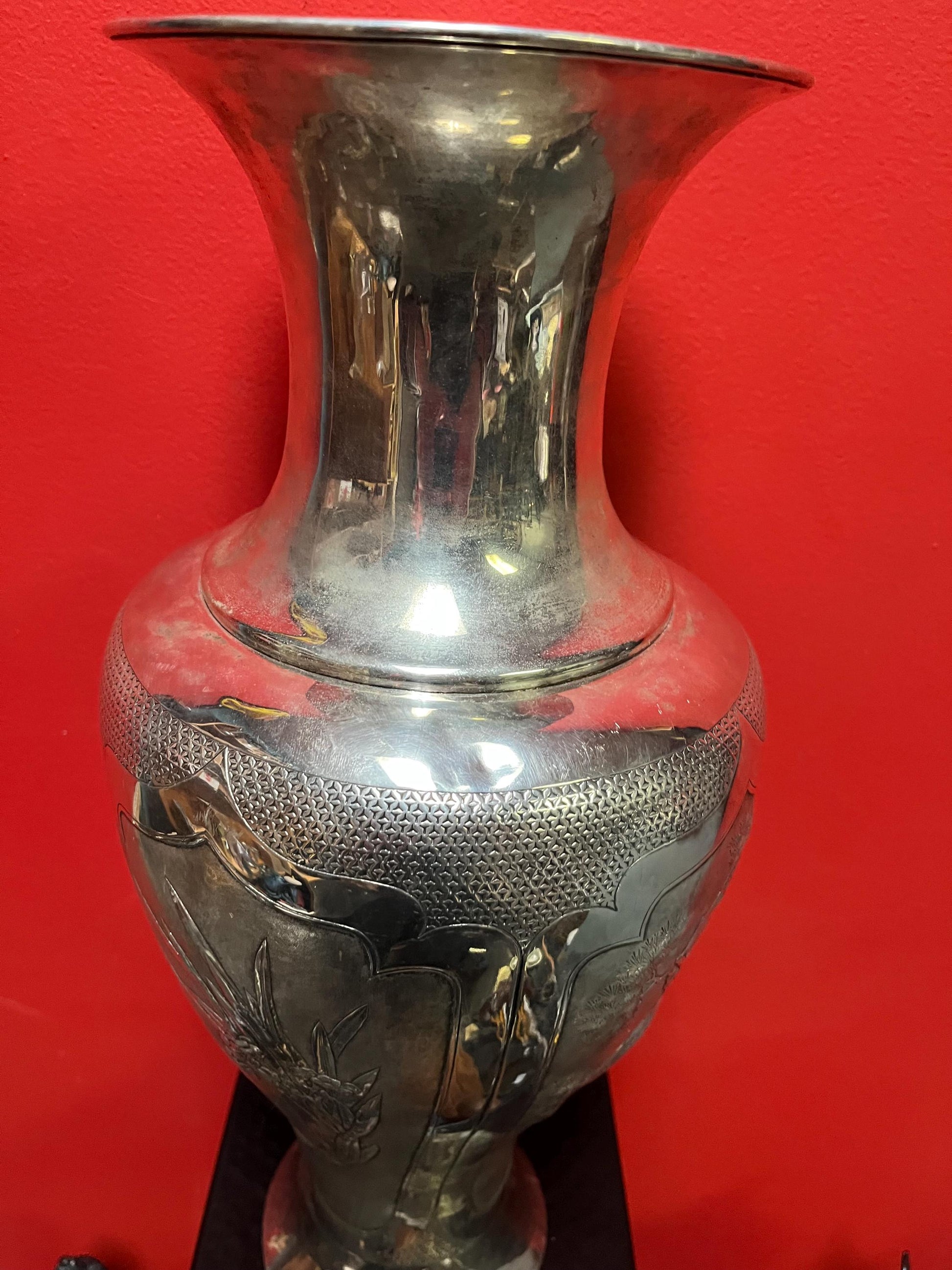 Massive 18 inch tall antique signed Japanese silver vase with amazing imagery see description for details