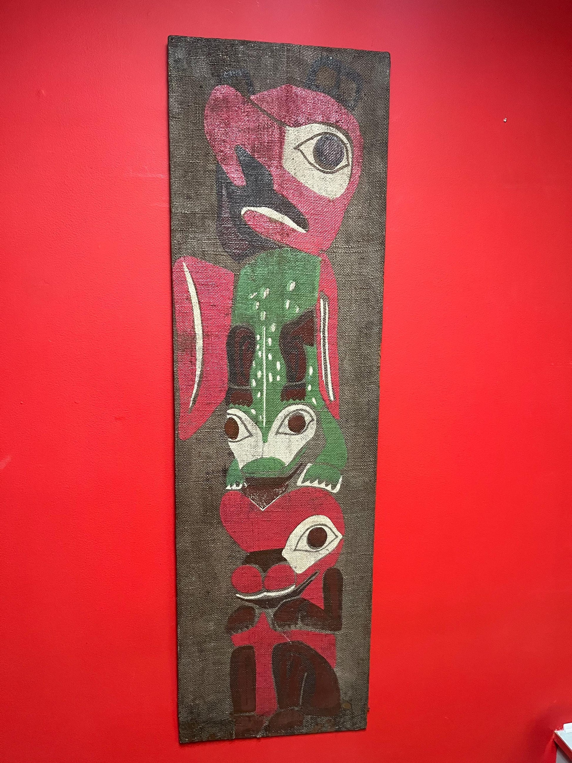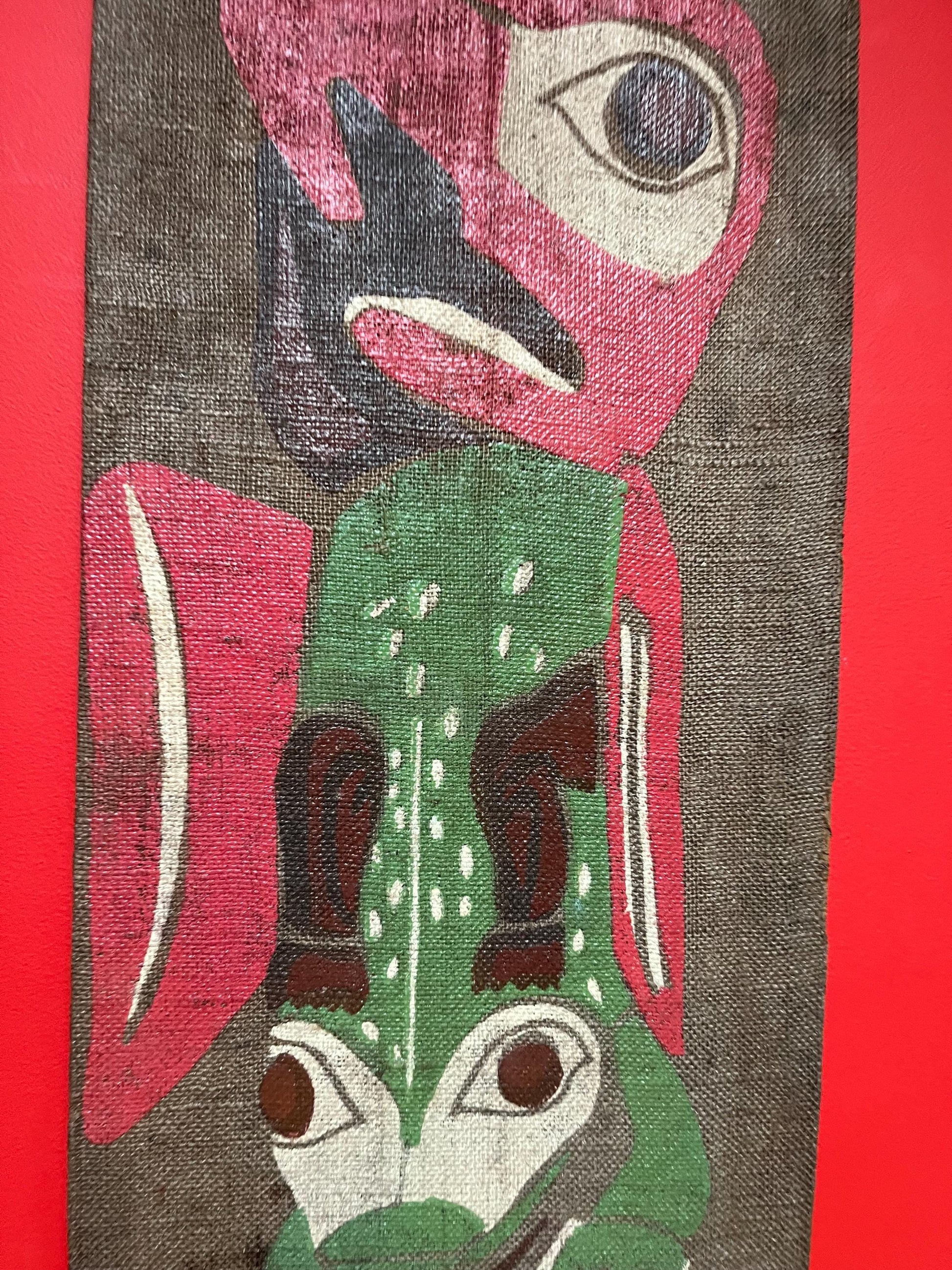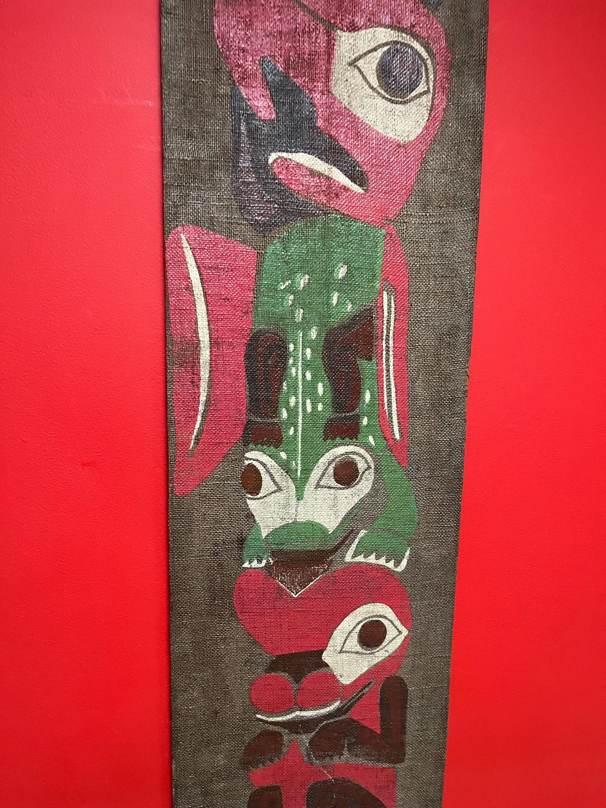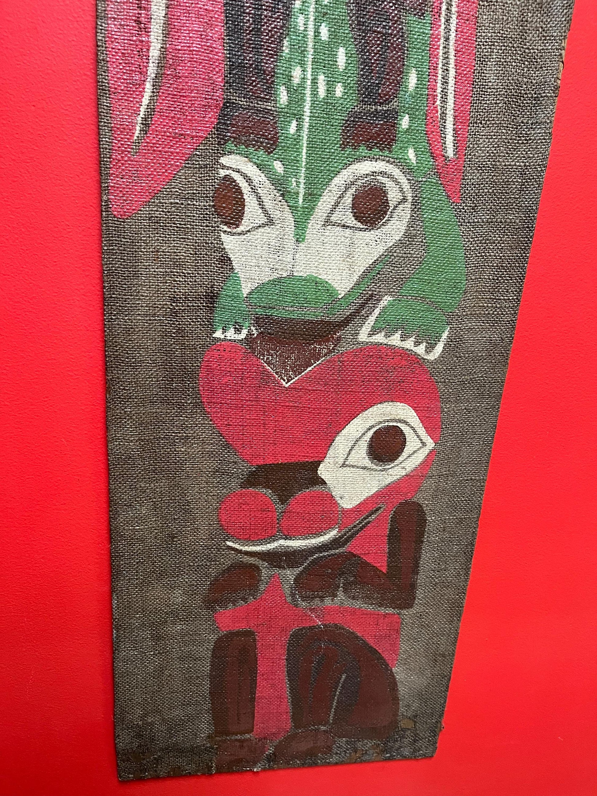 Very rare museum quality 19 century indigenous First Nations Pacific Northwest coast painted fabric on wood panel totem pole plaque art -47 x 14