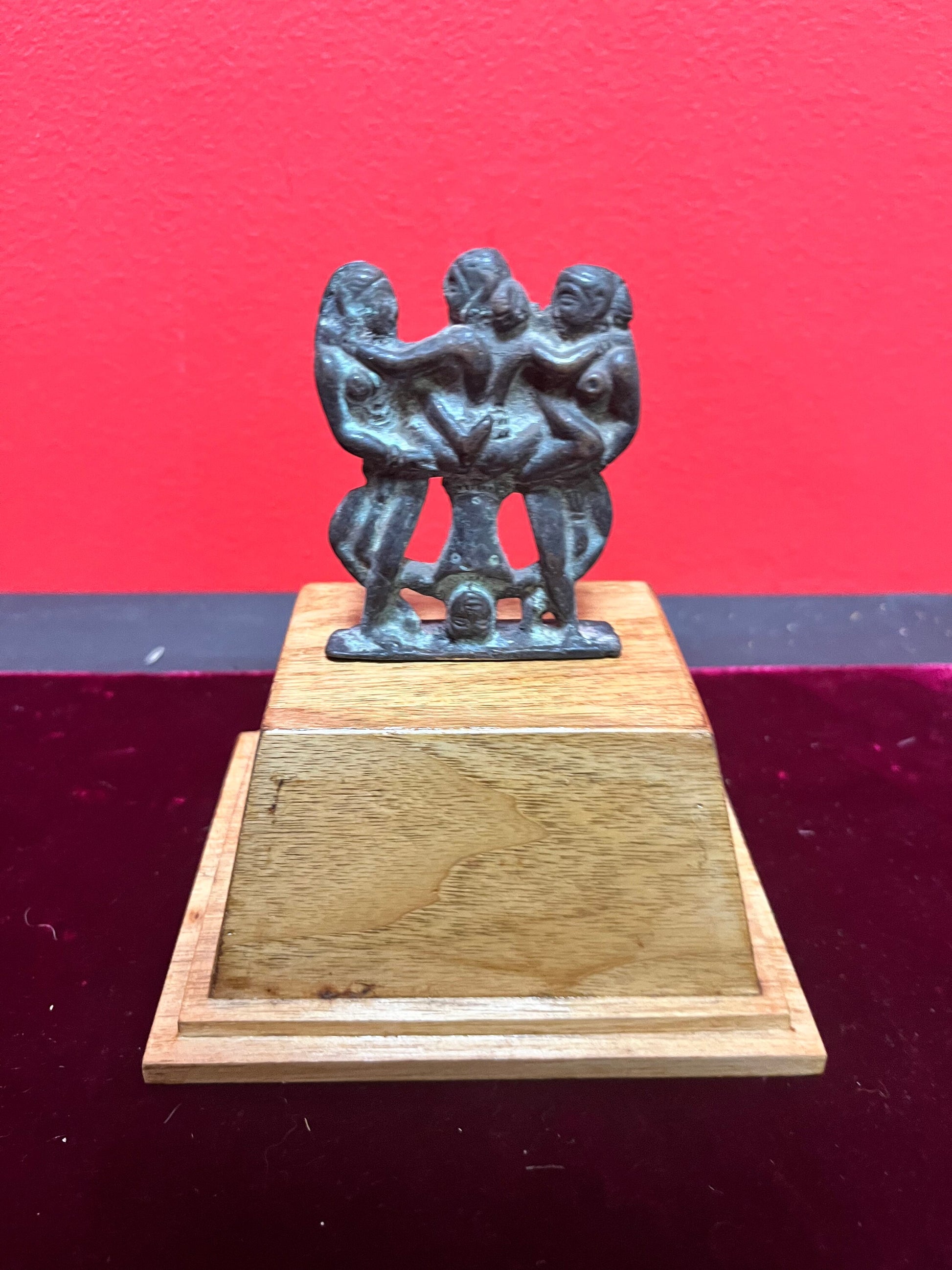 Museum quality 3 inch 18 century Indian karma Sutra bronze on 3 inch wooden stand created later great Patina amazing piece