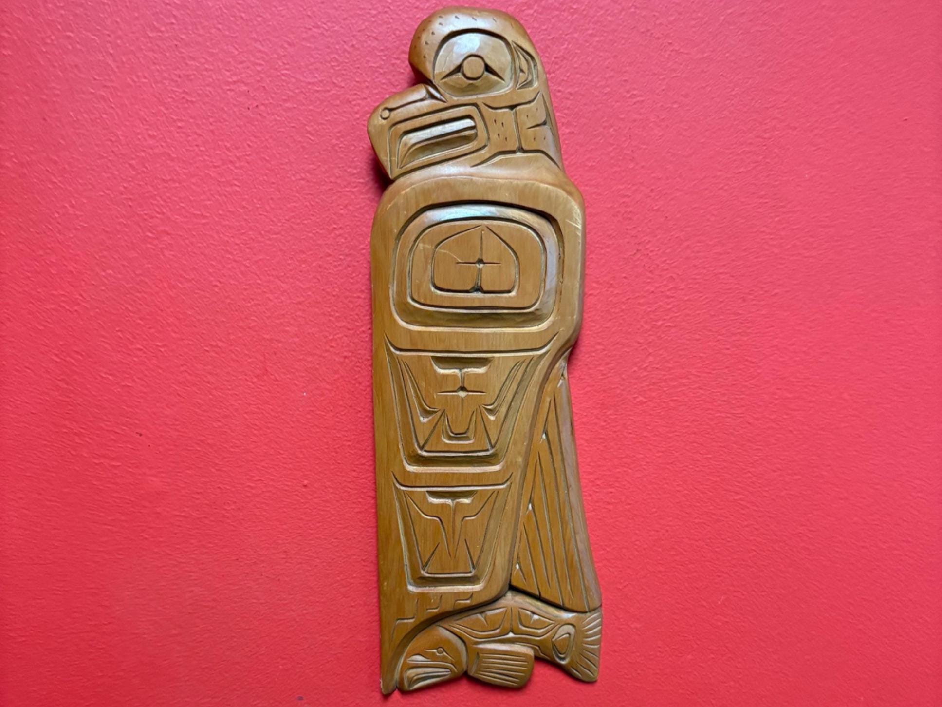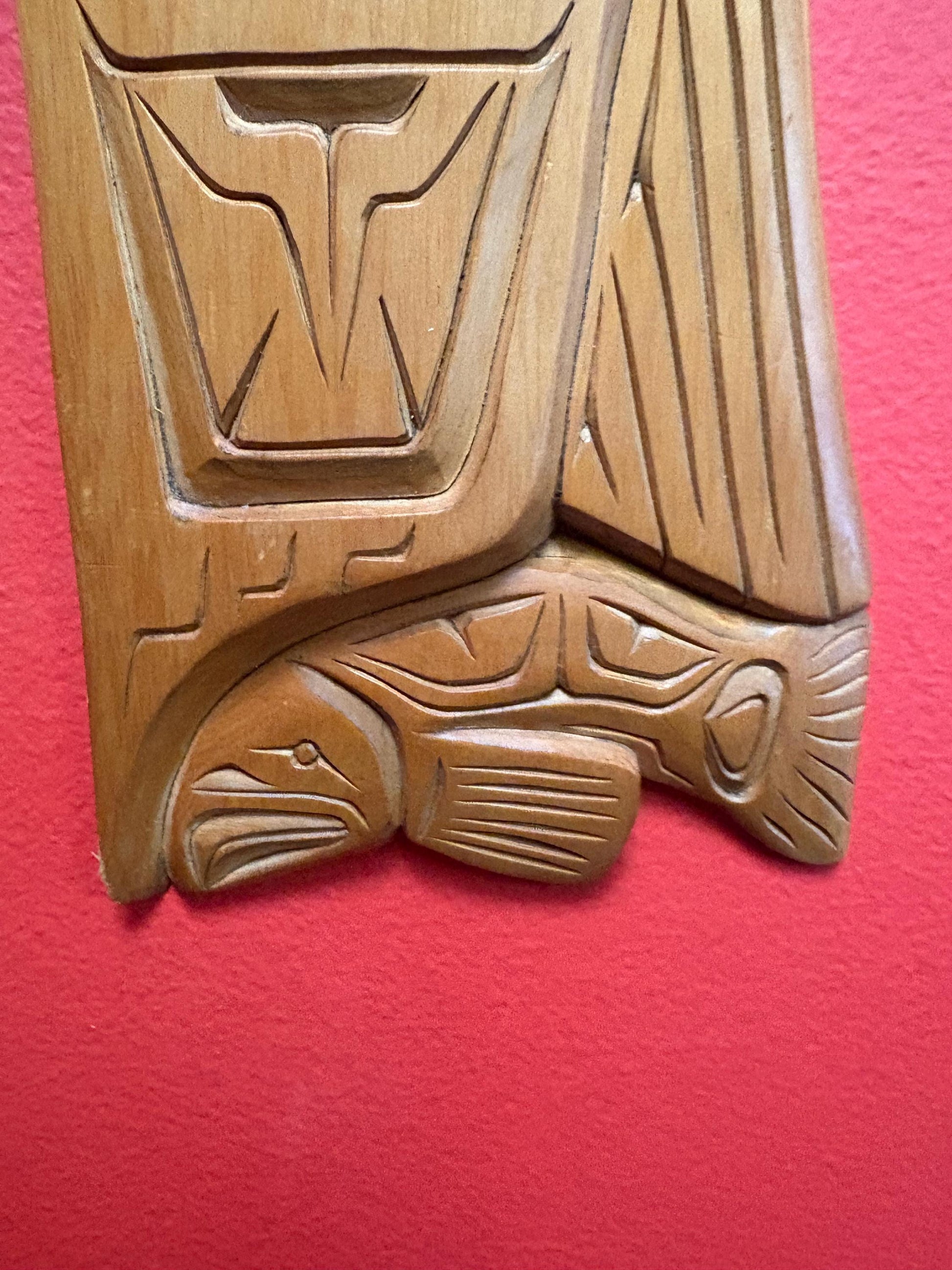 Nice quality indigenous first nations Pacific West Coast signed Cedar plaque of an eagle and salmon- 13 x 4 wide great value
