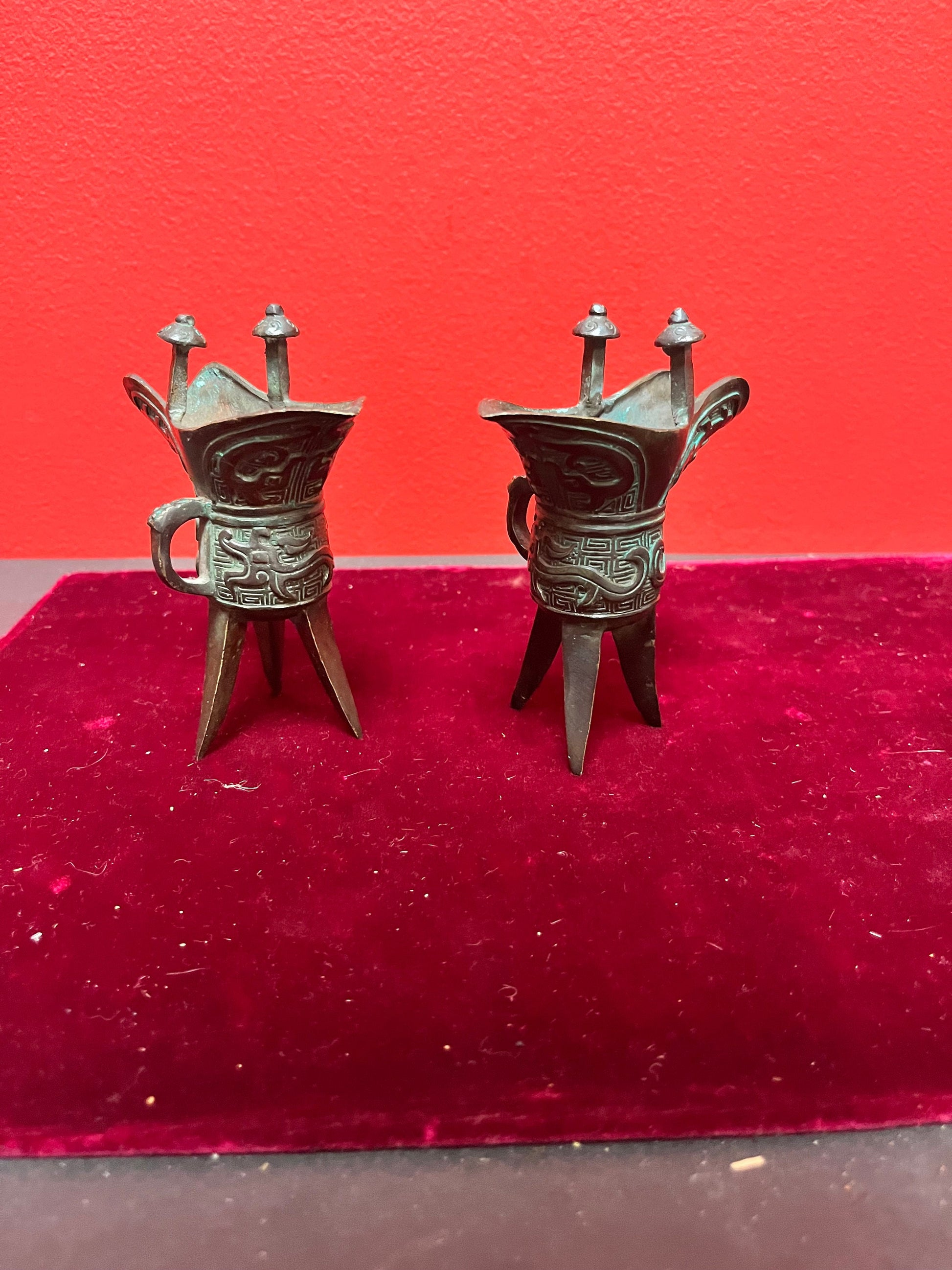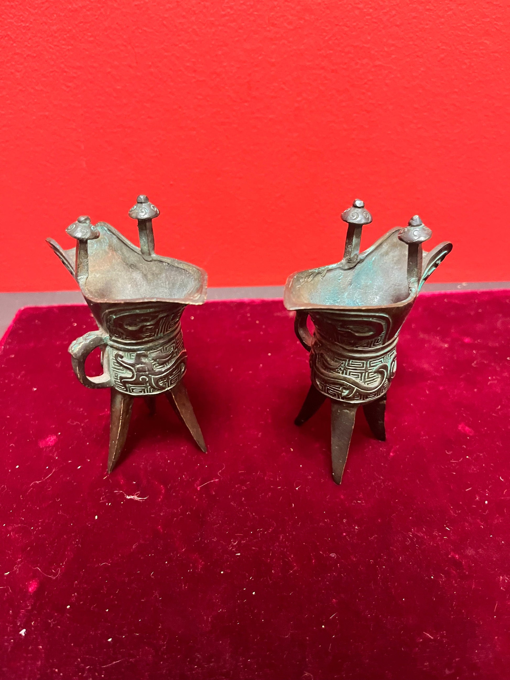 Pair of old Chinese, 5 inch high bronze vessels wonderful Patina