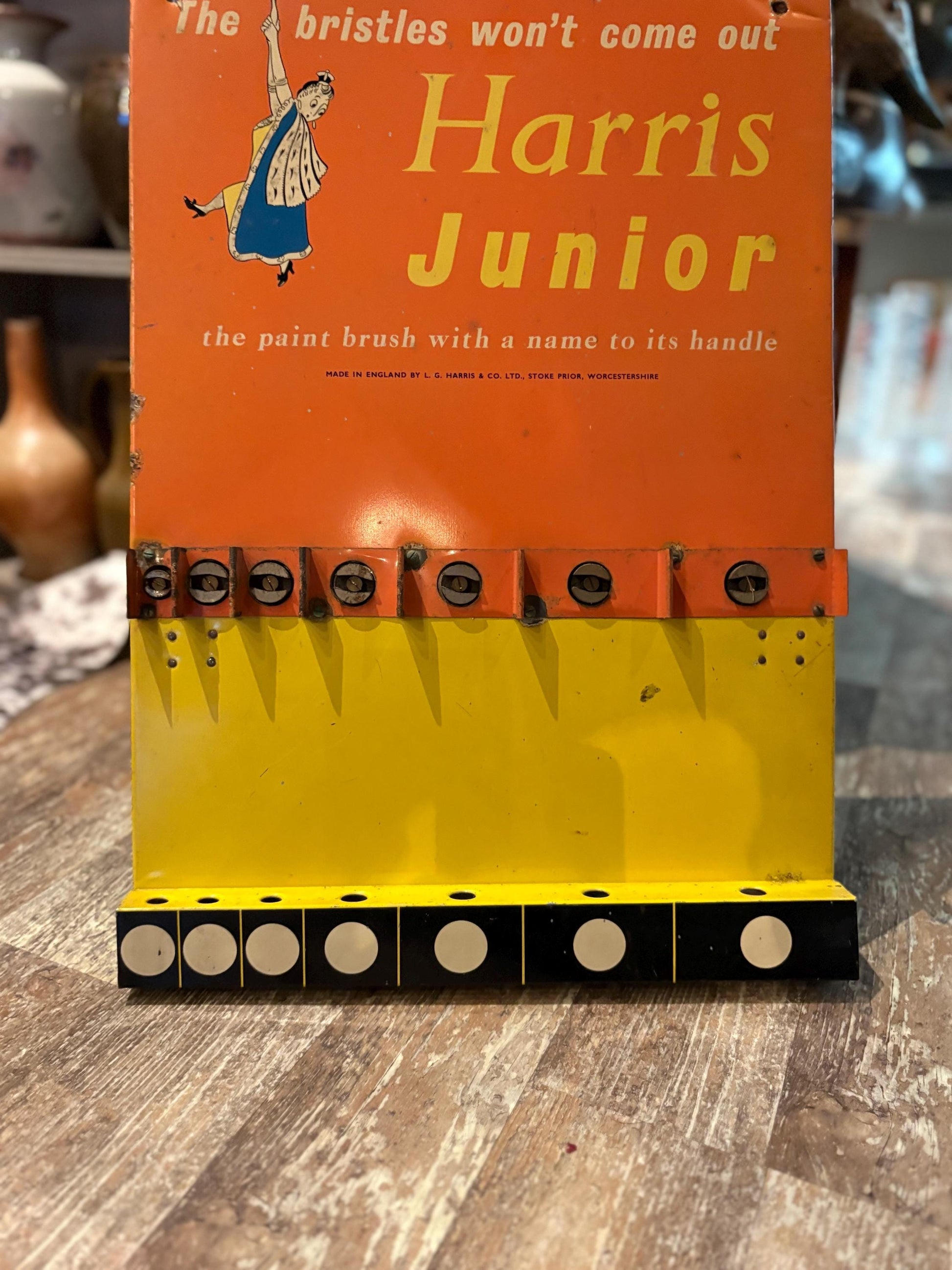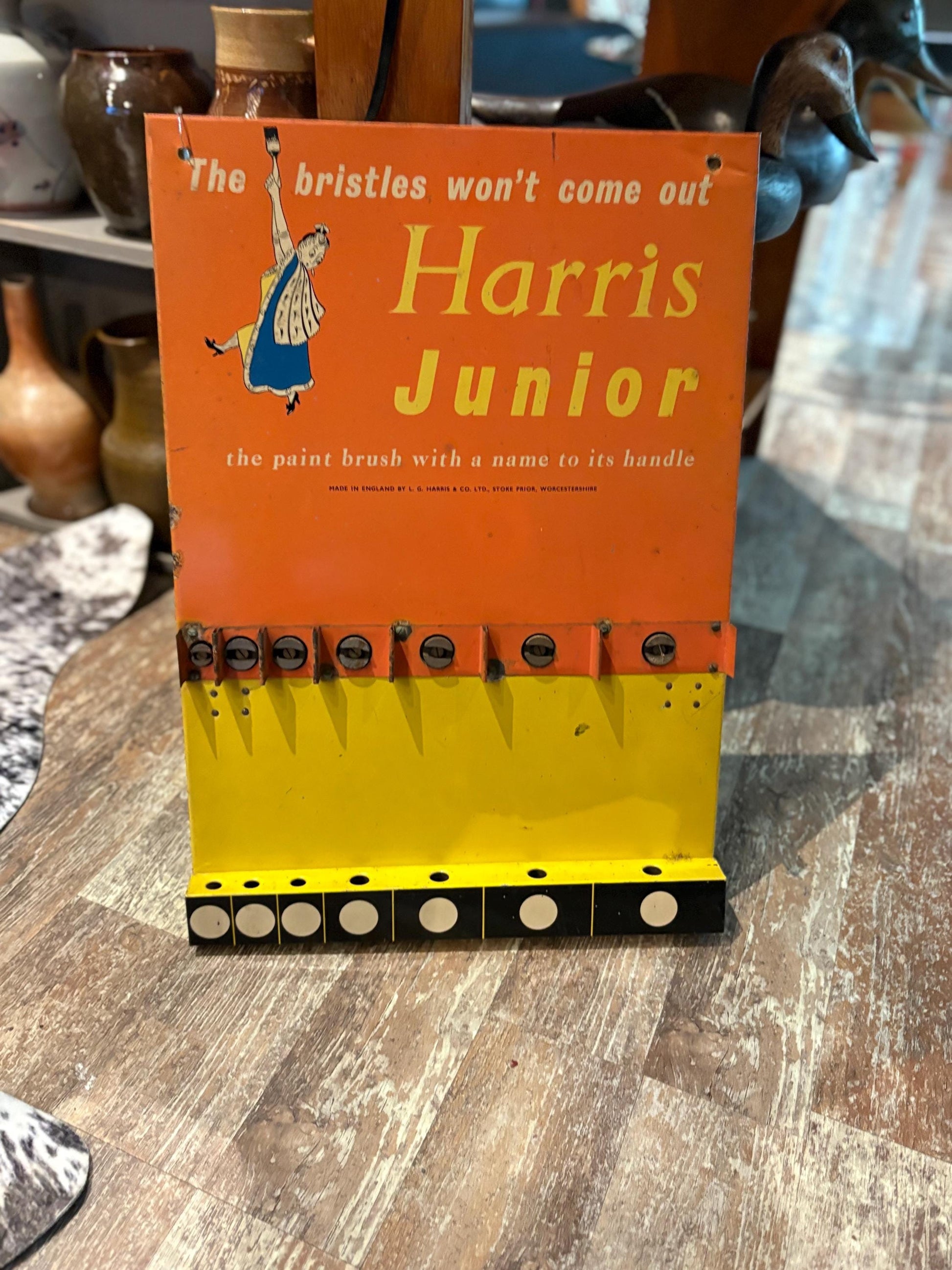 Rare antique Harris Junior paintbrush advertising holder in amazing condition - stand or hang - wonderful imagery - 20 x 13“ wide