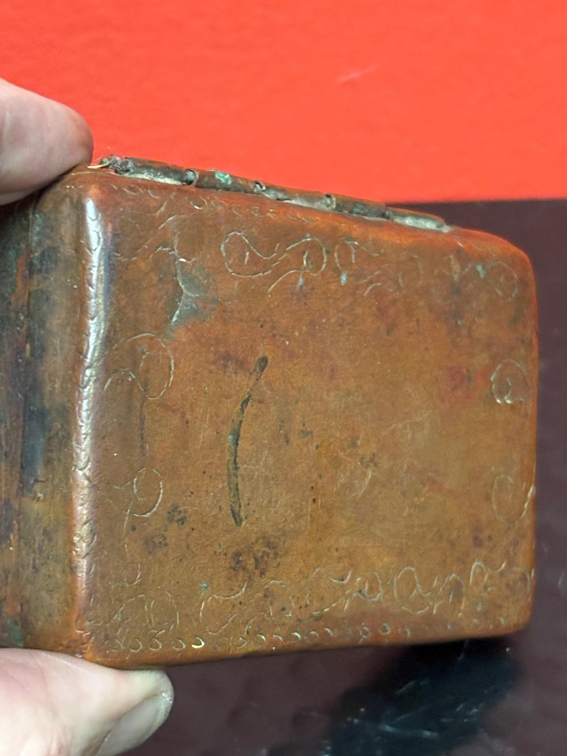 Remarkable ancient Chinese copper snuff box 4 x 2.5 x .5 high- intensely simple wow