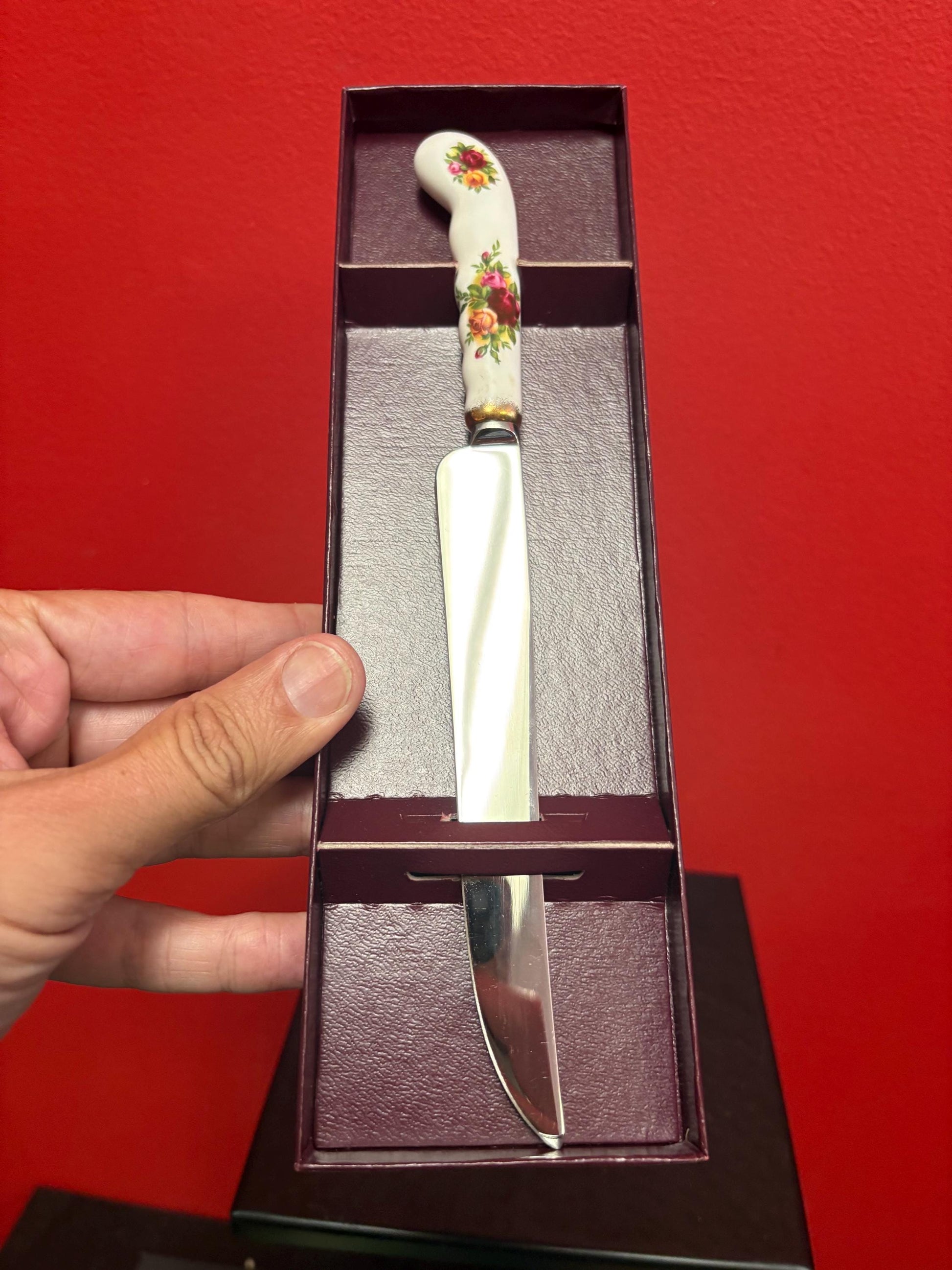 Royal Albert old country Rose 9 1/2 inch long bread knife in original box — brand new condition- wow