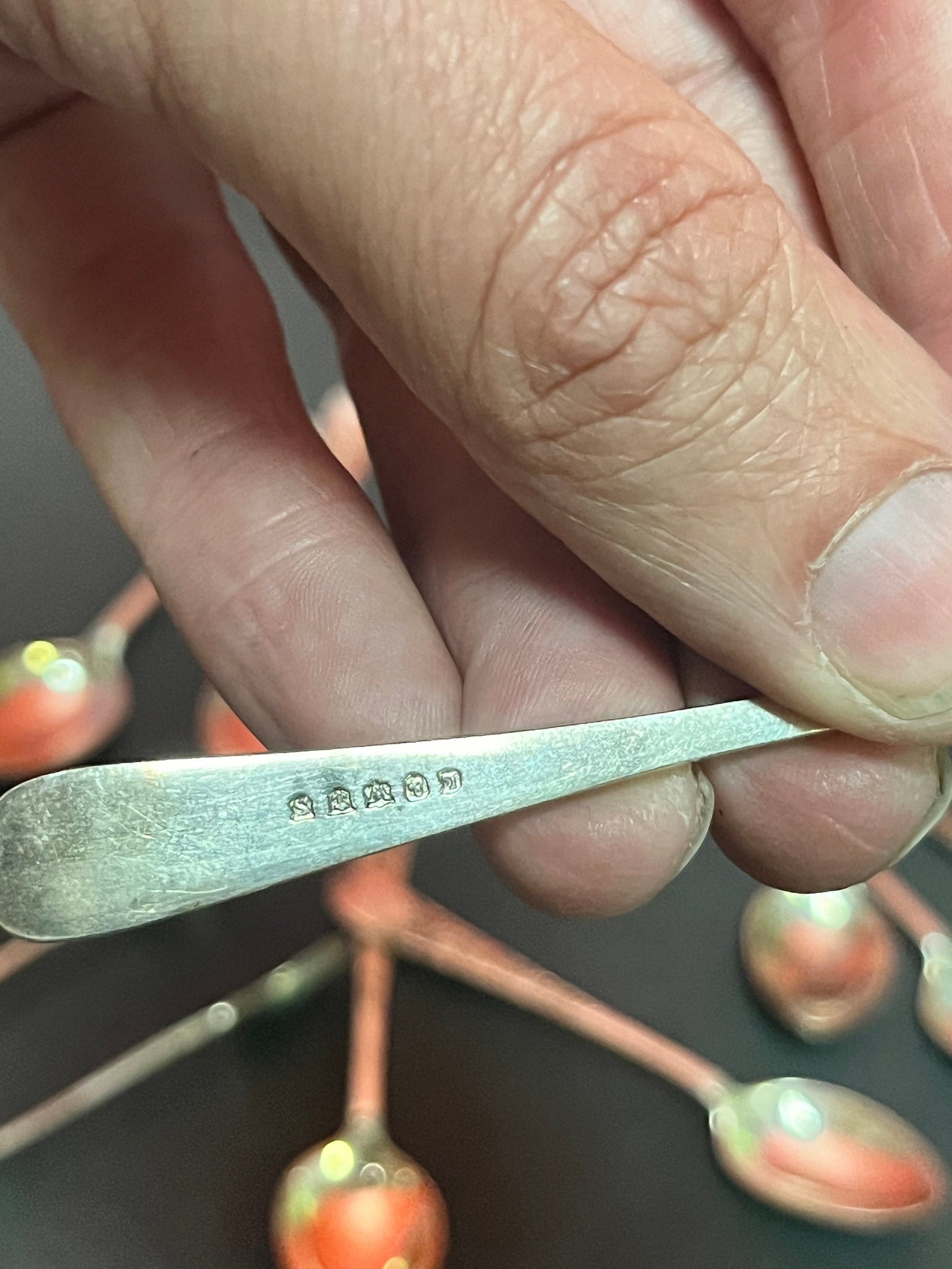 Set of 12 English sterling silver hallmarked teaspoons and sugar tongs pretty design and needs a quick polish great value