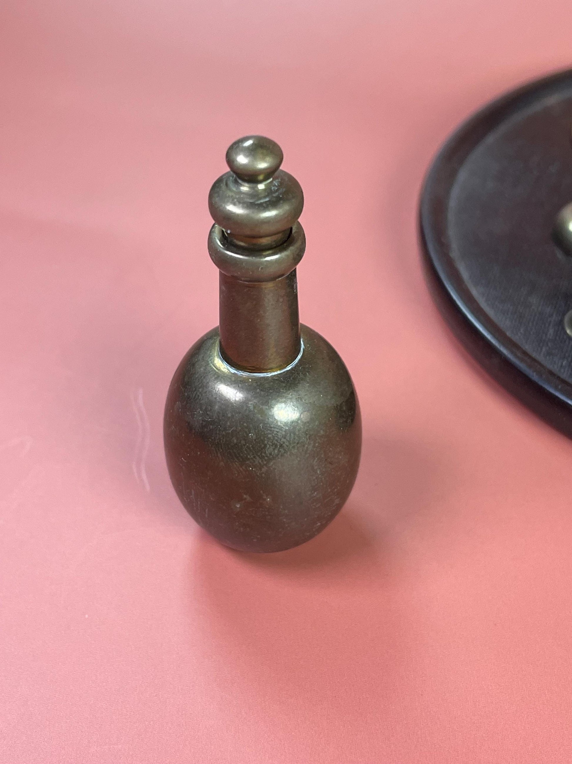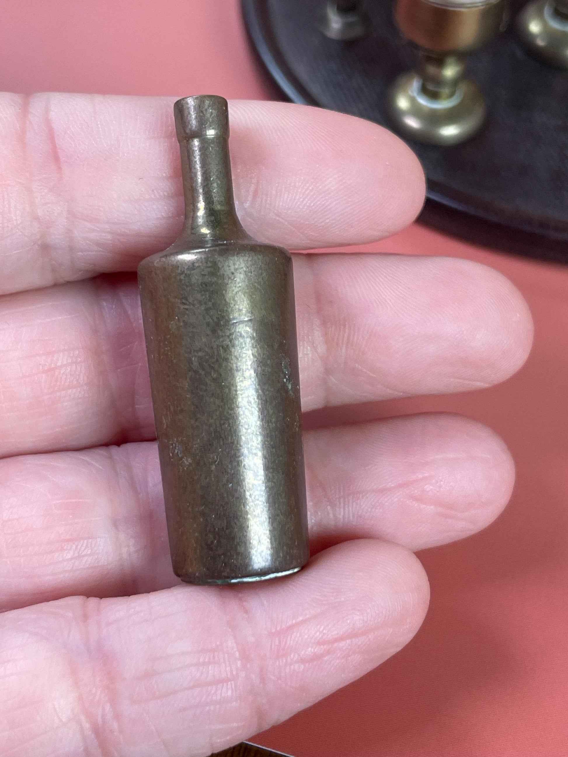 This 11-piece heavy brass miniature wine bottle and goblets set includes a matching tray, with the tallest bottle measuring 2.25 and the smallest goblet 0.75. A charming and elegant set, perfect for display or a gift for wine lovers.