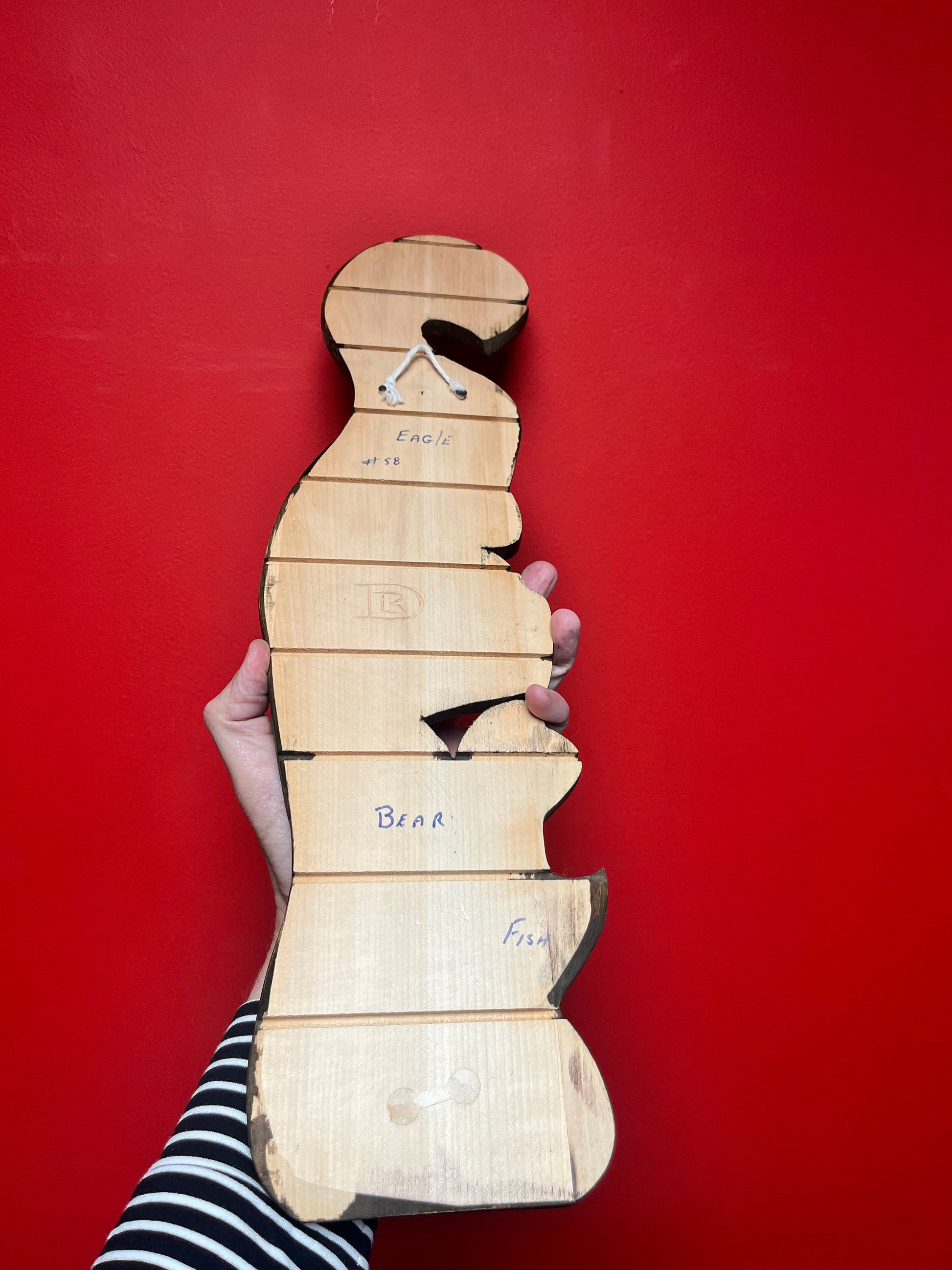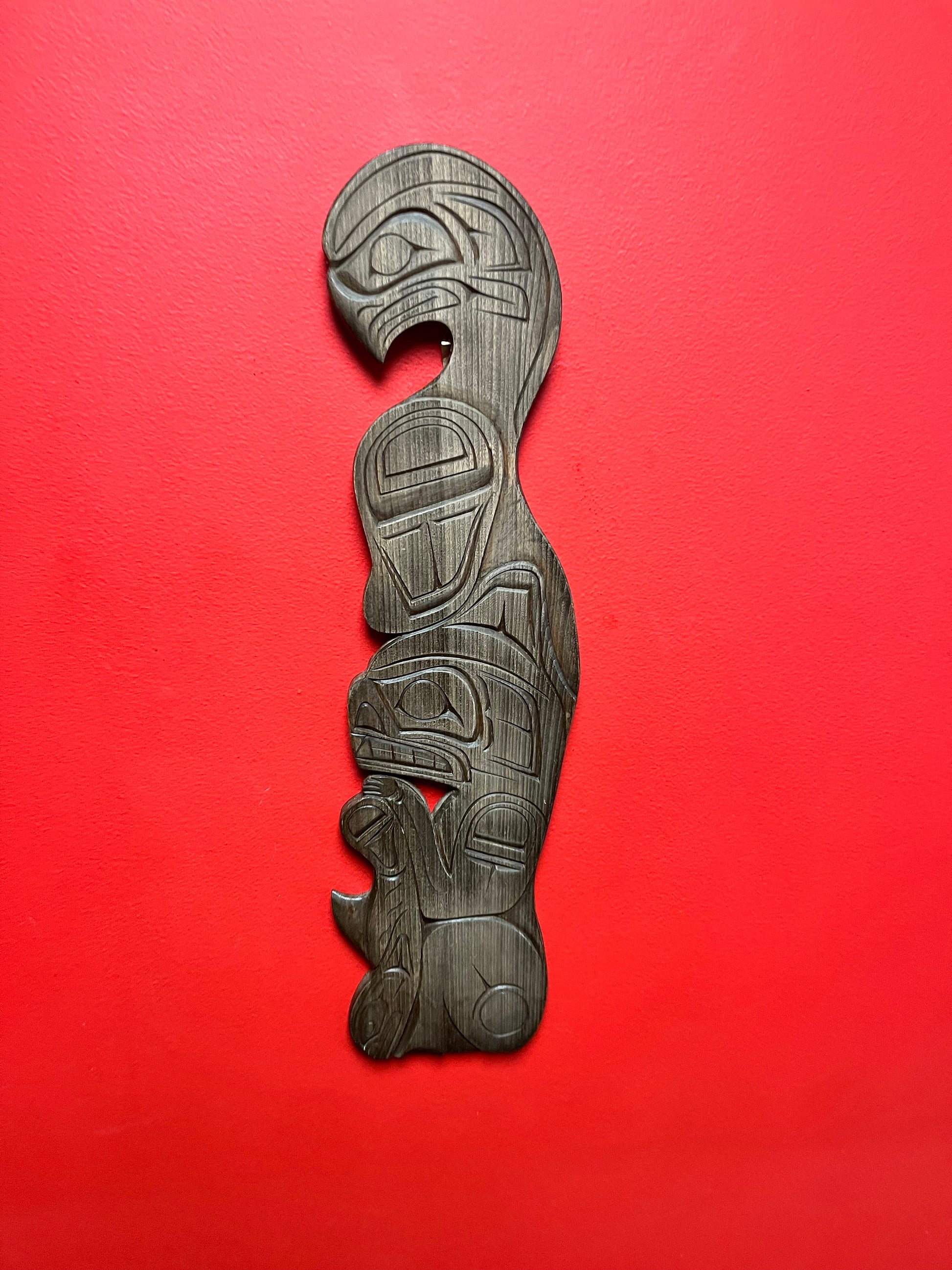 Signed 21 x 5 inch Wide indigenous first nations Pacific Northwest coast plaque of an eagle bear and fish