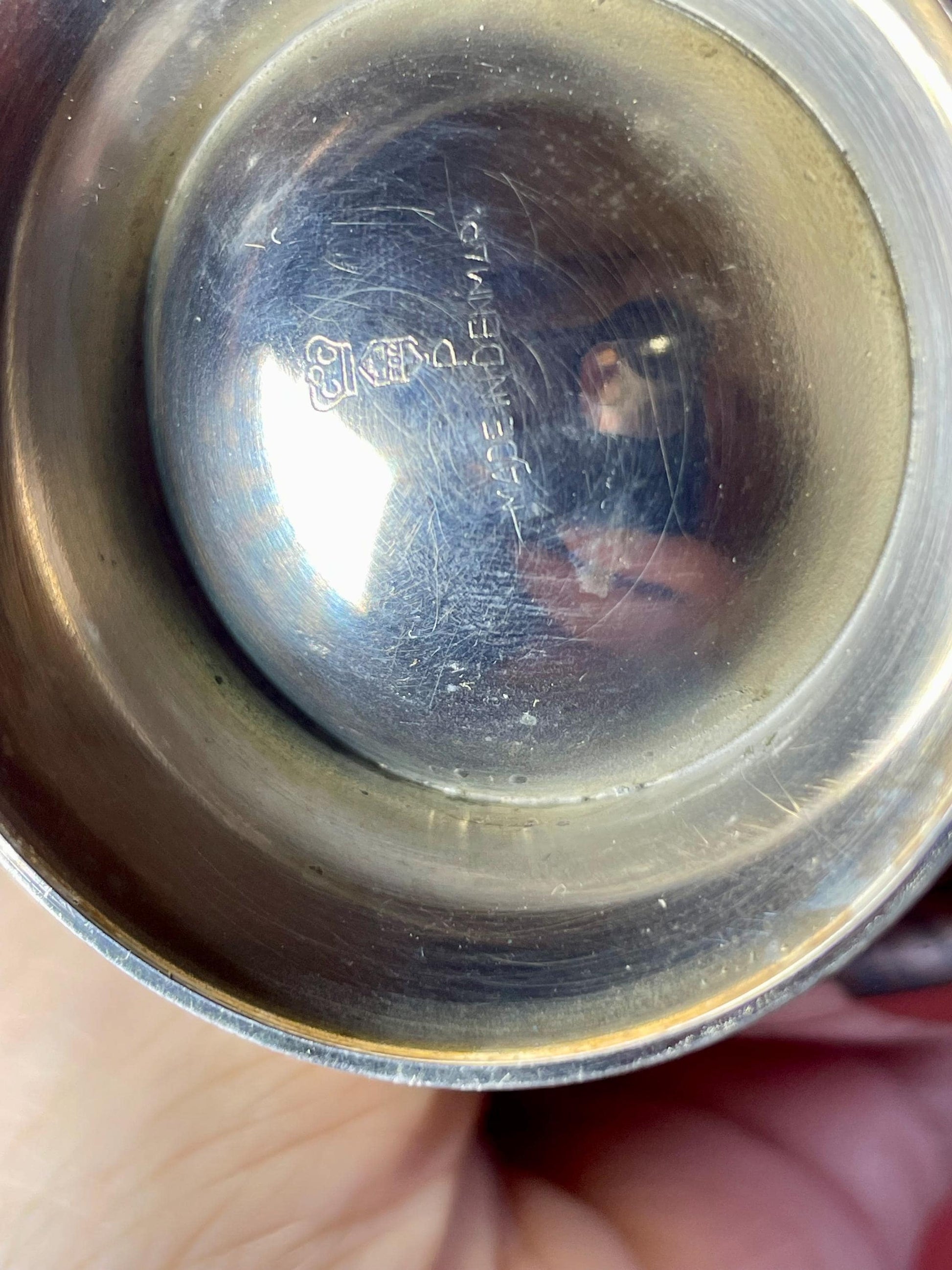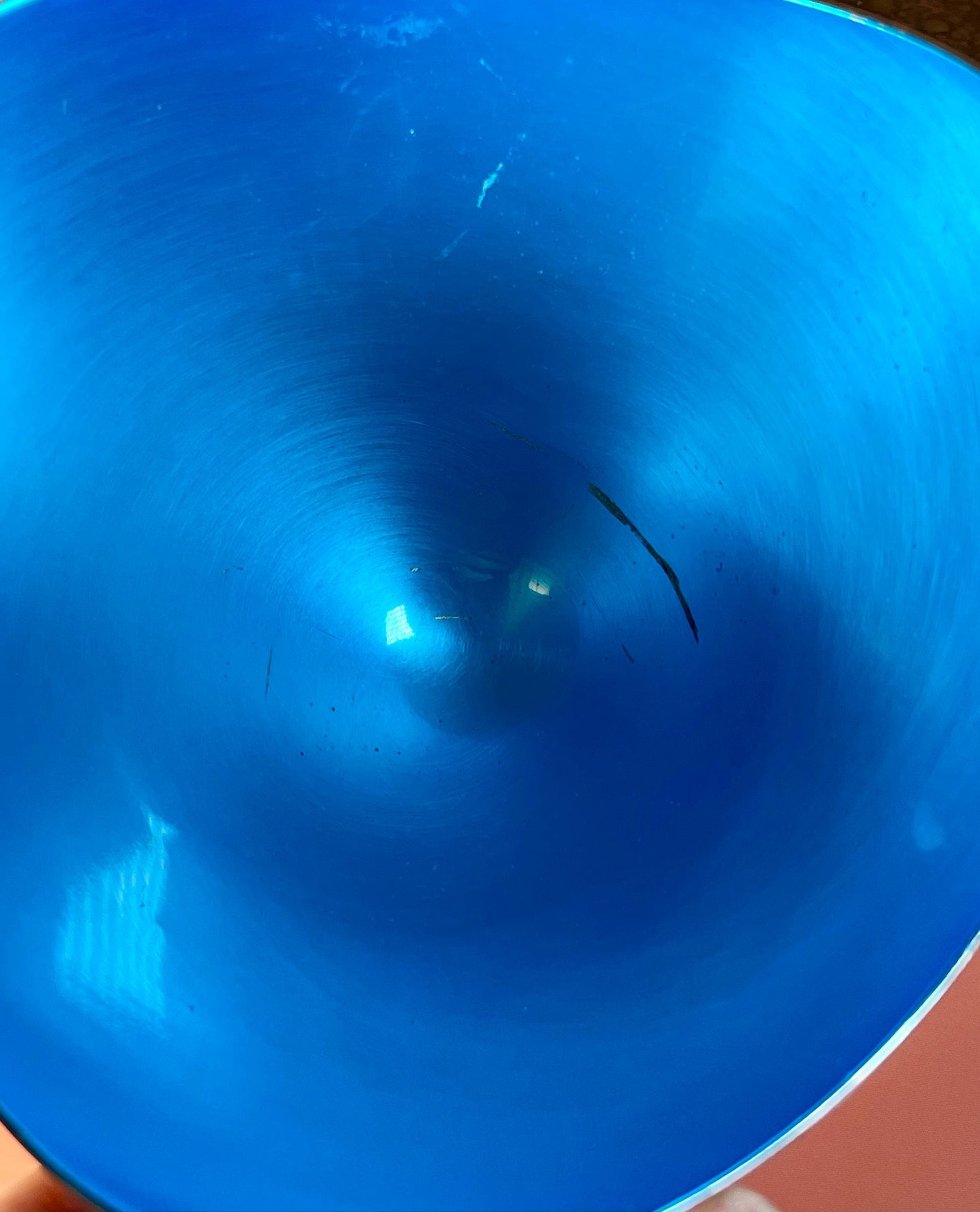 This elegant enamelled silver plate bowl, signed, in the Georg Jensen style, measures 3.5 inches and features a unique design with a single scratch on the inside.