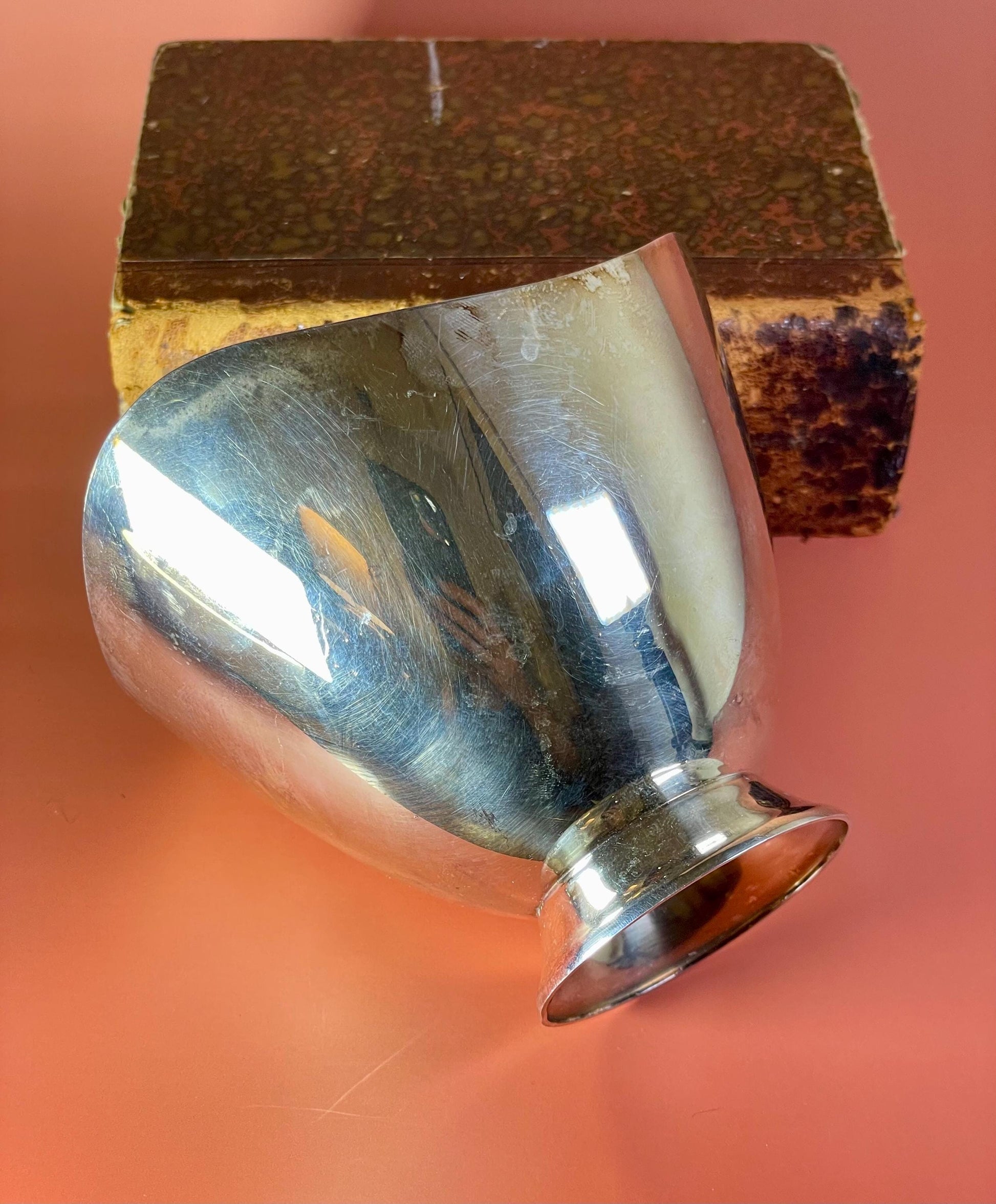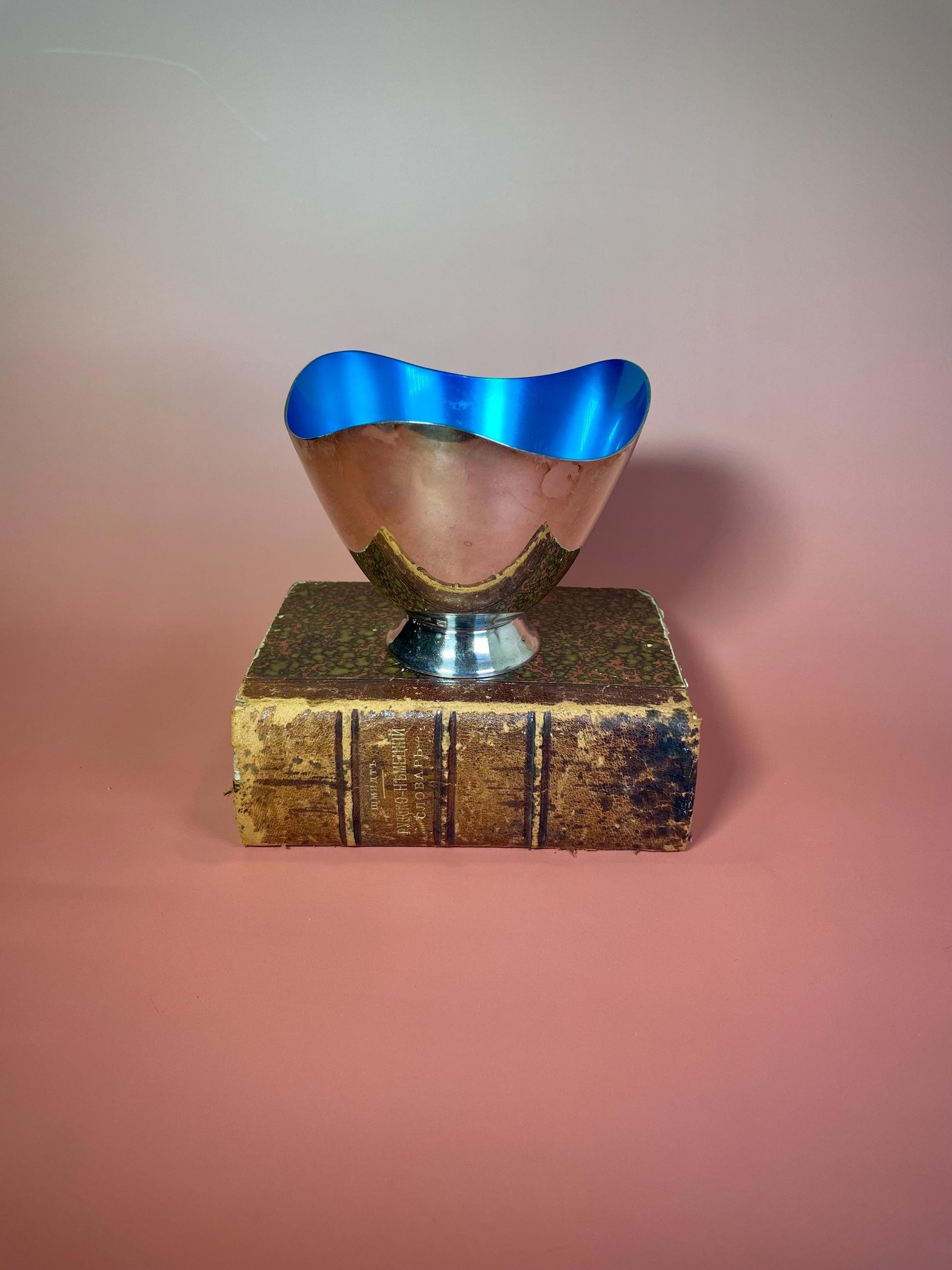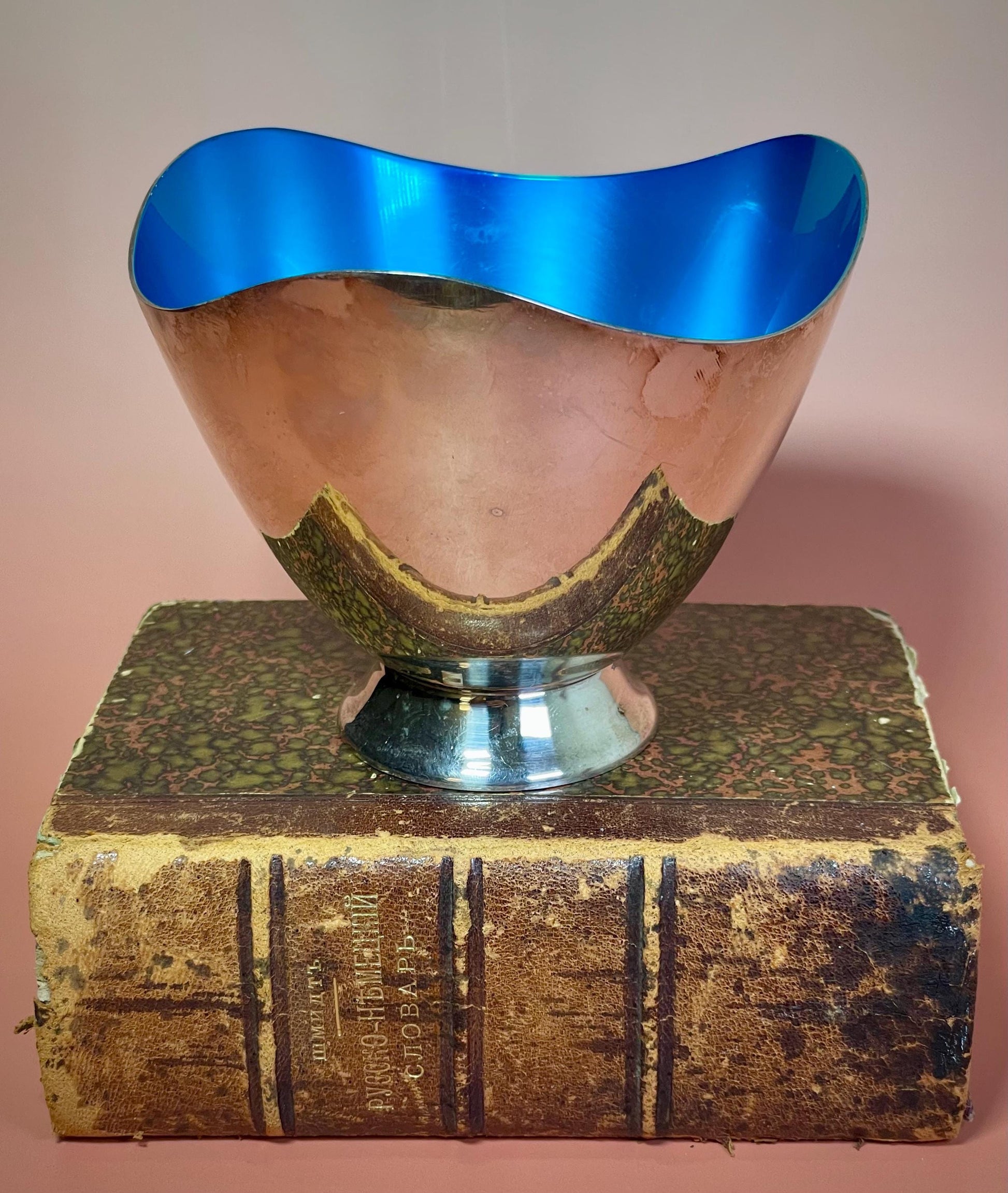 This elegant enamelled silver plate bowl, signed, in the Georg Jensen style, measures 3.5 inches and features a unique design with a single scratch on the inside.