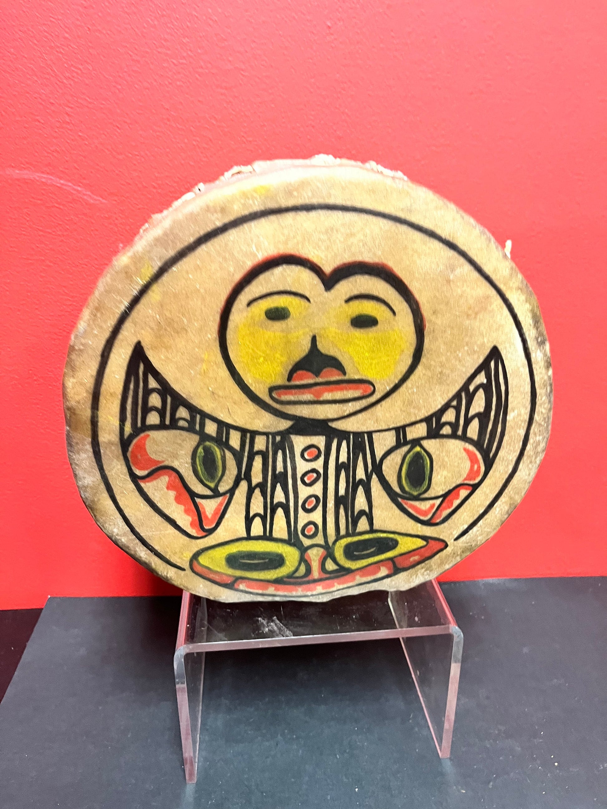 Stunning 10 by 5 inch deep museum quality indigenous first Nations Pacific Northwest coast antique drum with great sound wow