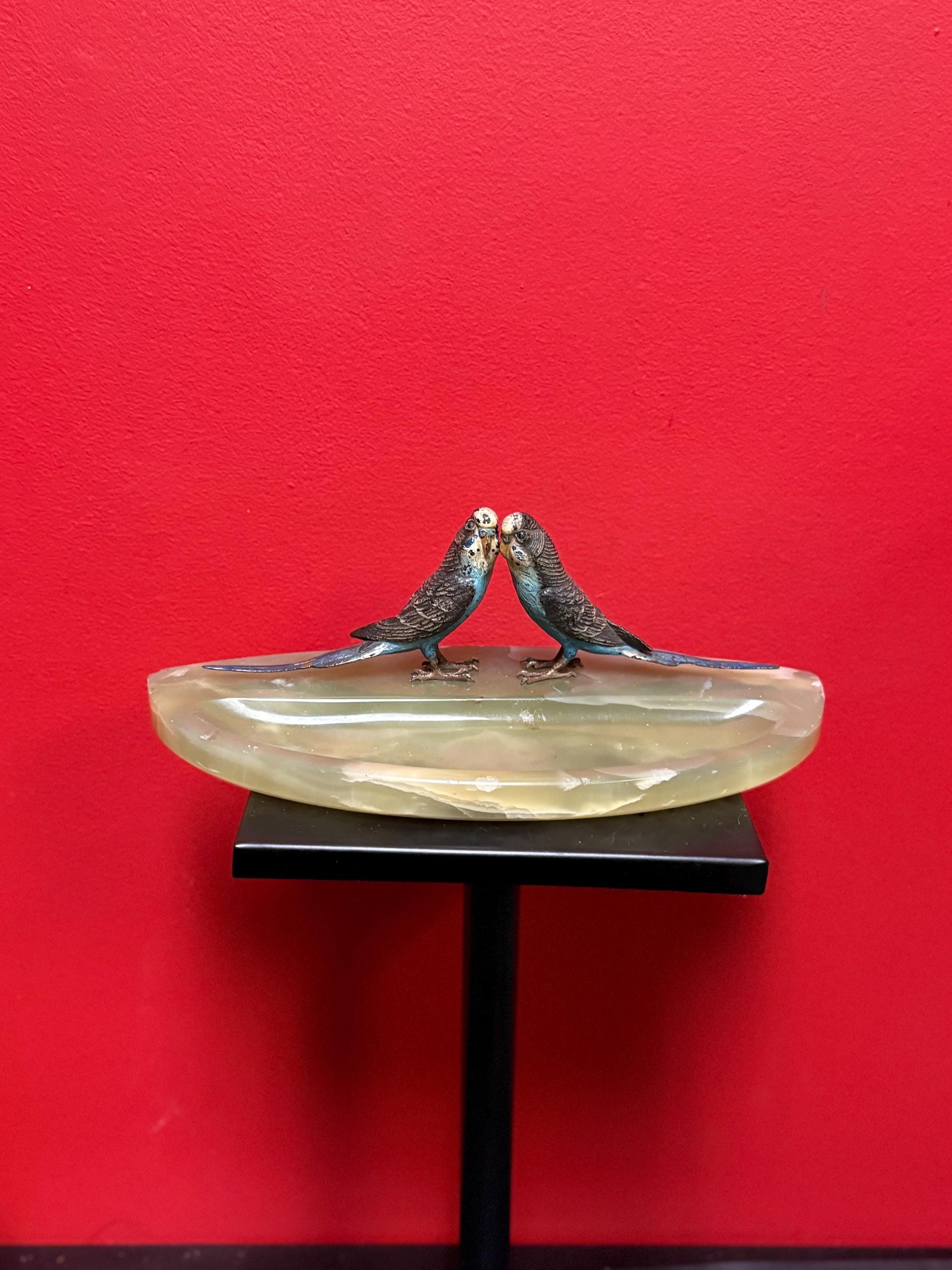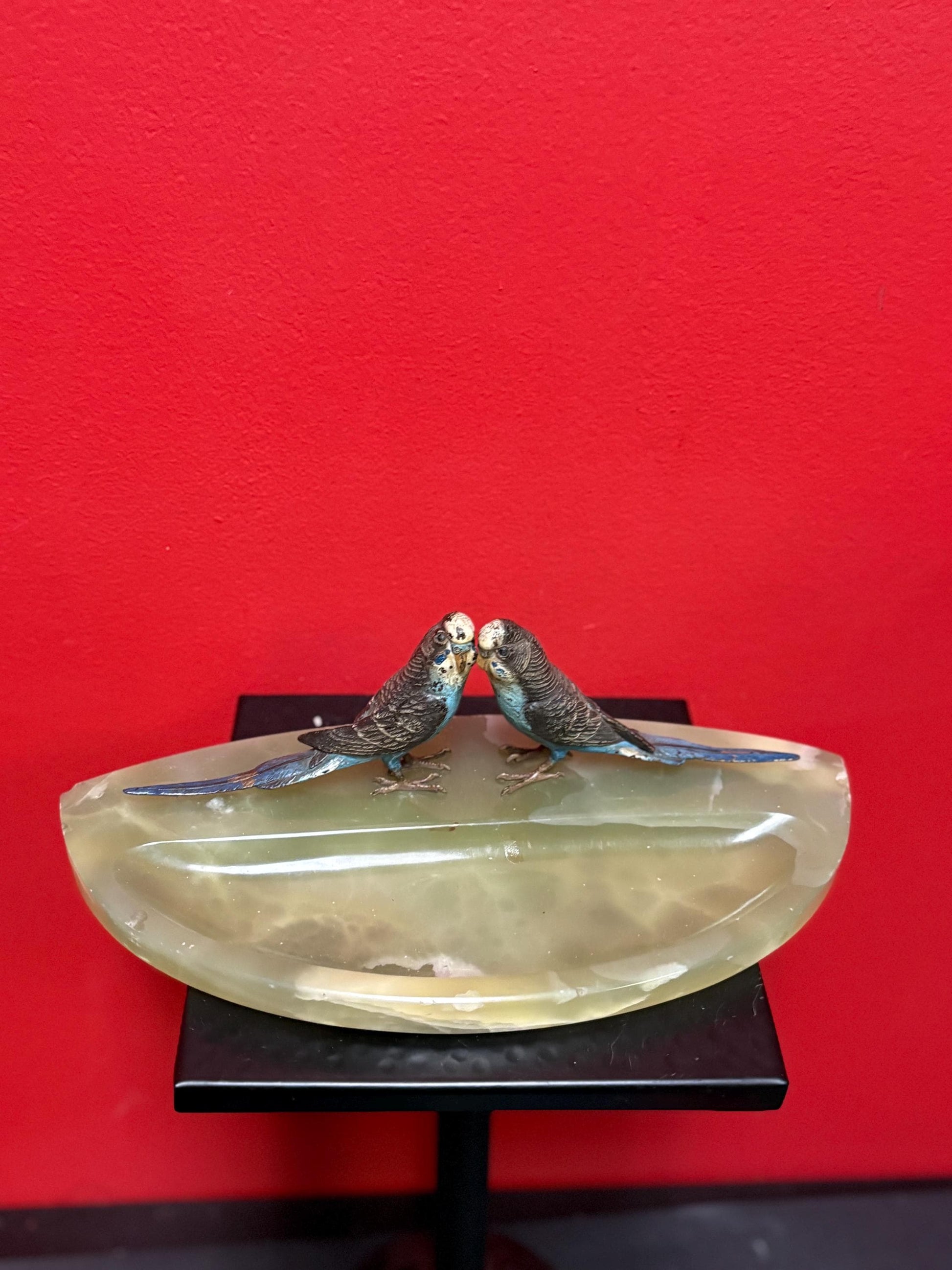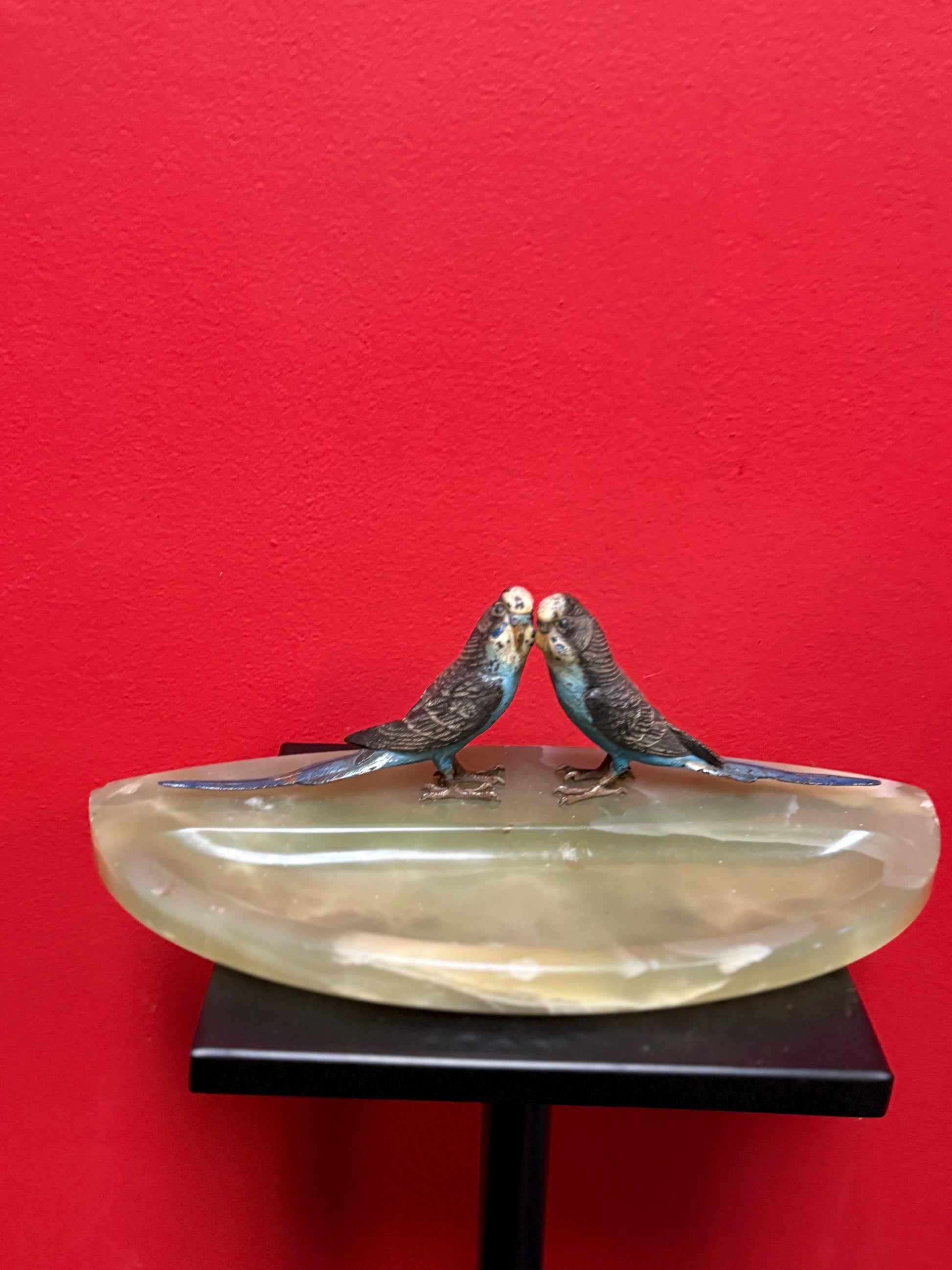 Stunning 11 x 5.5 x 3 inch high Austrian cold painted bronze budgies on onyx base — possibly Franz Bergman — small chips on base — wonderful