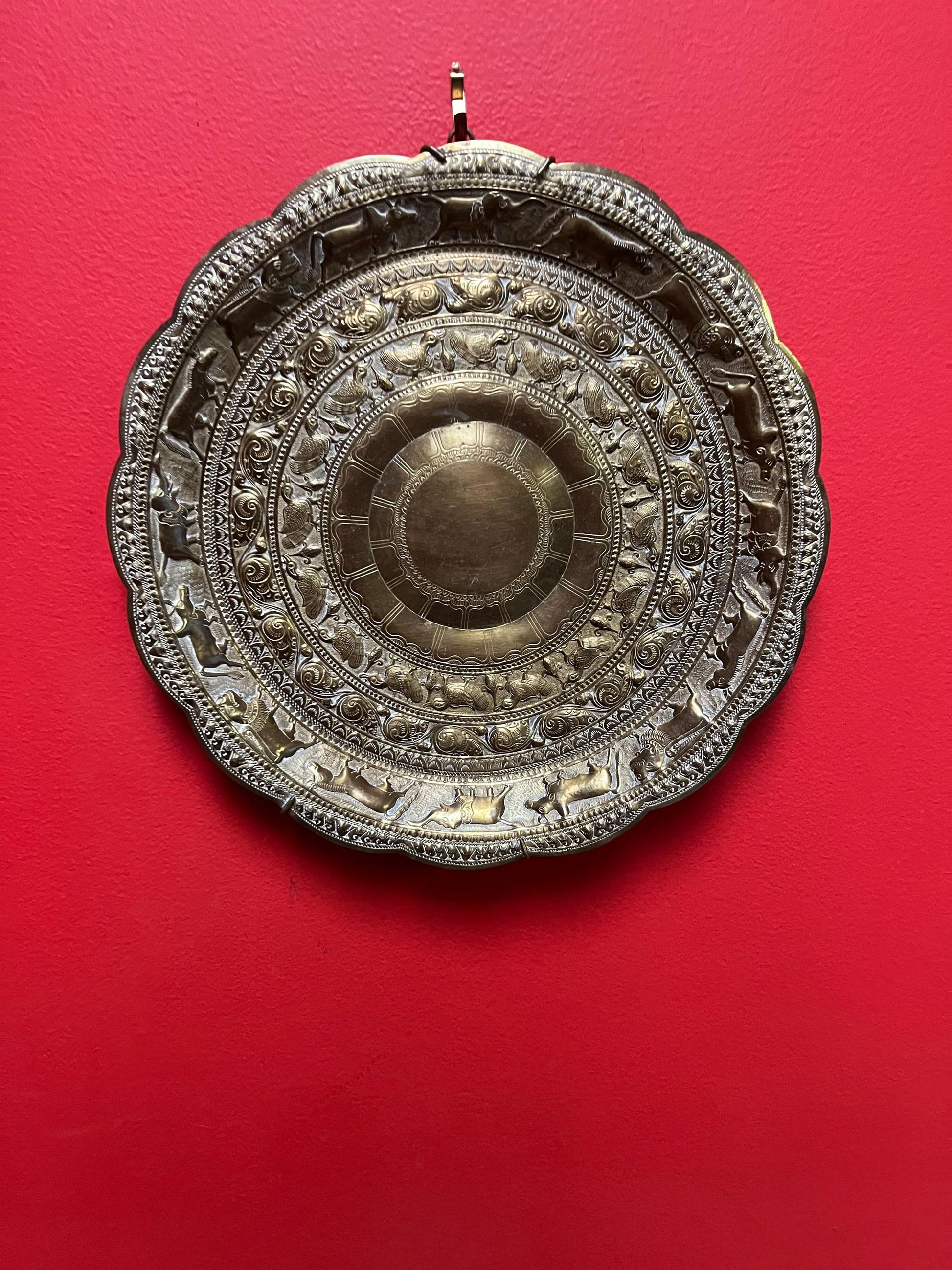 Stunning 12 inch British east Indian hand hammered brass plate charger wonderful detail and ready to hang great value