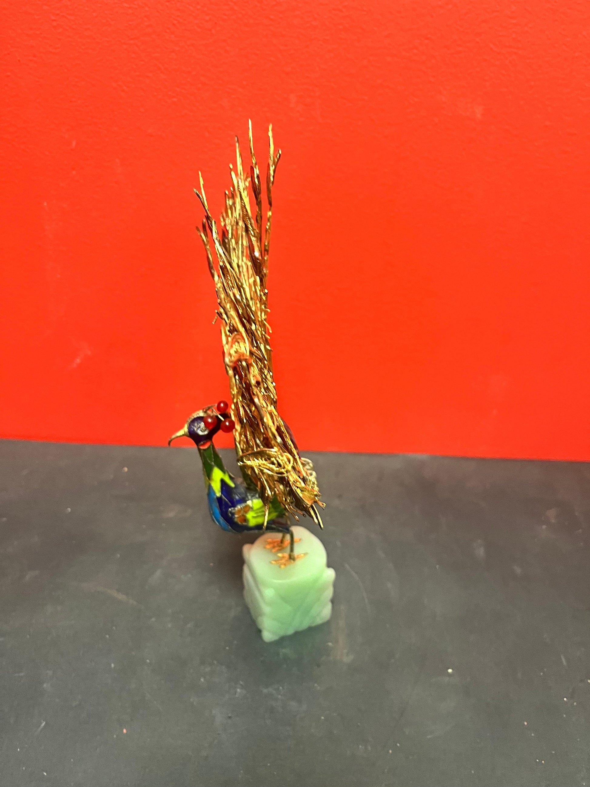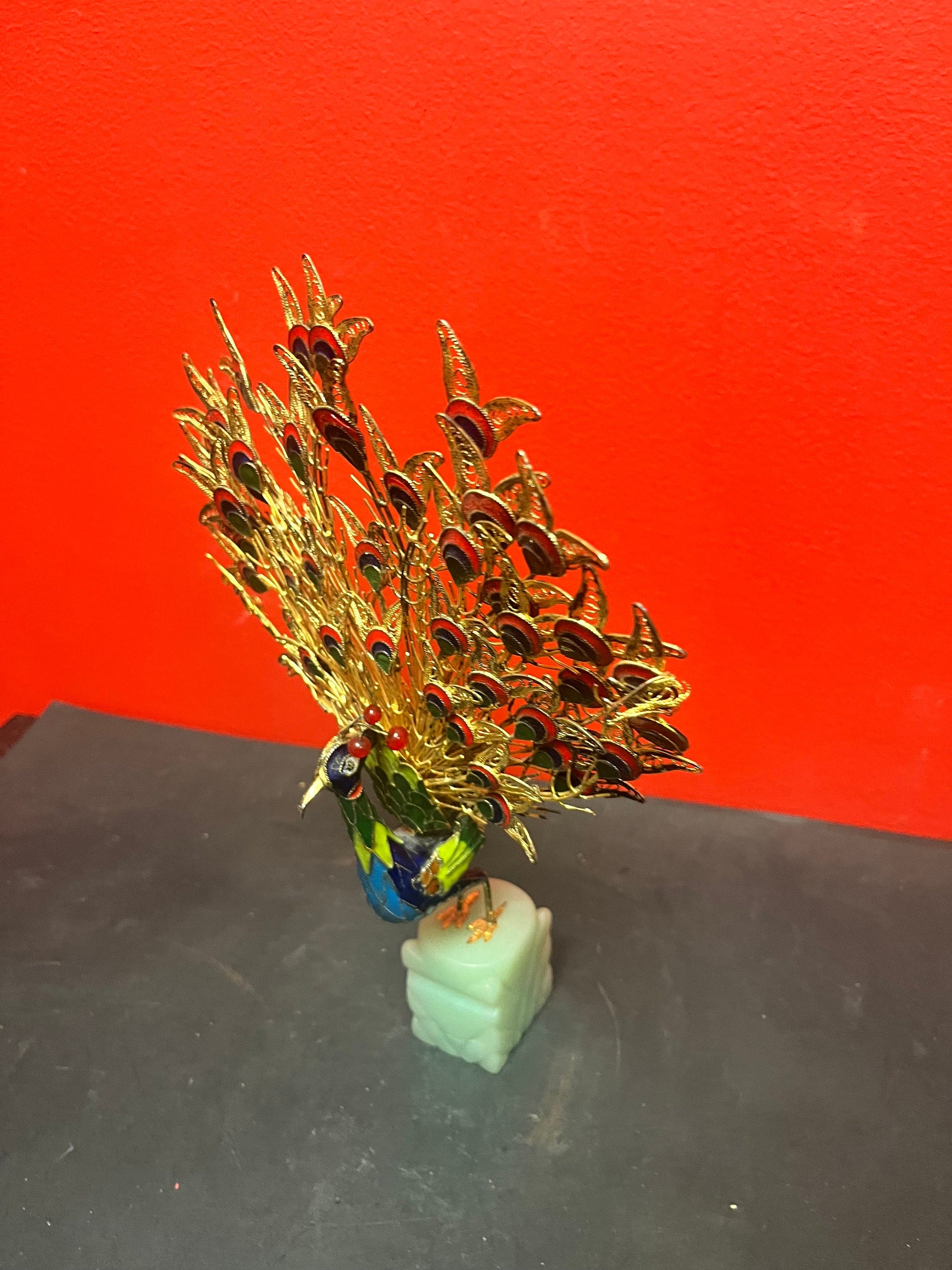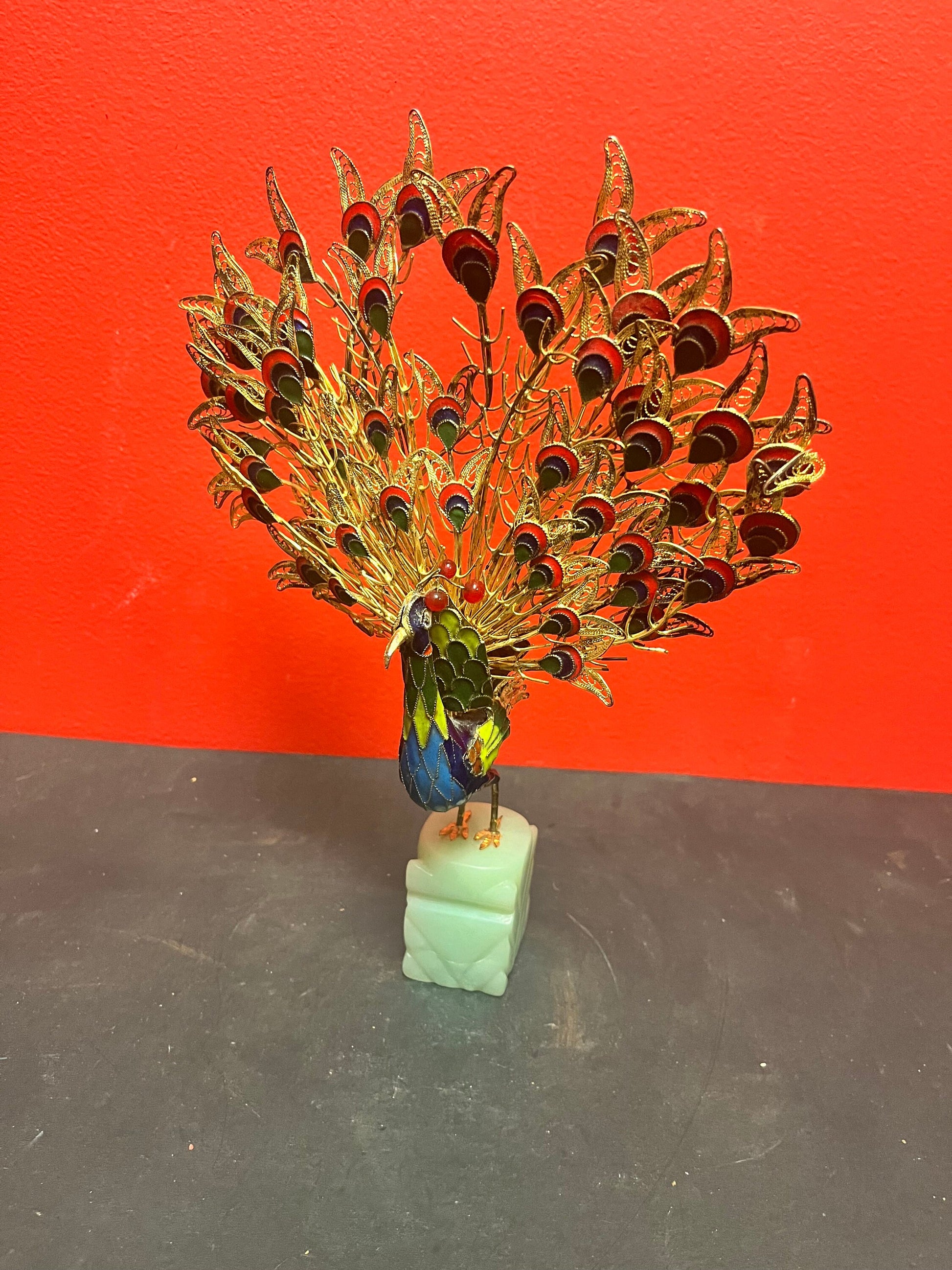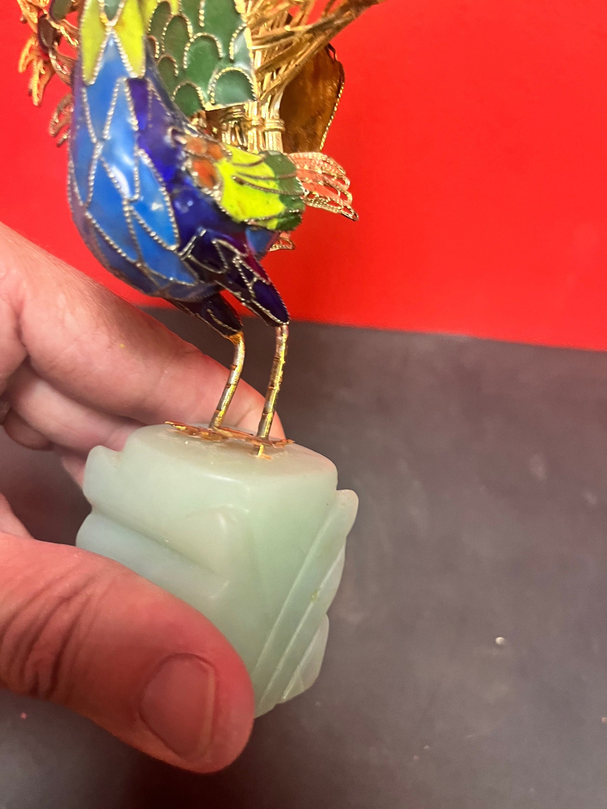 Stunning 12 inch tall Chinese older enamel gold filigree Peacock on Jade stand little loose on base wonderful detailing and condition