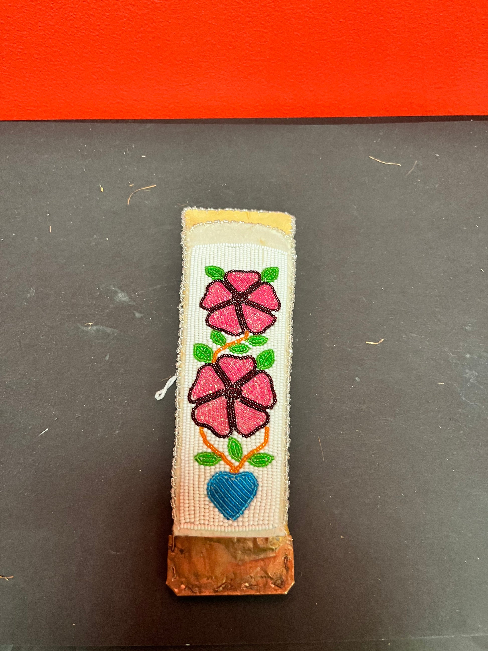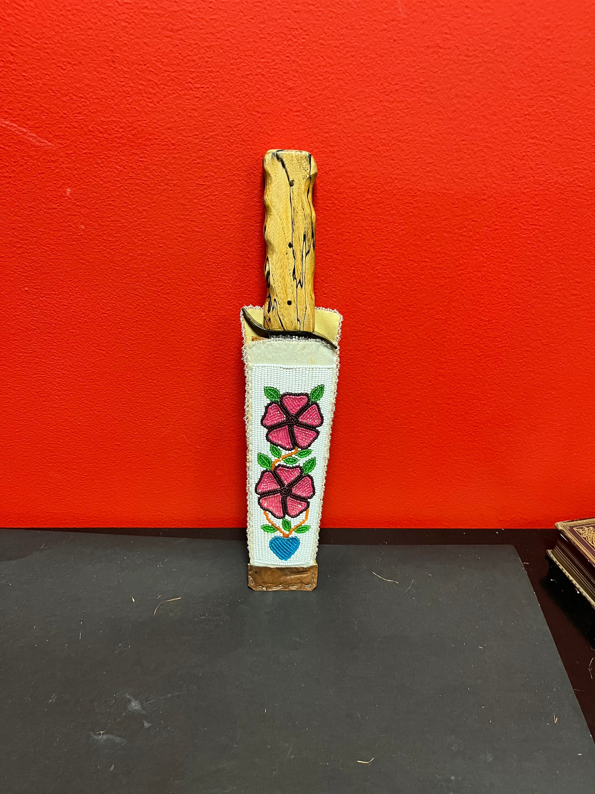 Stunning 14 inch long German knife with wood handle in indigenous west coast, heavily beaded, leather and copper sheaf